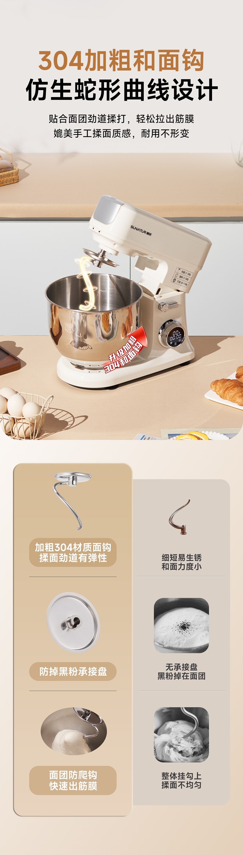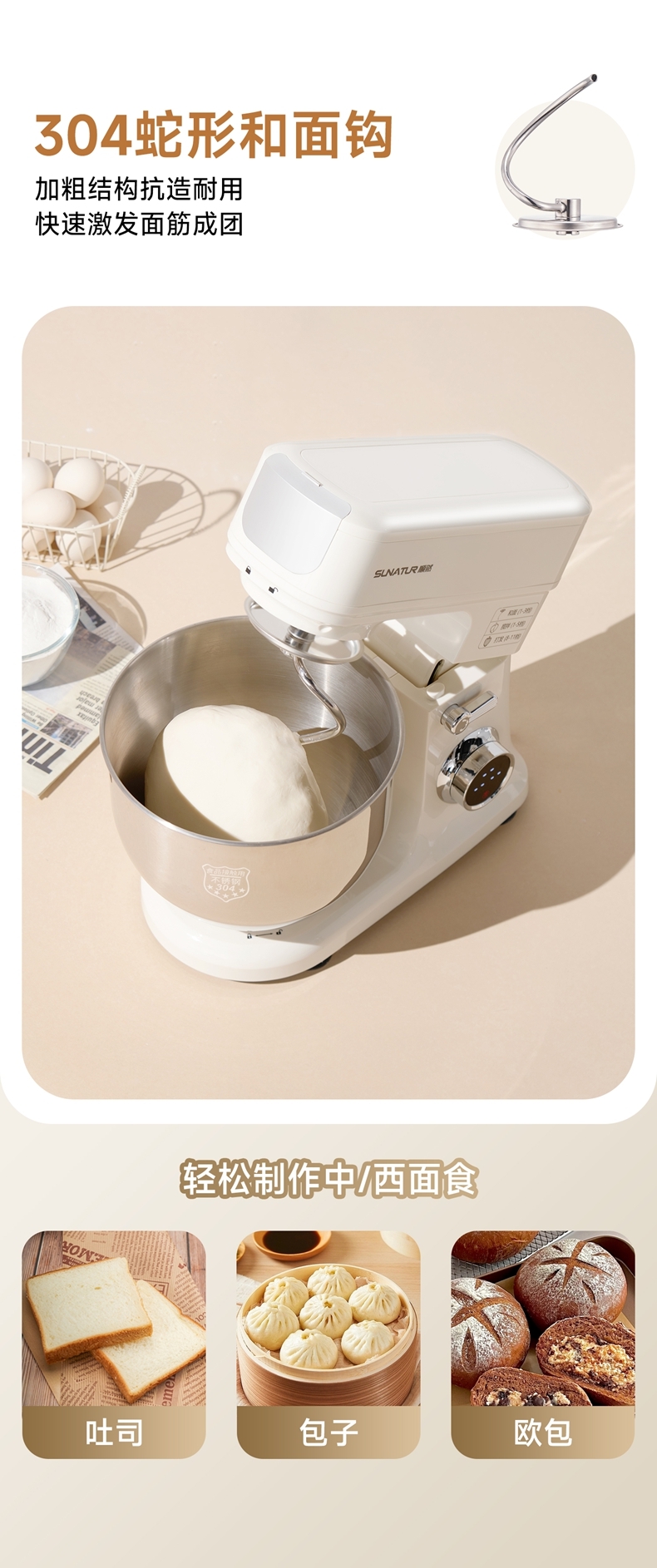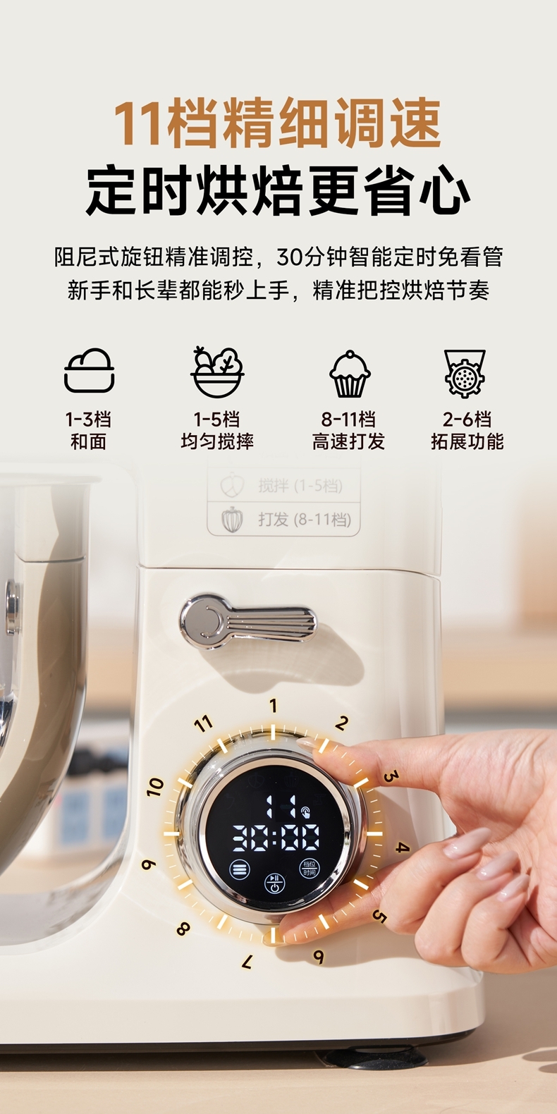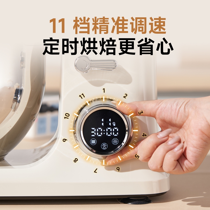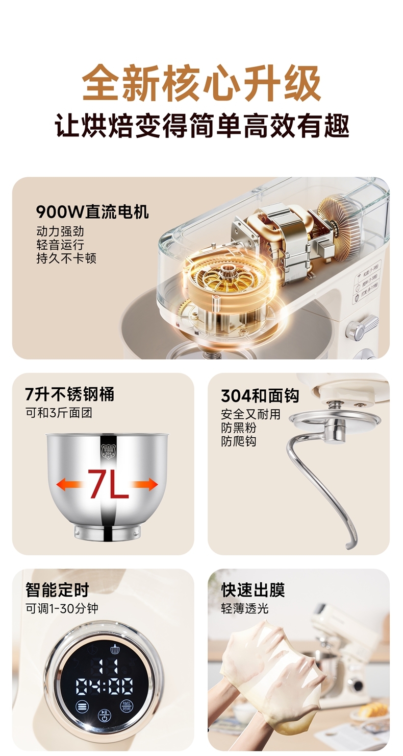 配置清单:900w直流电机高效轻音运行,成团快,轻松出手套膜 7升家用大容量 11档精准调速,满足不同需求, 30分钟定时免看管 3大预设功能,304和面钩,304打蛋笼,搅拌桨配件, 触控屏+旋钮交叉控制 支持扩展接口,配件需另购;