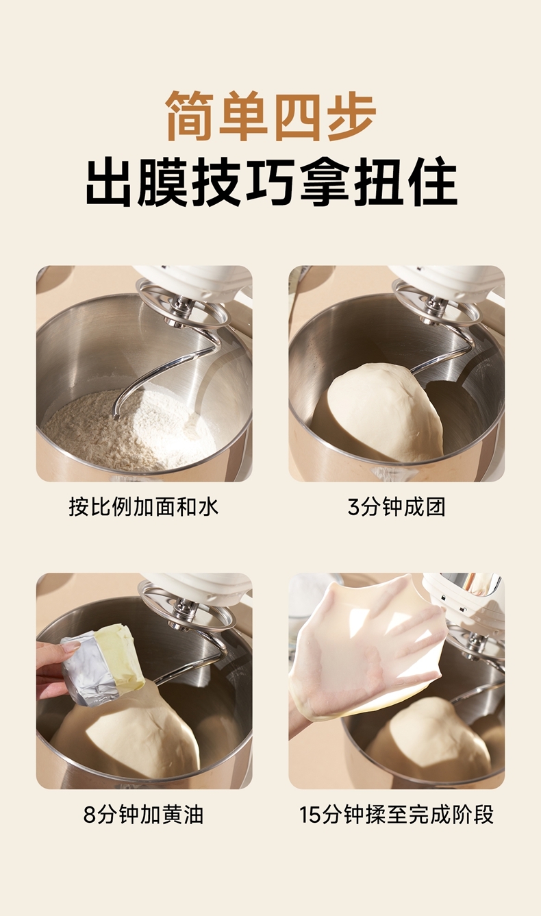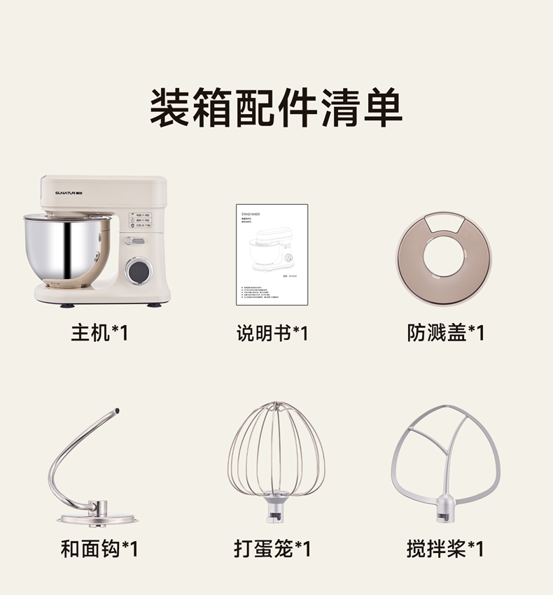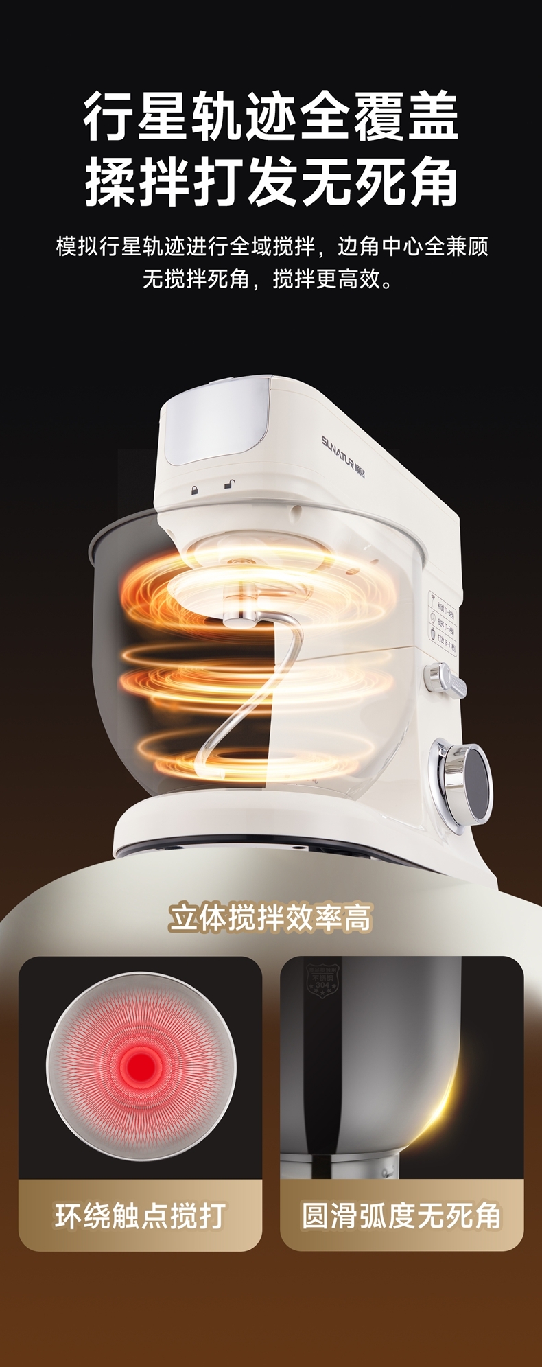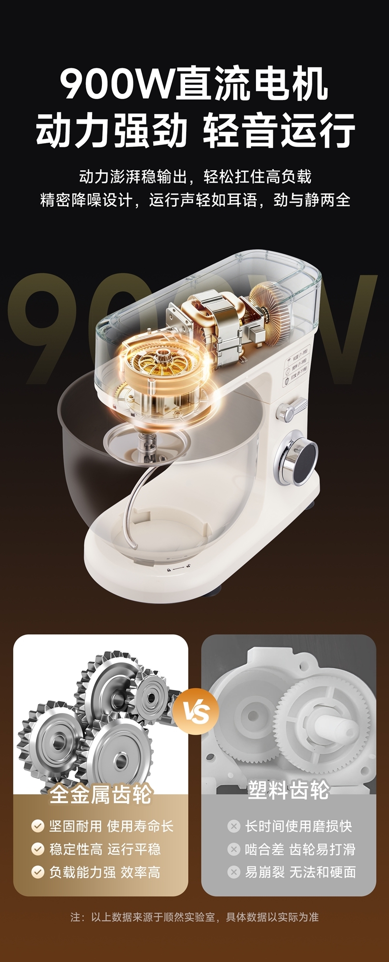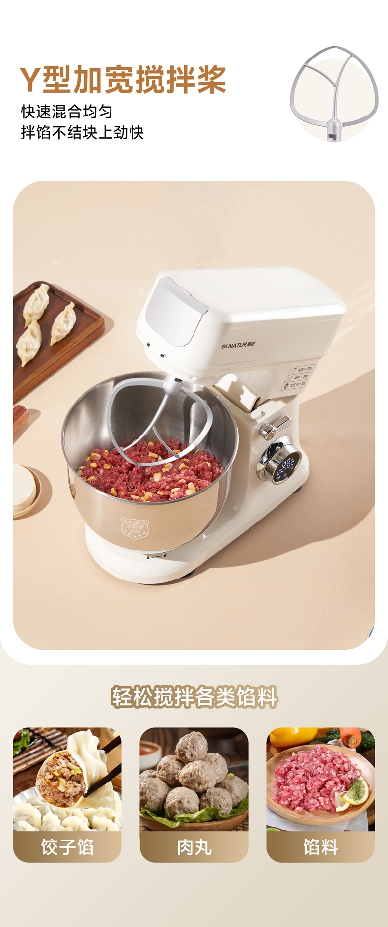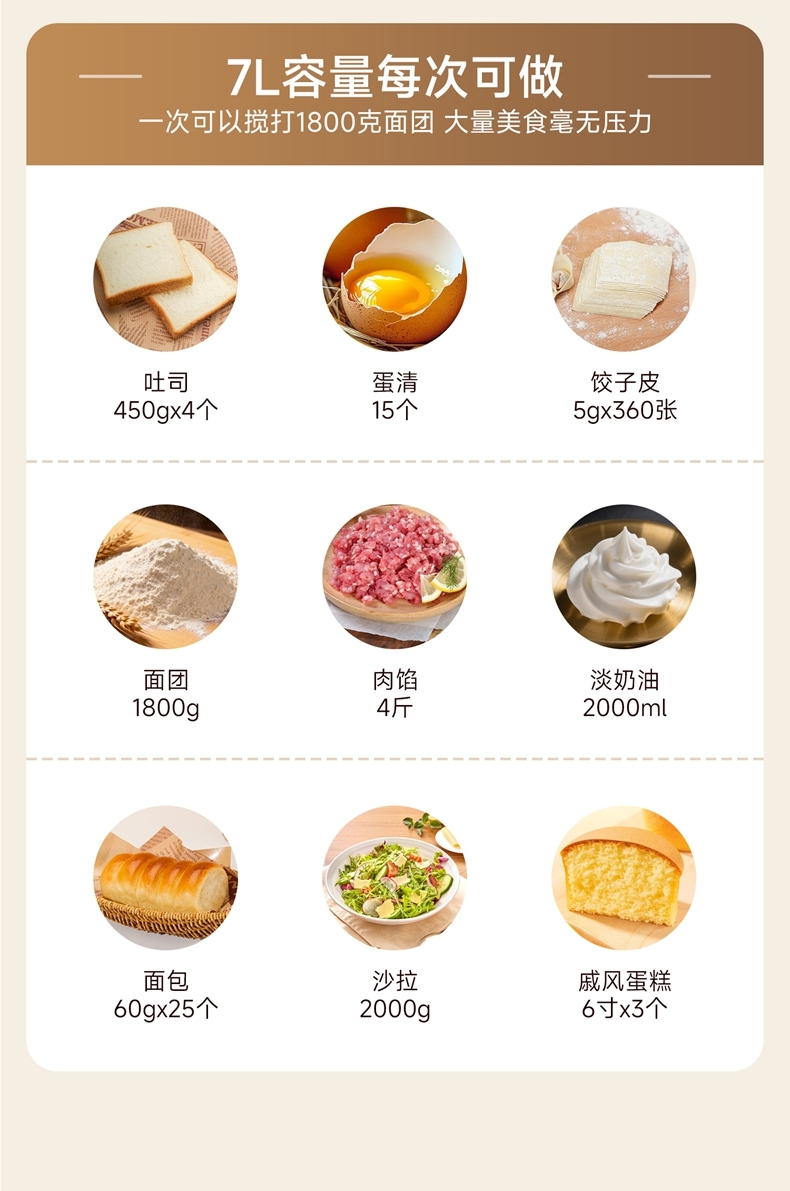 配置清单:900w直流电机高效轻音运行,成团快,轻松出手套膜 7升家用大容量 11档精准调速,满足不同需求, 30分钟定时免看管 3大预设功能,304和面钩,304打蛋笼,搅拌桨配件, 触控屏+旋钮交叉控制 支持扩展接口,配件需另购;