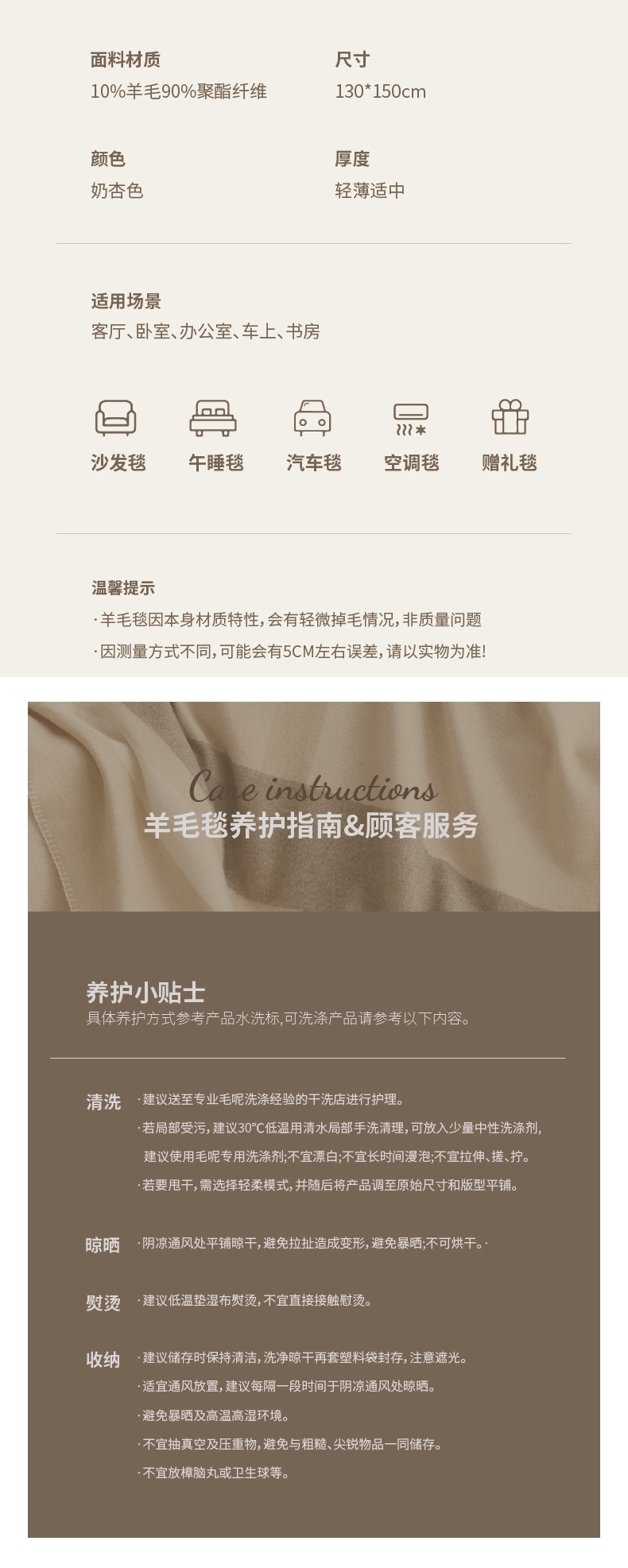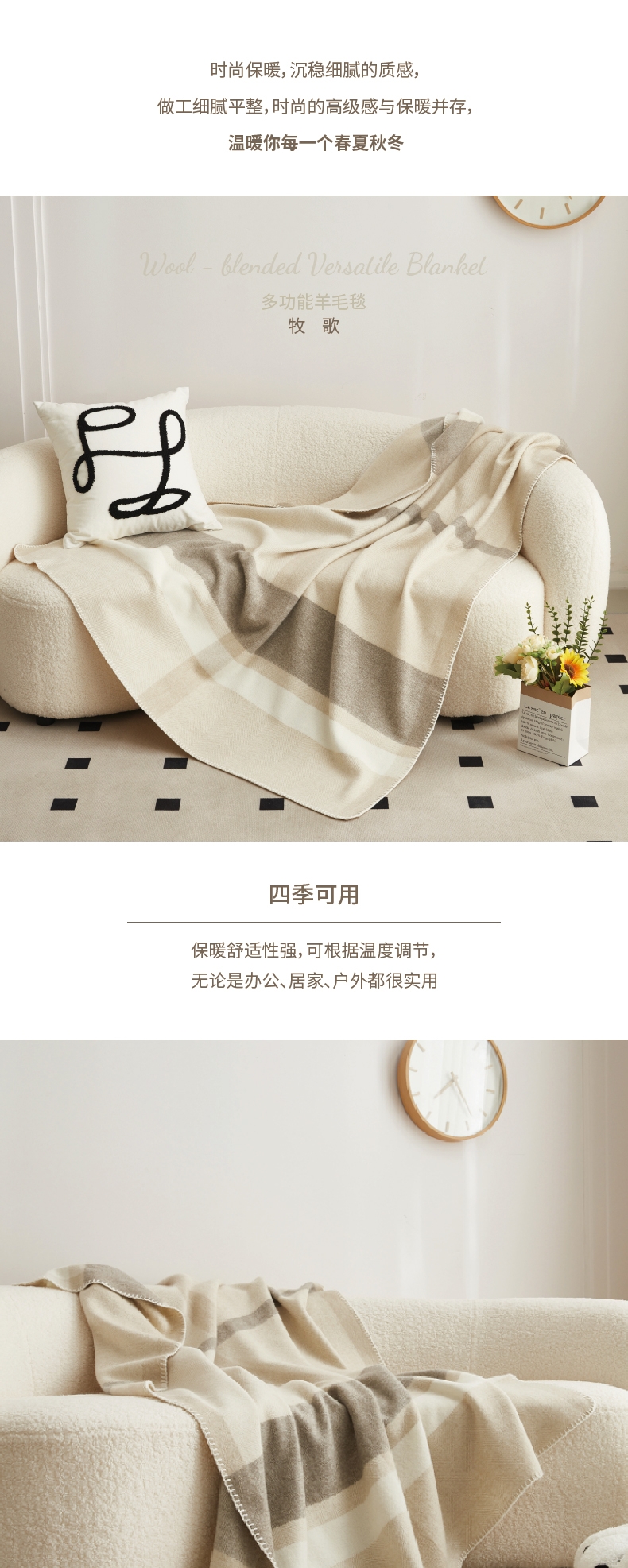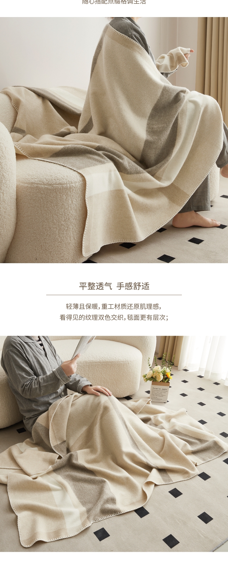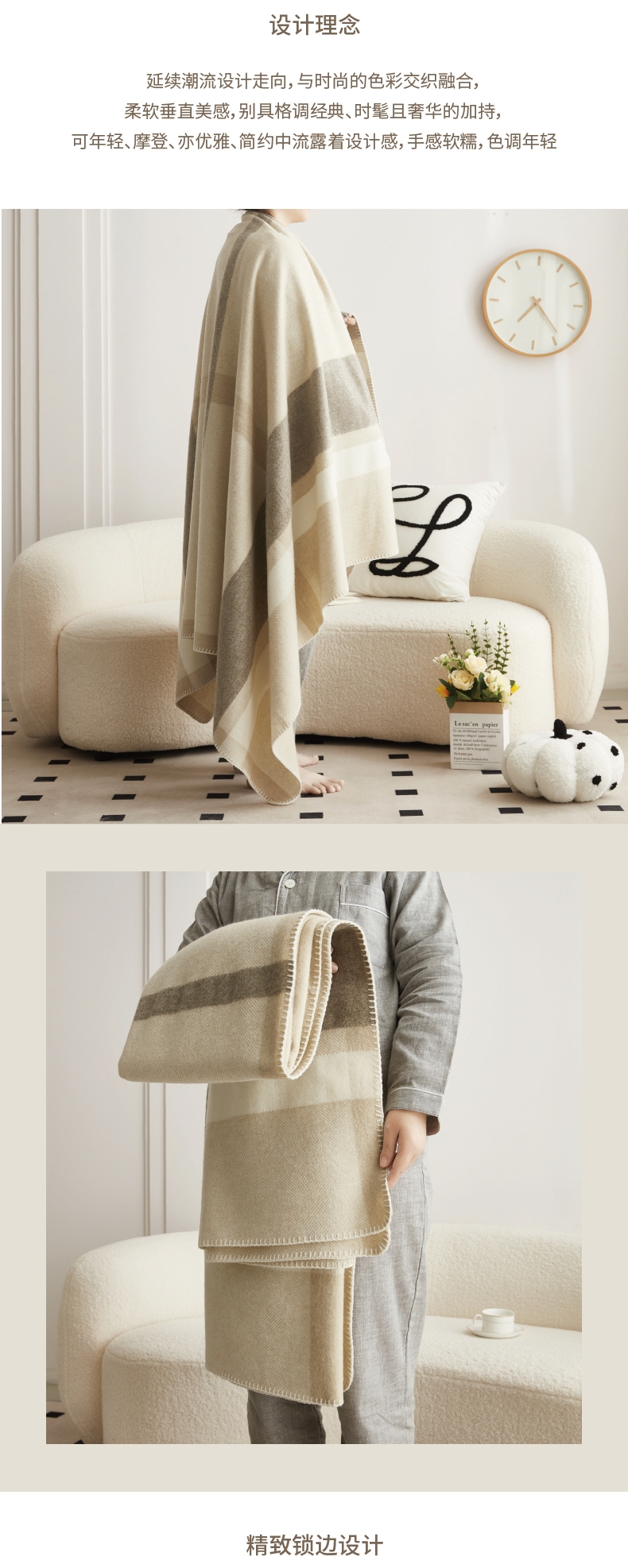 兼具时尚与保暖,沉稳细腻的质感,做工细腻平整;时尚的高级感与保暖并存,温暖你每一个春夏秋冬。;选用高品质澳洲羊毛 ,大自然赋予小绵羊的基因特性;有保暖隔热和天然调节功能 ;是盖毯,亦是披肩,轻巧便携,一毯多用长久陪伴的温暖