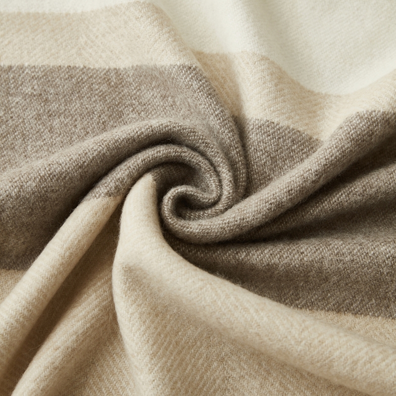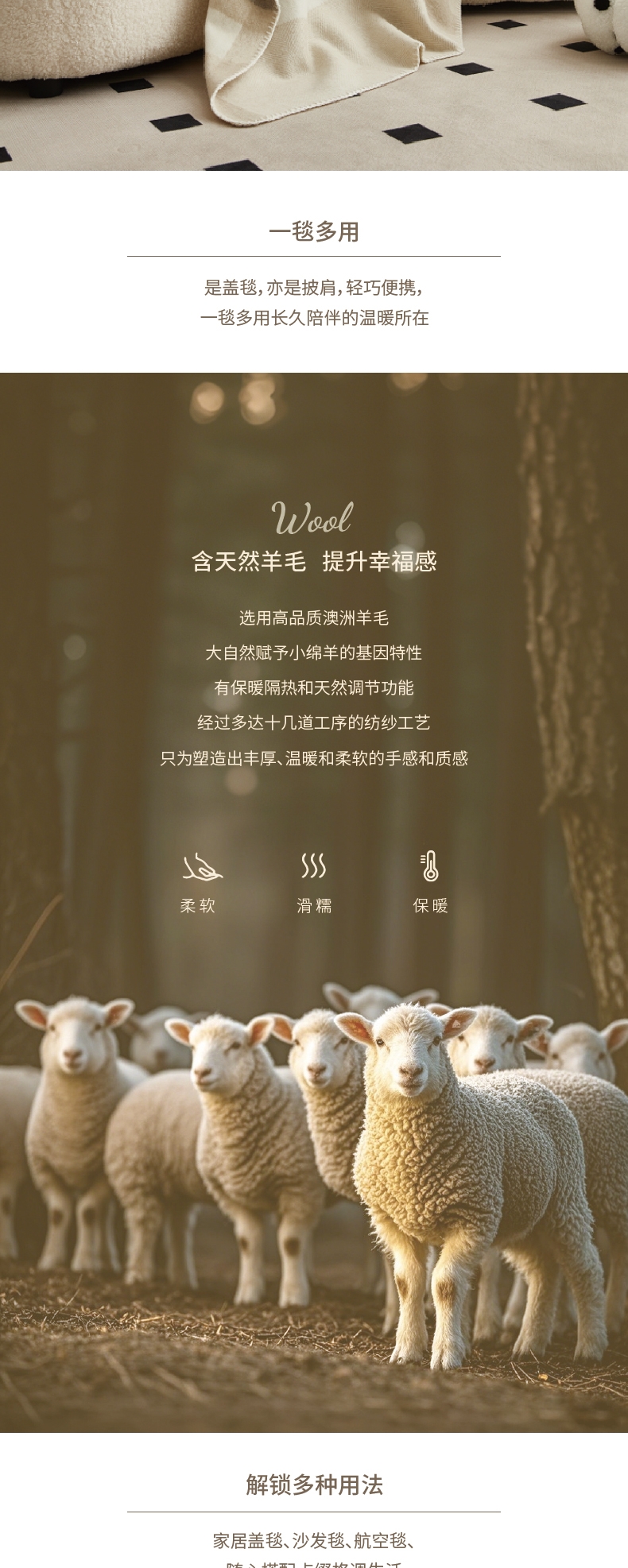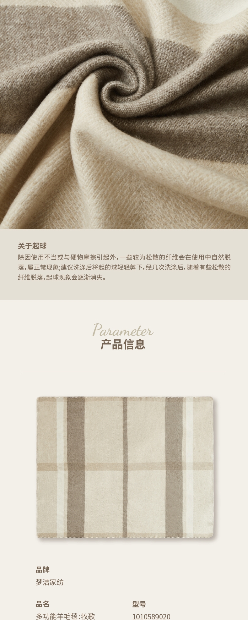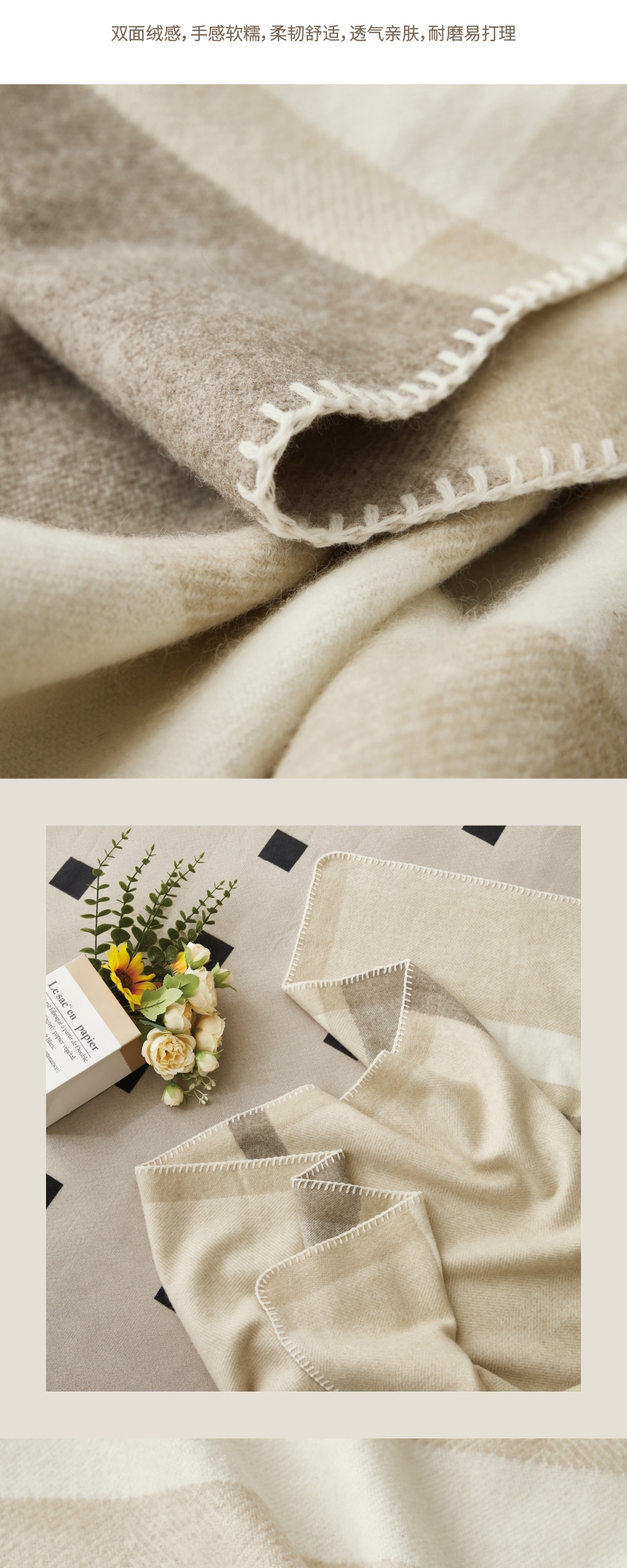 兼具时尚与保暖,沉稳细腻的质感,做工细腻平整;时尚的高级感与保暖并存,温暖你每一个春夏秋冬。;选用高品质澳洲羊毛 ,大自然赋予小绵羊的基因特性;有保暖隔热和天然调节功能 ;是盖毯,亦是披肩,轻巧便携,一毯多用长久陪伴的温暖