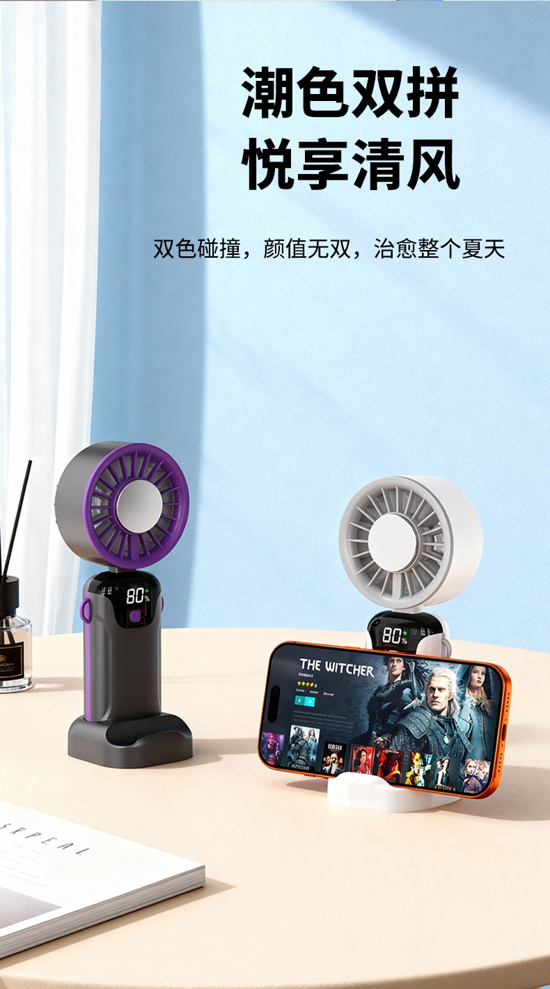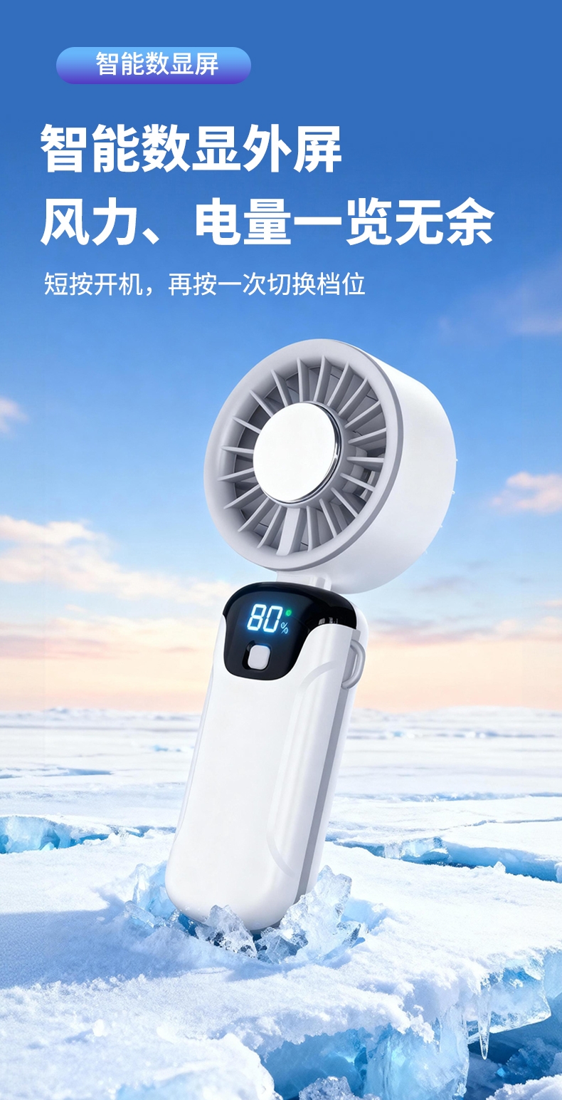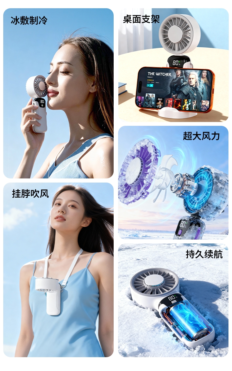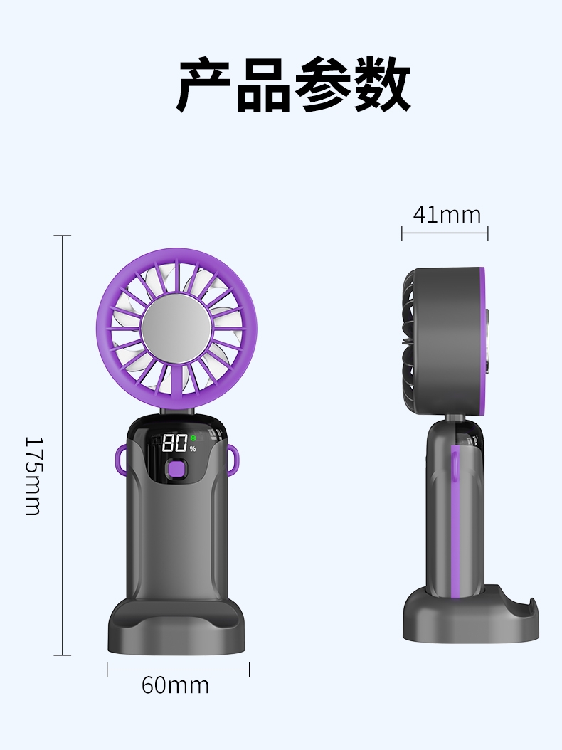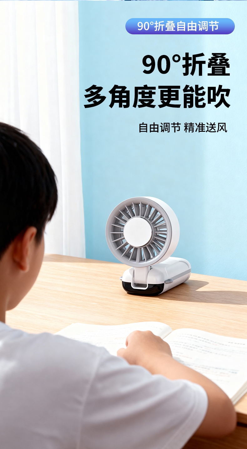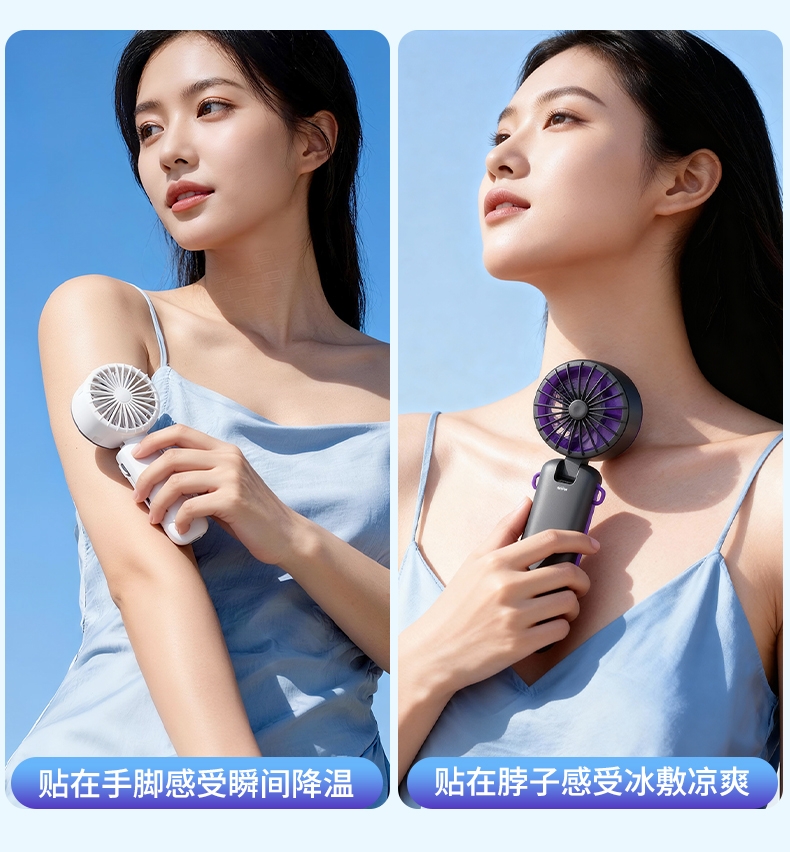手持便携,支架稳固,一机多用;小巧便携,体积轻便,随手可带,不占空间;强力降温,快速送风,带来清凉体感