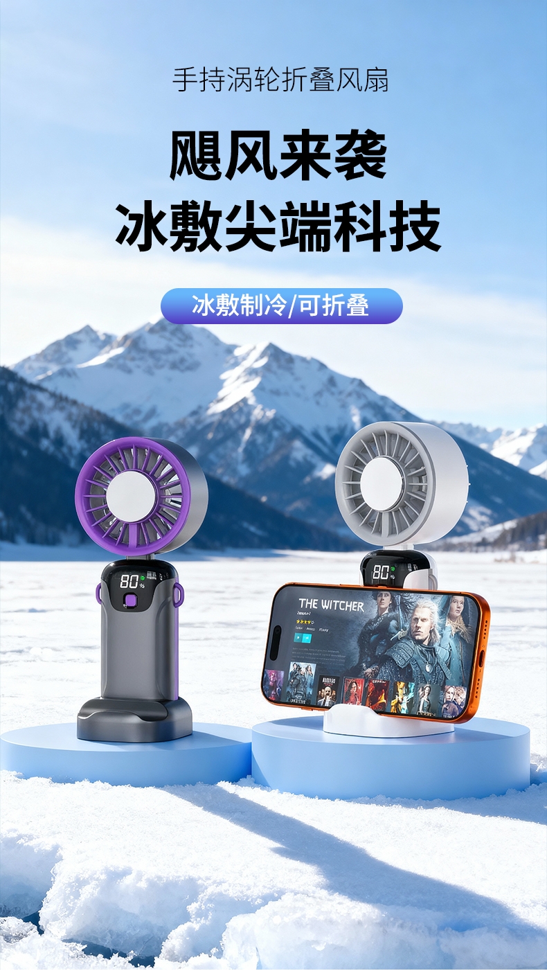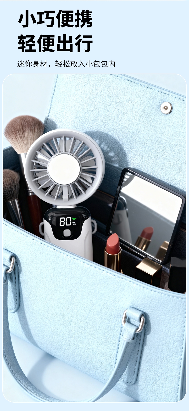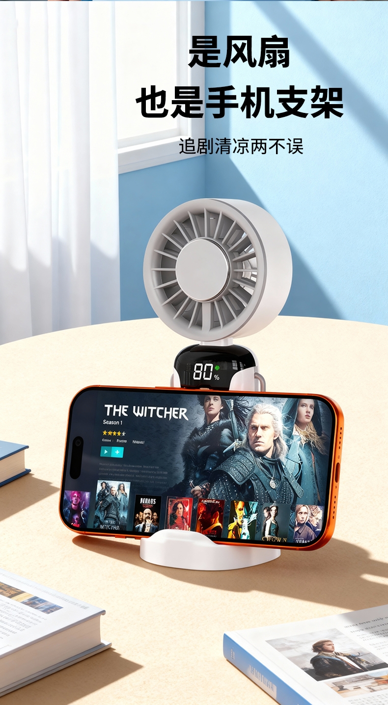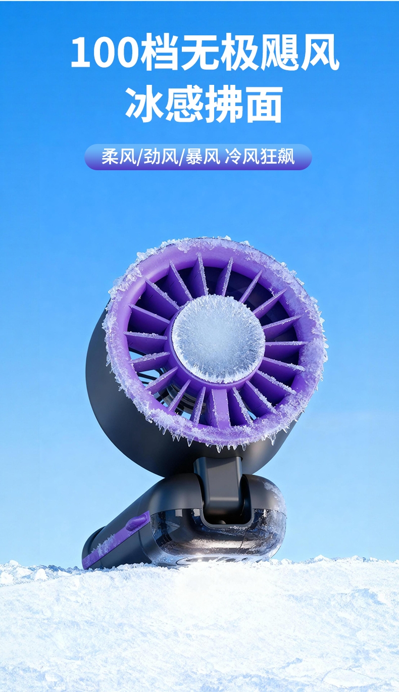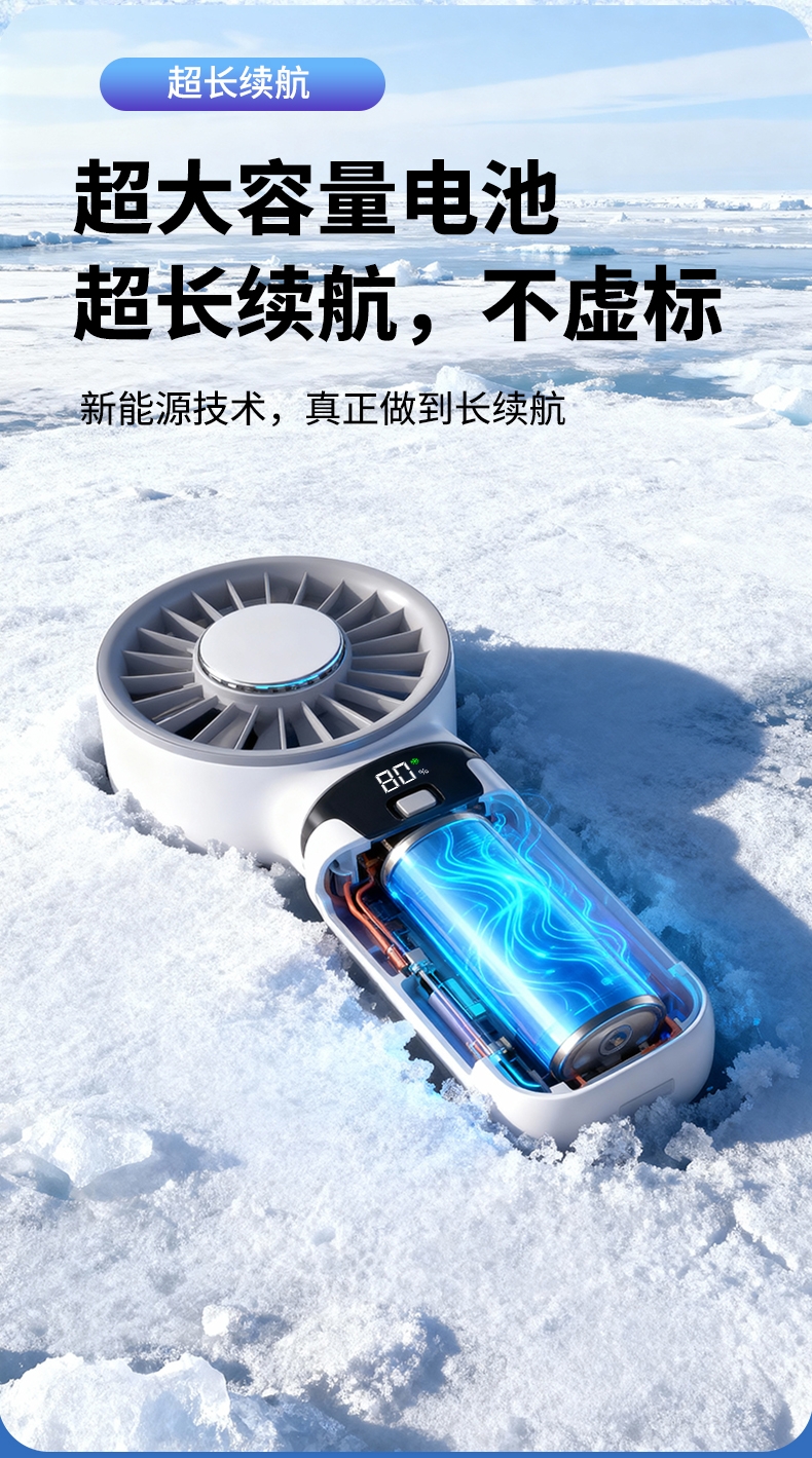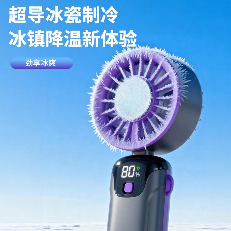 手持便携,支架稳固,一机多用;小巧便携,体积轻便,随手可带,不占空间;强力降温,快速送风,带来清凉体感