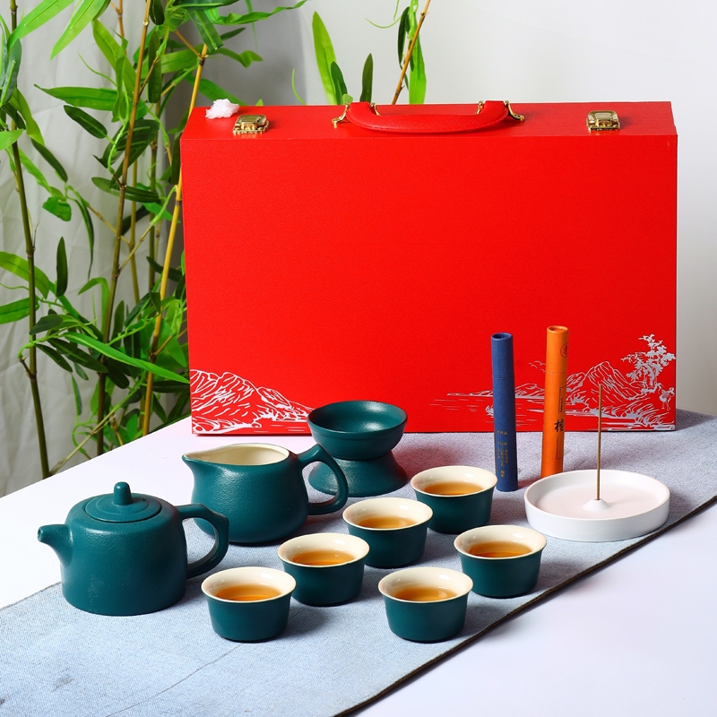 红色礼盒绿色茶具