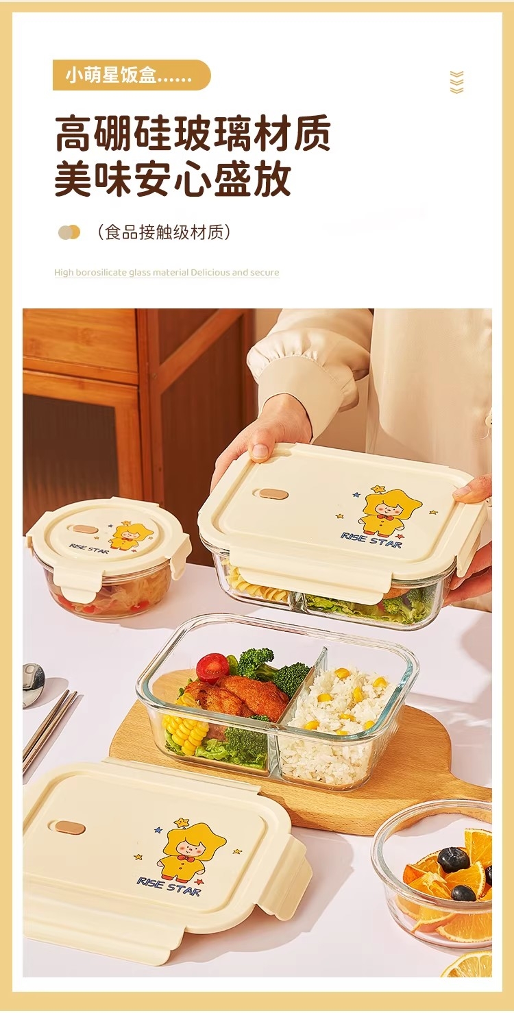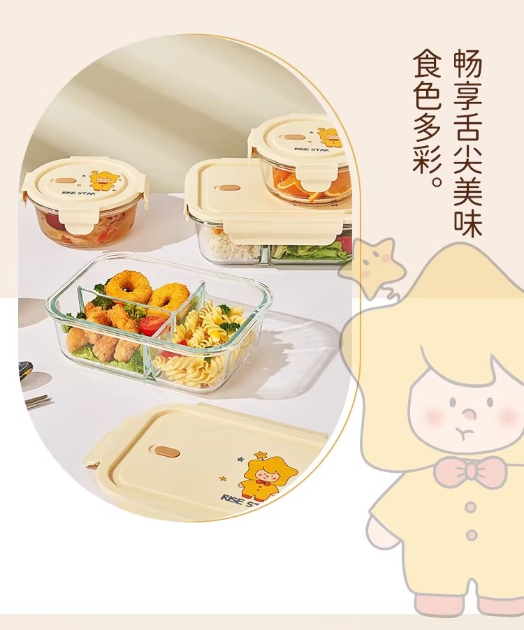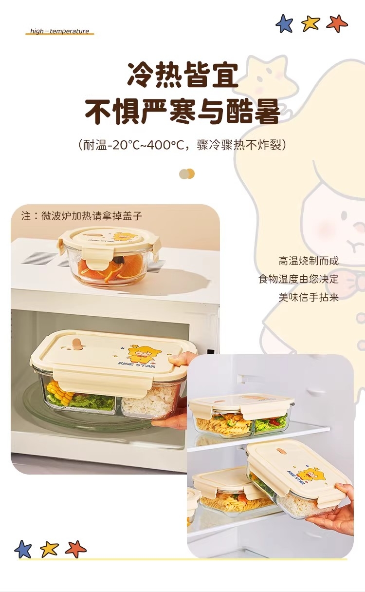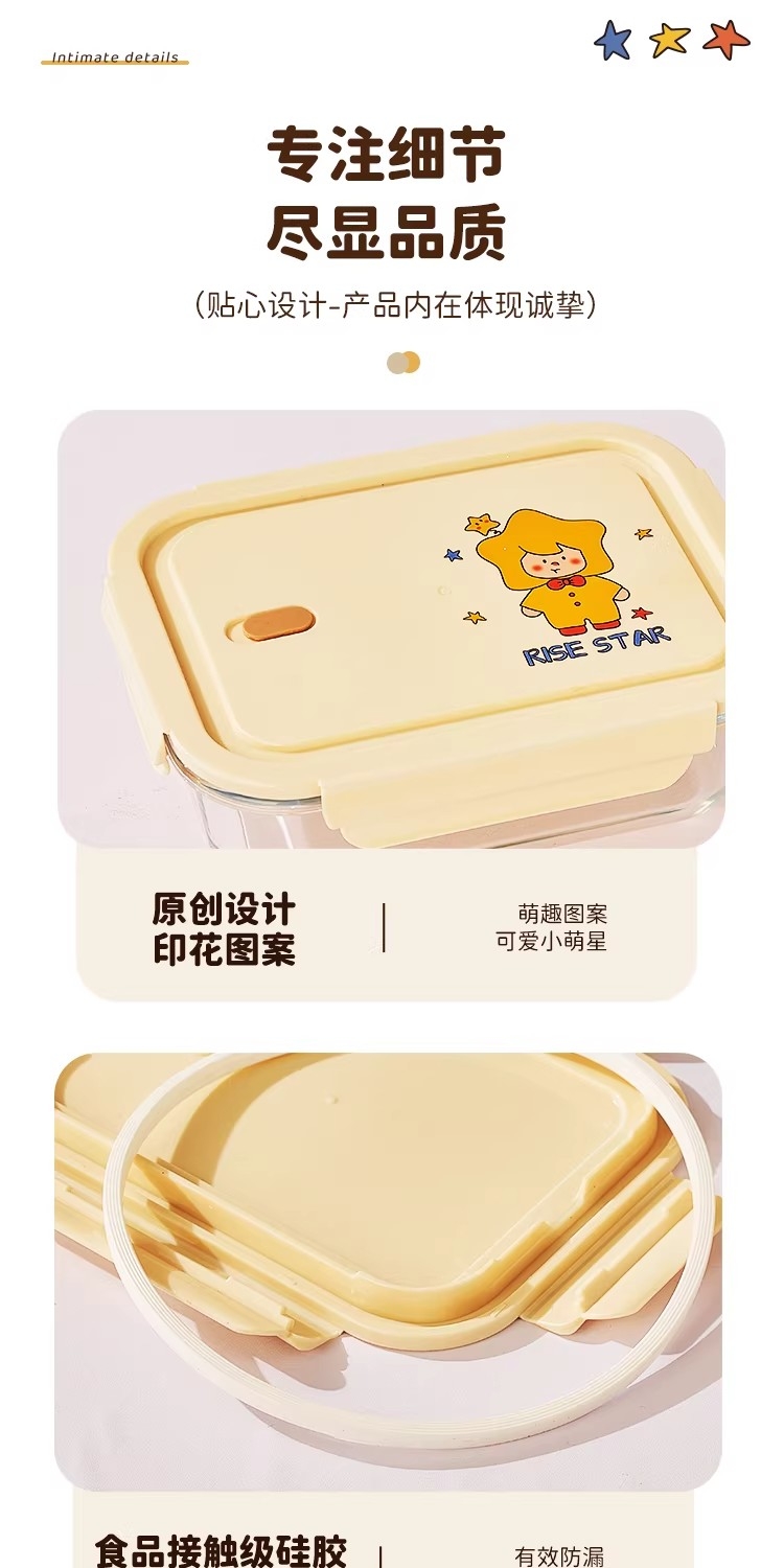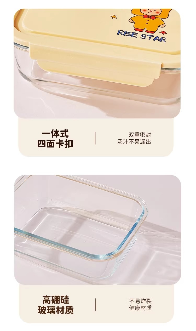 高硼硅耐热玻璃,可微波加热可冰箱冷藏;加厚密封胶圈,卡扣盖子,密封不漏;独家萌趣卡通设计,超高颜值