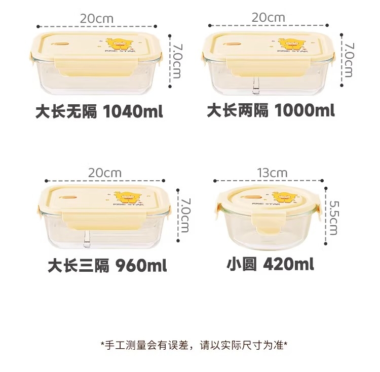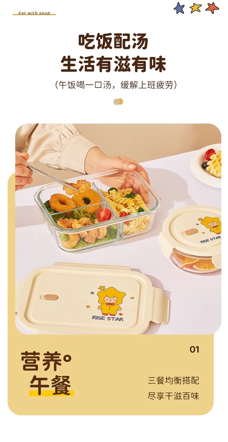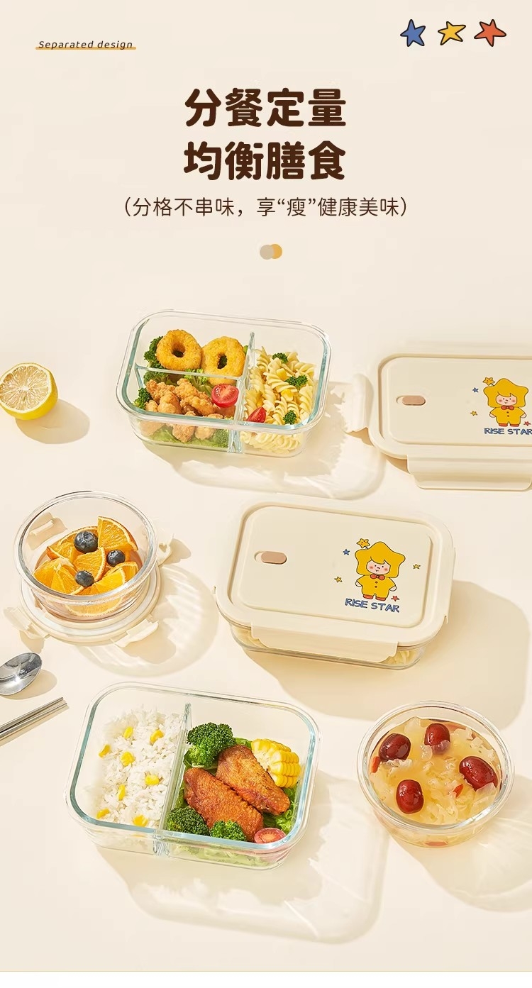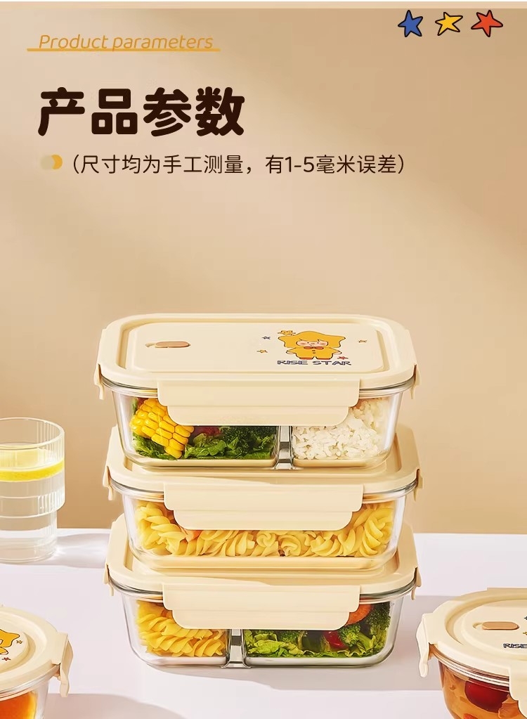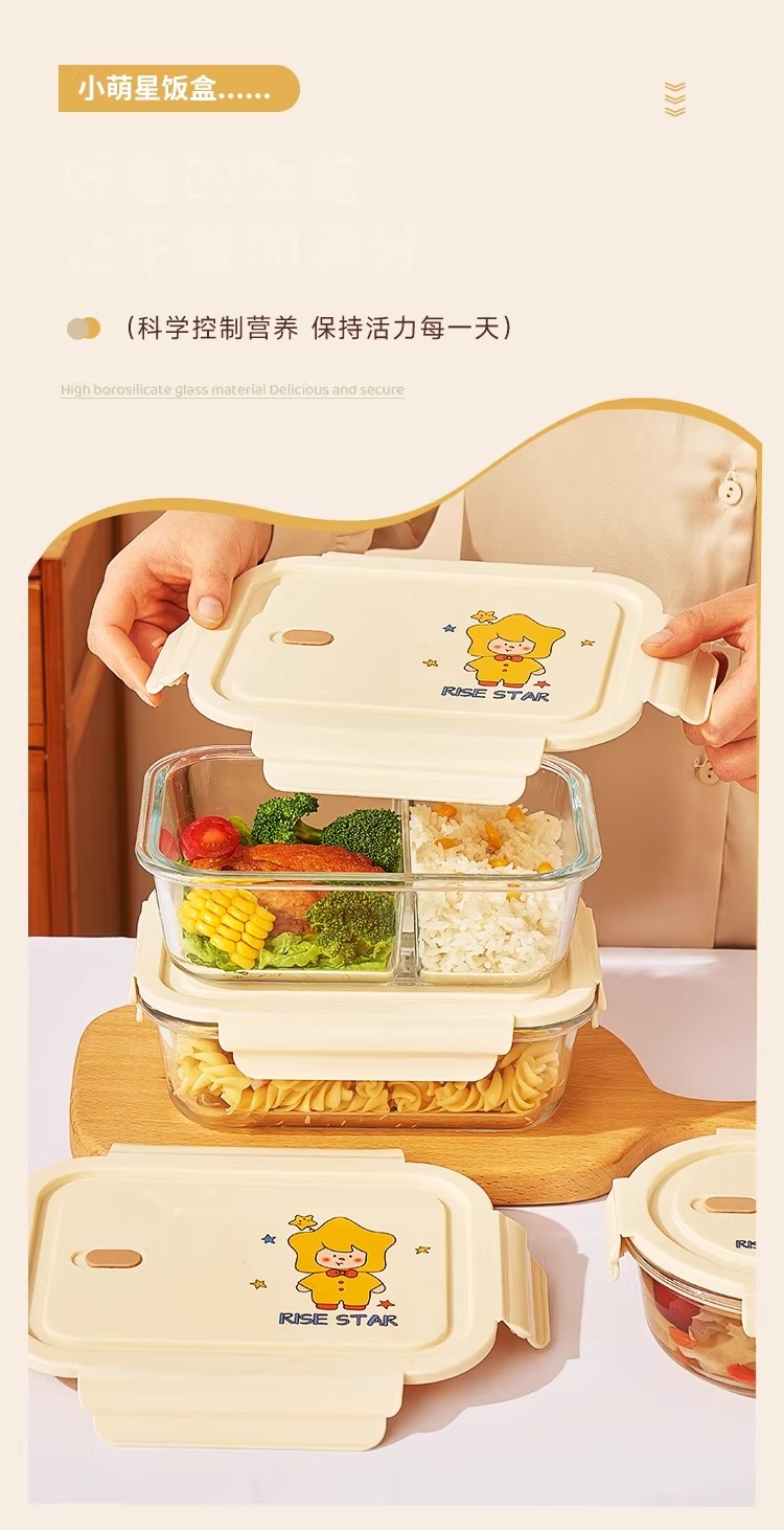 高硼硅耐热玻璃,可微波加热可冰箱冷藏;加厚密封胶圈,卡扣盖子,密封不漏;独家萌趣卡通设计,超高颜值
