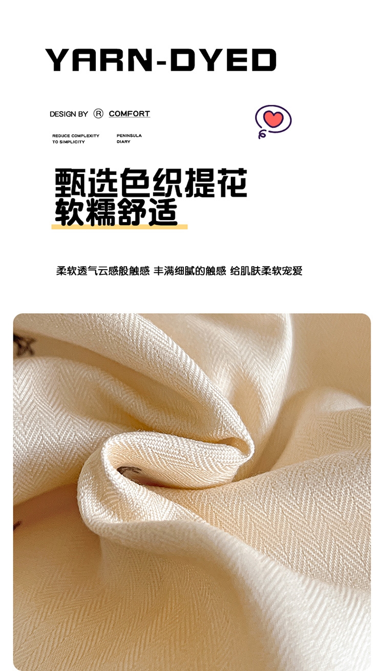 甄选色织提花软糯舒适 柔软透气云感般触感丰满细腻;高支高密织造云朵般享受,给肌肤柔软宠爱;面料柔软舒适耐磨耐用 不易起球