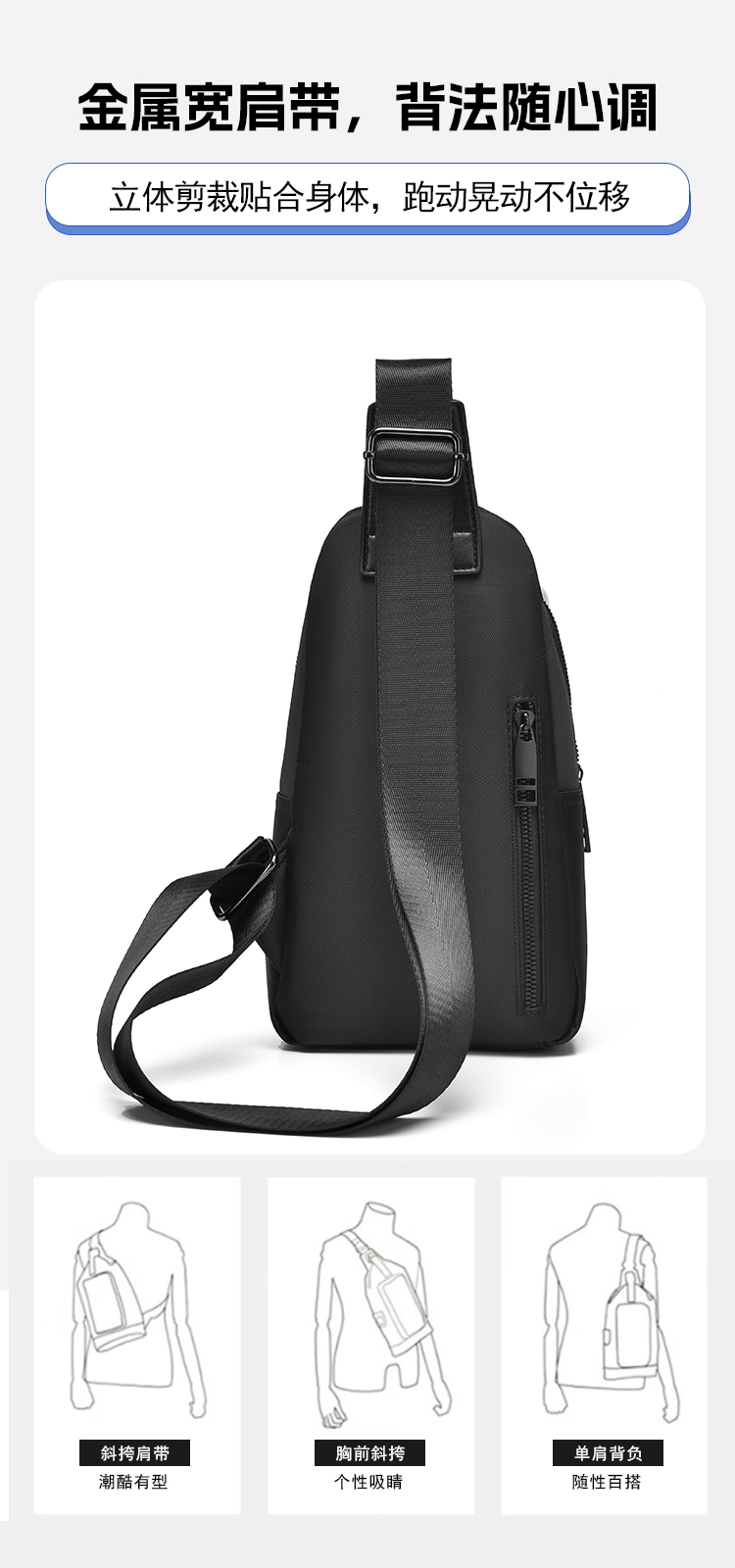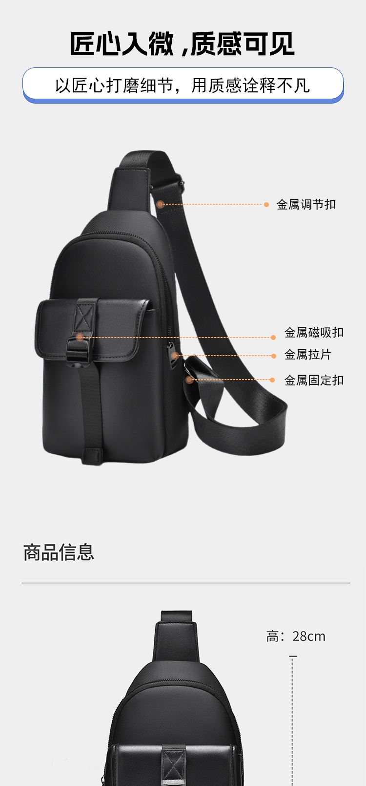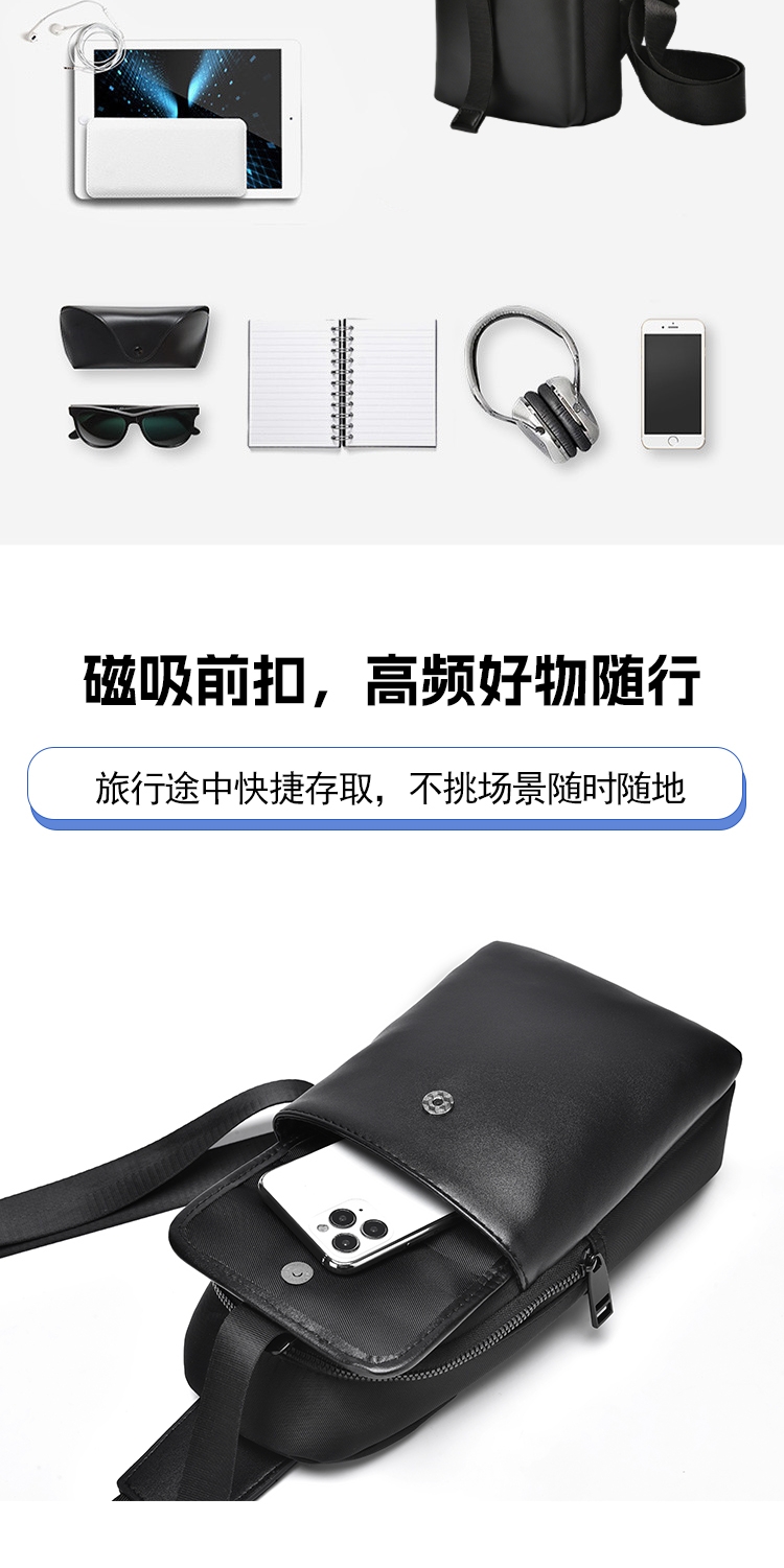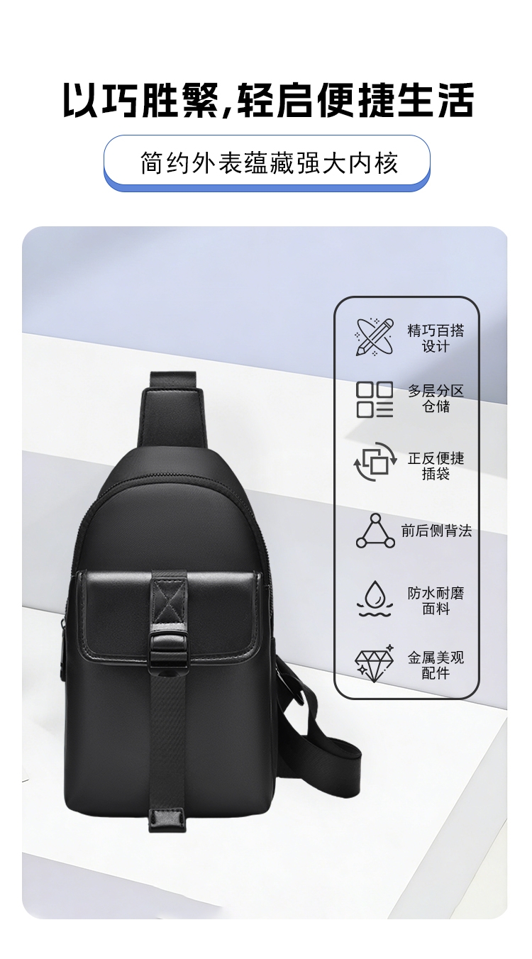 小而有范轻潮有型,零感贴身百搭出行;合理空间科学布局,解放双手一包搞定;高密牛津防水材质,柔韧轻盈防刮耐磨;多仓分区收纳有序,随时随地存取便捷;人体工学肩带设计,多种背法自由选择