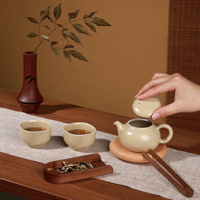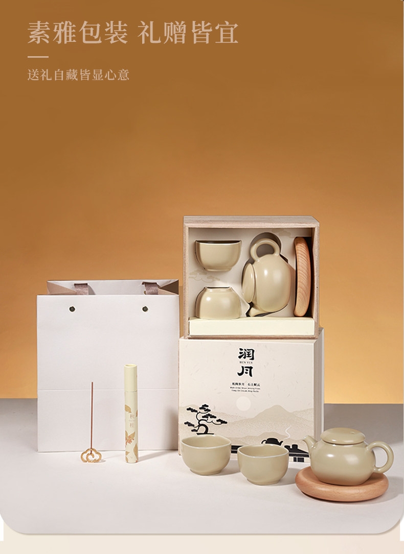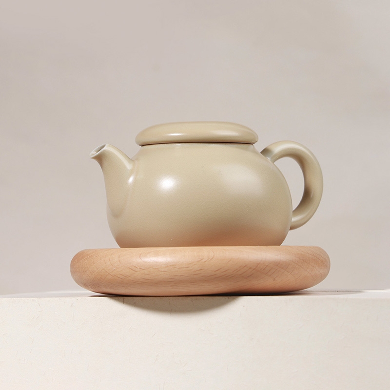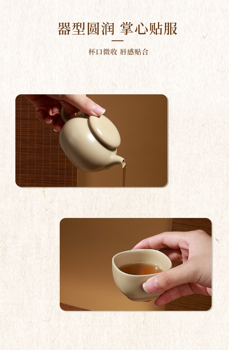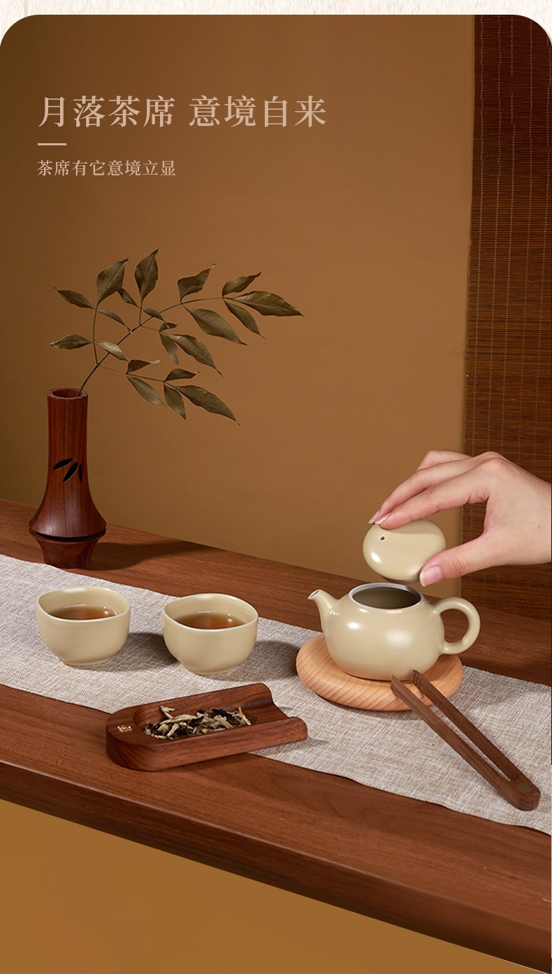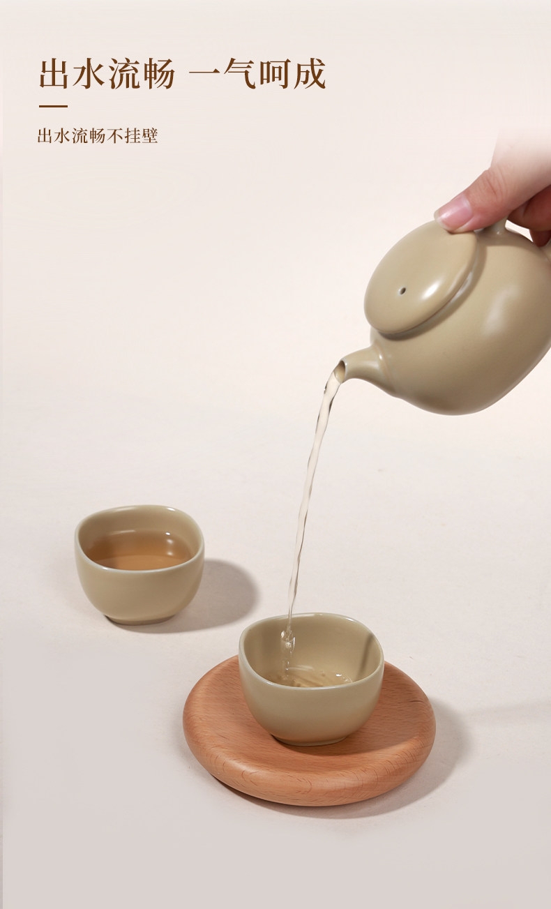壶型圆润如月,流嘴弧线轻展;木灰釉自带的哑光质感,让茶汤色泽更显温润;杯身敛口收腰,捧在掌心恰如掬一弯新月