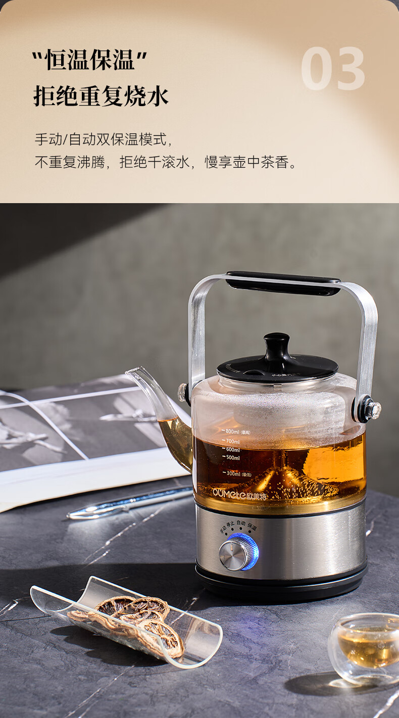 全新升级萃取网-- 更易清洗,煮茶口感好;经典怀旧铝合金大提梁手柄。送父母,送长辈,满满的都;手工打造经典出水嘴,出水流畅,美感足;耐热玻璃,冷热不爆裂。随时欣赏煮茶过程;传统煮茶方式与现代工艺融合,享受新的饮茶感受