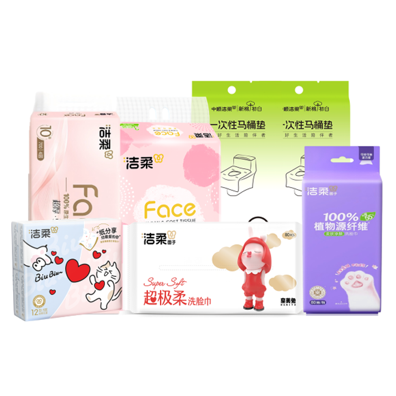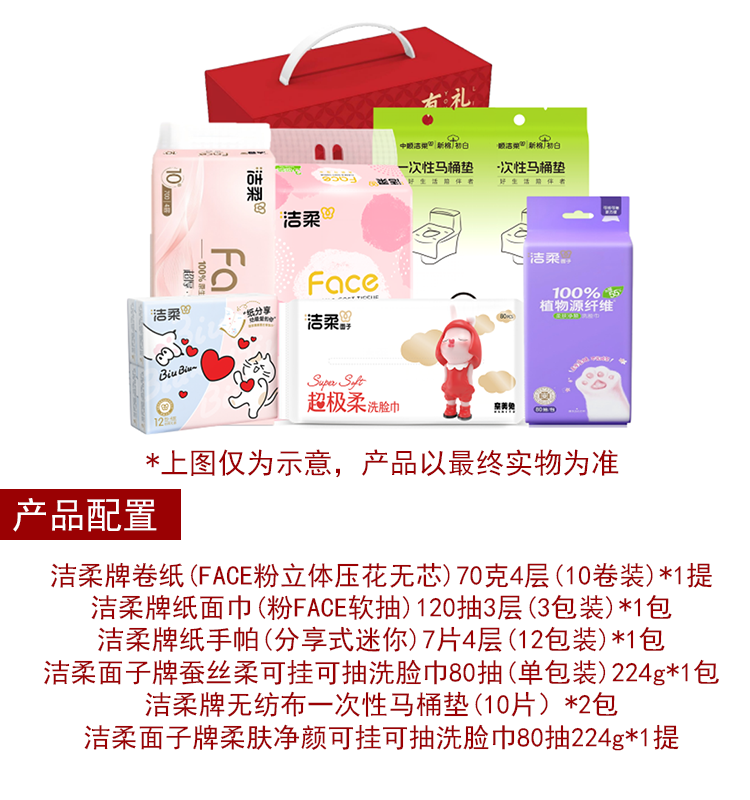 配置:洁柔牌卷纸(FACE粉立体压花无芯)70克4层(10卷装)*1提 洁柔牌纸面巾(粉FACE软抽)120抽3层(3包装)*1包 洁柔牌纸手帕(分享式迷你)7片4层(12包装)*1包 洁柔面子牌蚕丝柔可挂可抽洗脸巾80抽(单包装)224g*1包 洁柔牌无纺布一次性马桶垫(10片)*2包 洁柔面子牌柔肤净颜可挂可抽洗脸巾80抽224g*1提