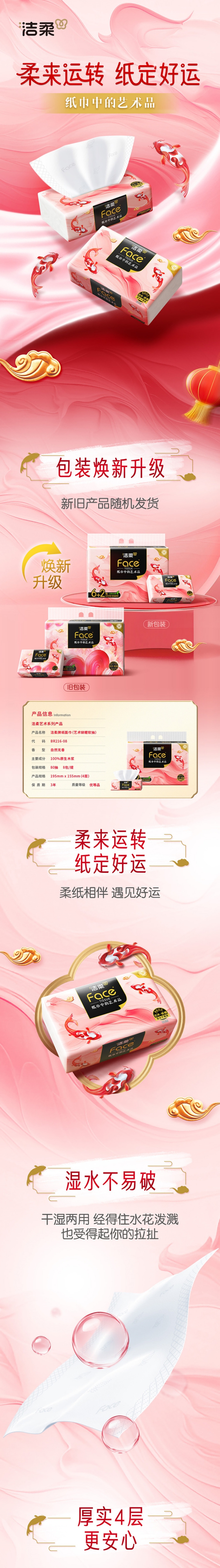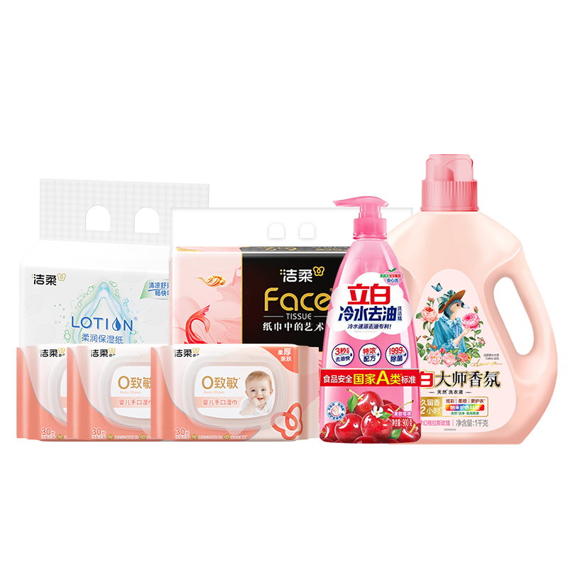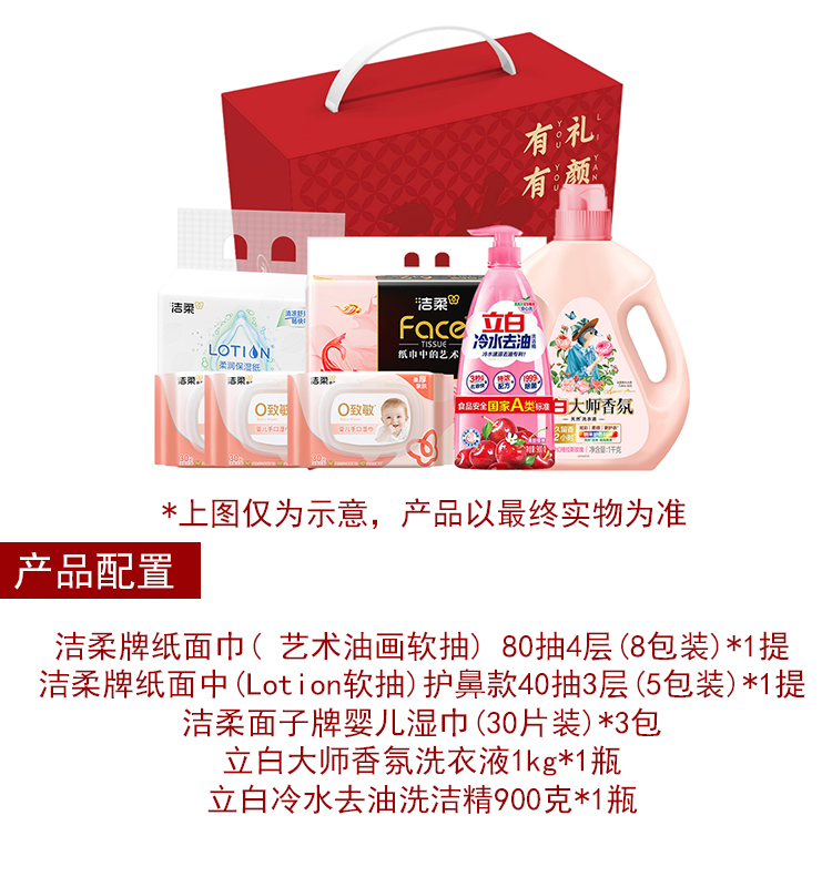 配置:洁柔牌纸面巾( 艺术油画软抽) 80抽4层(8包装)*1提 洁柔牌纸面中(Lotion软抽)护鼻款40抽3层(5包装)*1提 洁柔面子牌婴儿湿巾(30片装)*3包 立白大师香氛洗衣液1kg*1瓶 立白冷水去油洗洁精900克*1瓶 有礼有颜礼盒:1个(35*16.5*33cm)