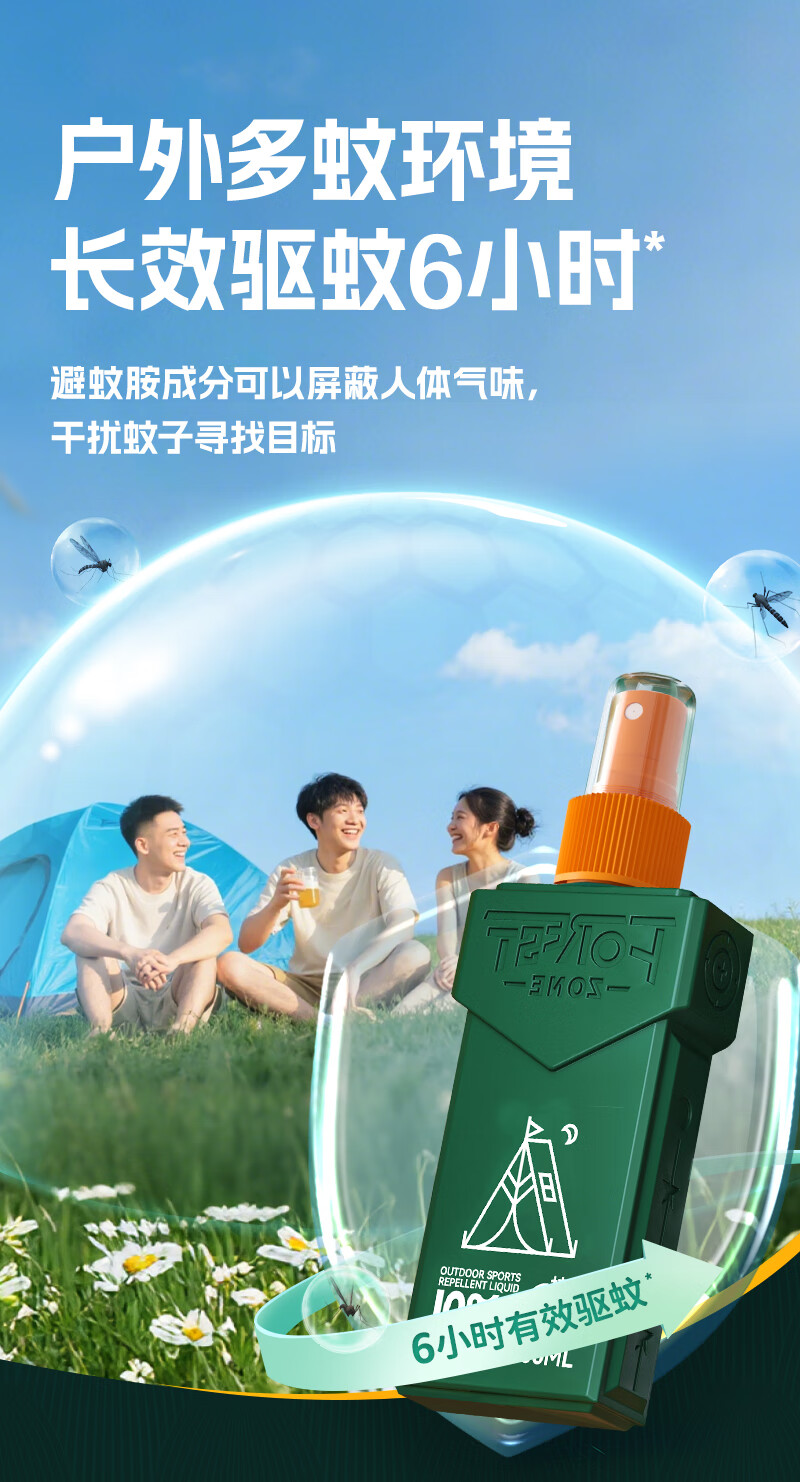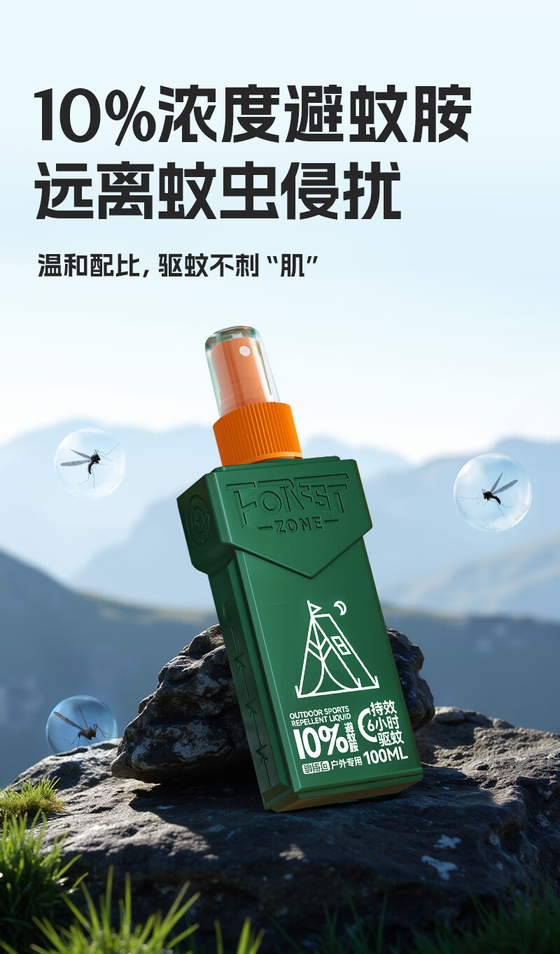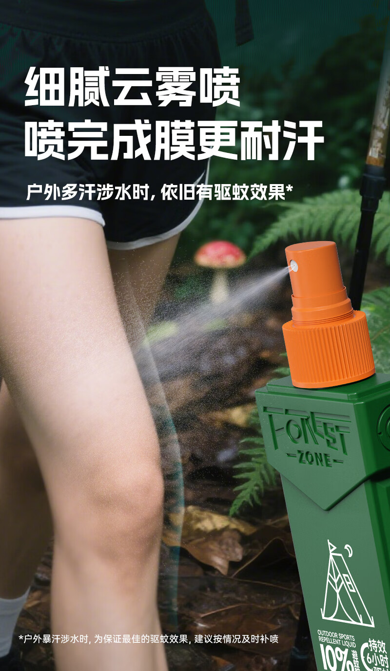 走完亚马逊河第一人-德爷代言品牌。;10%避蚊胺,国家权威机构品质认证,安心又省心。;美国IFF香料,迪奥“超真我”香型。;6小时持久防蚊,无惧蚊虫。;独特贴心设计,驱蚊液可倒喷,解决脚底使用难题。