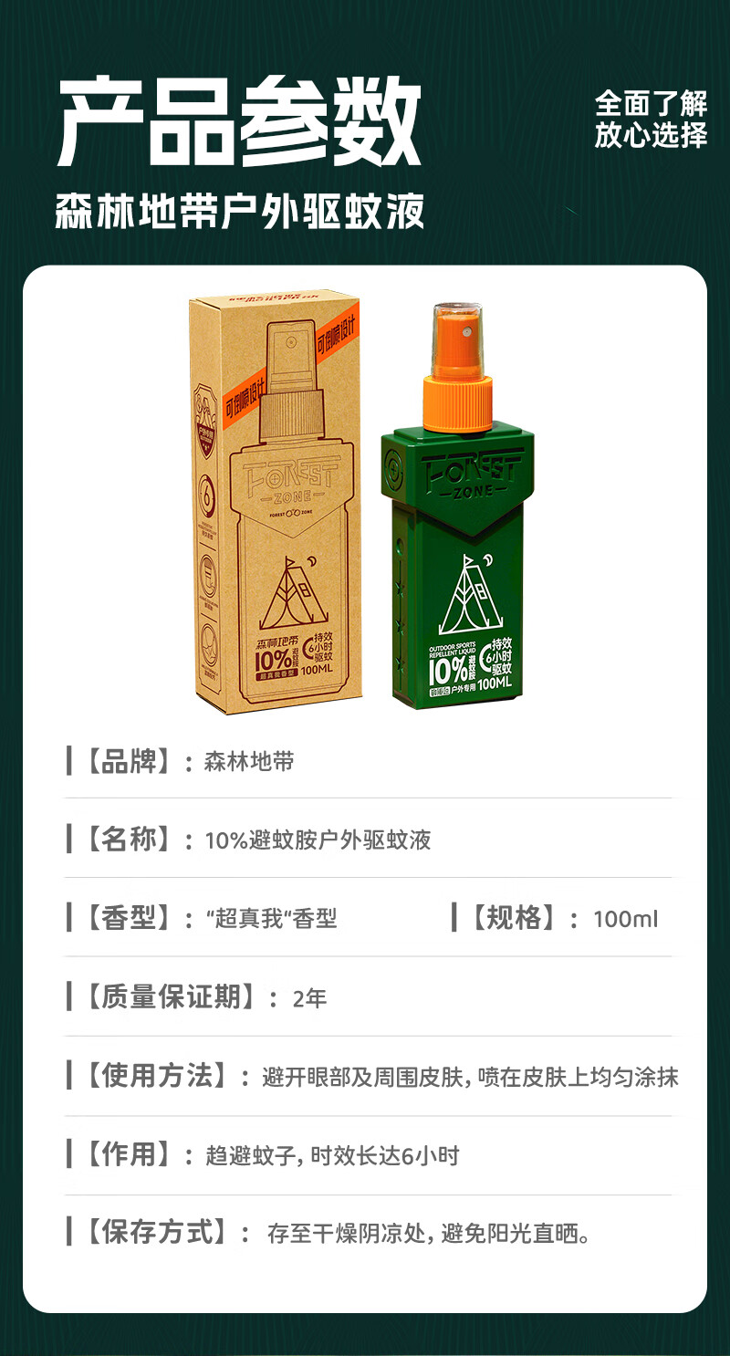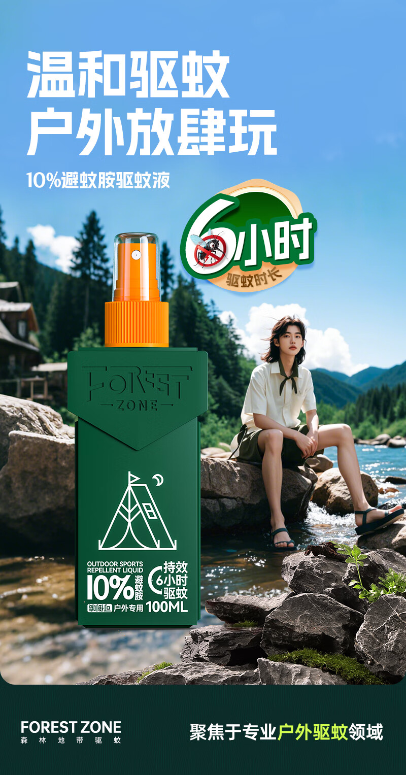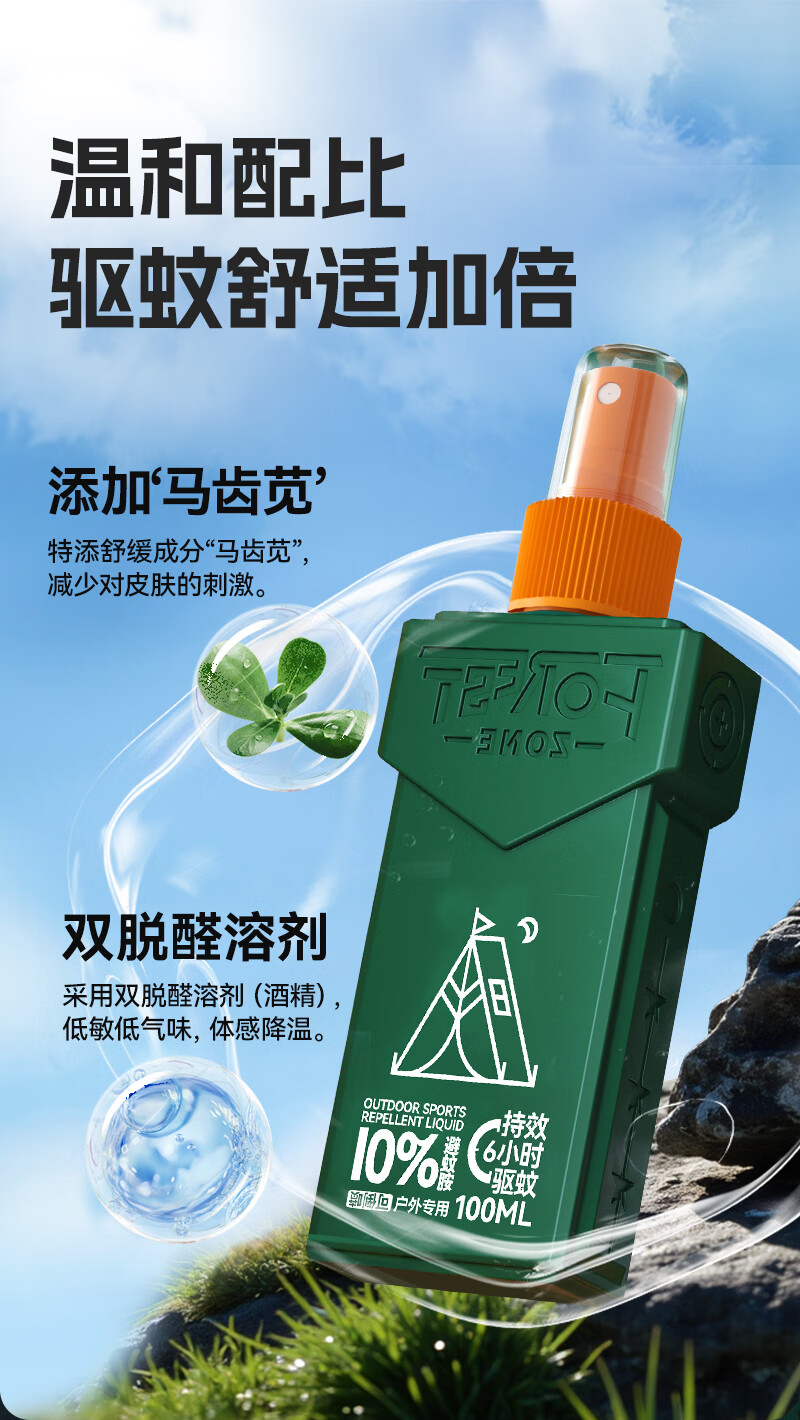 走完亚马逊河第一人-德爷代言品牌。;10%避蚊胺,国家权威机构品质认证,安心又省心。;美国IFF香料,迪奥“超真我”香型。;6小时持久防蚊,无惧蚊虫。;独特贴心设计,驱蚊液可倒喷,解决脚底使用难题。