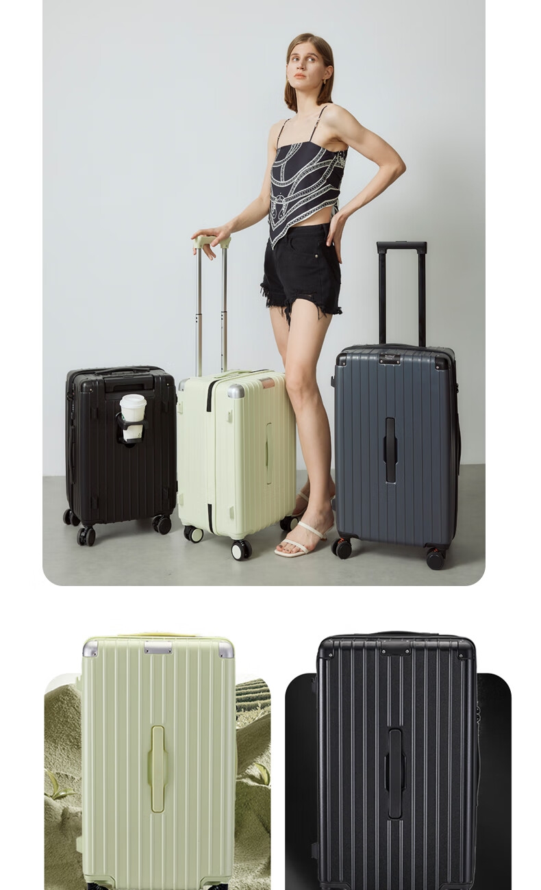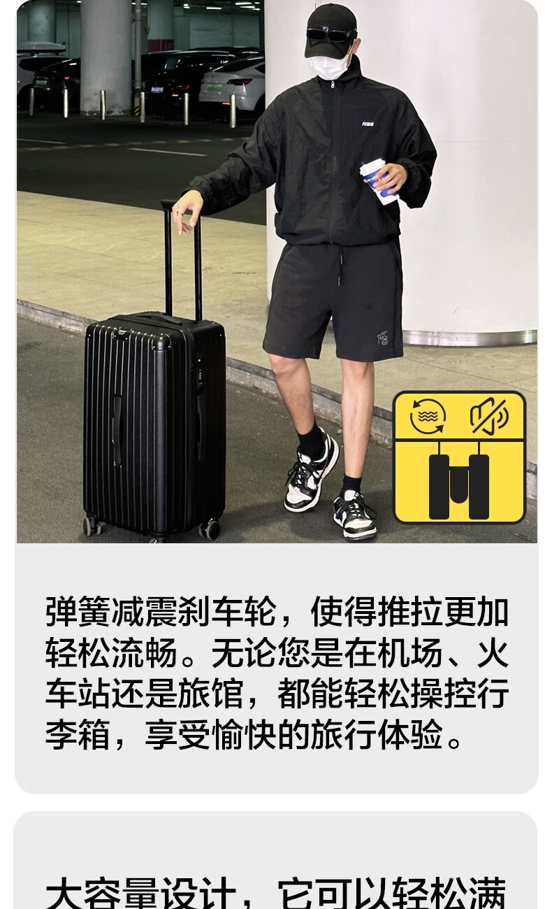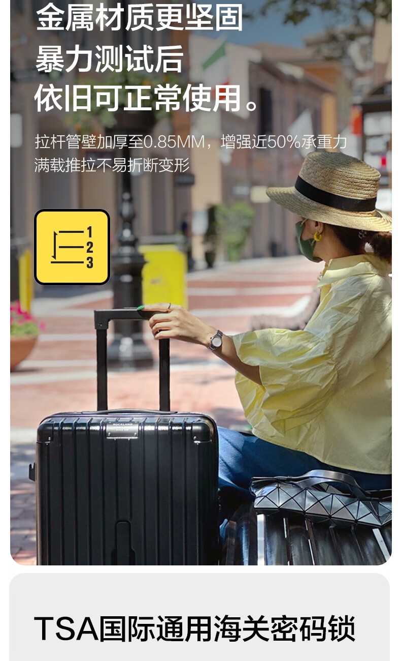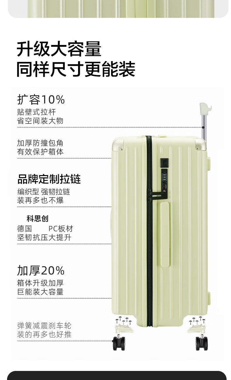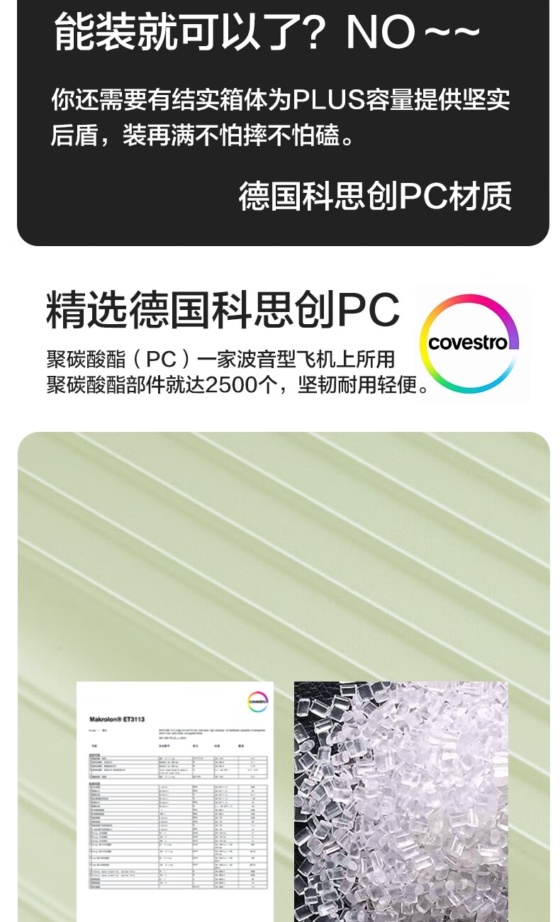 优质科思创PC材质箱体 三层高强防护材质,有效回弹;1mm加厚铝合金拉杆,抽拉顺滑;双设计密码锁,安全出行更放心