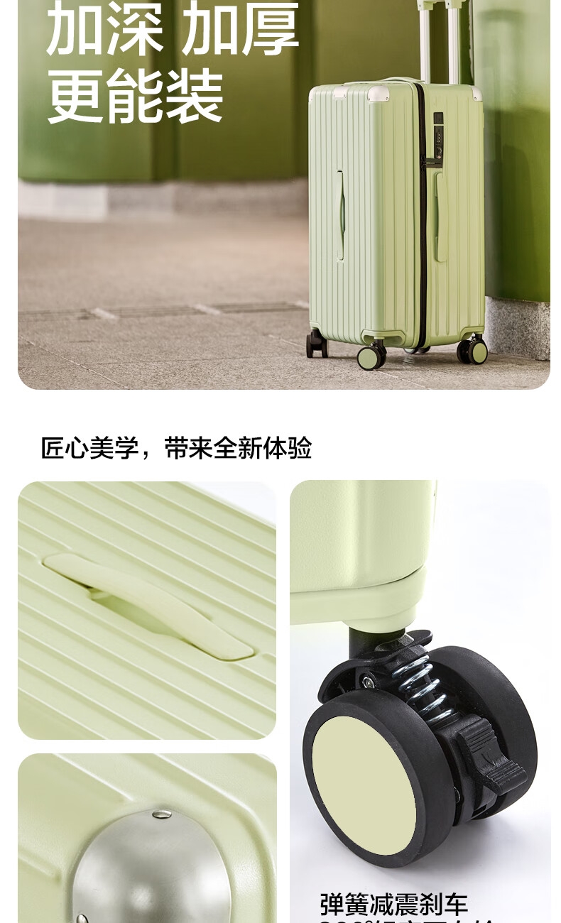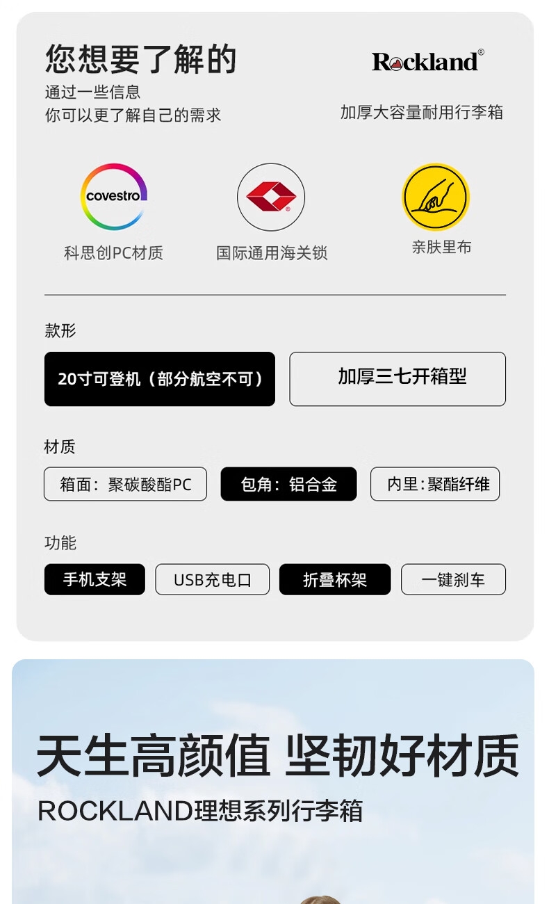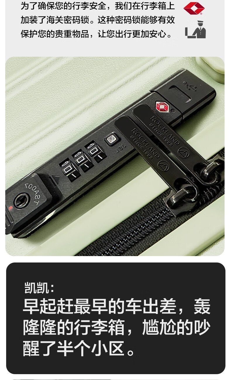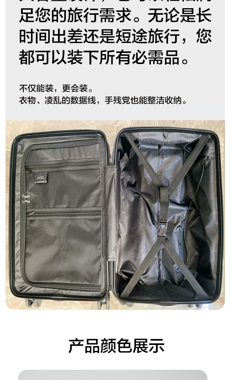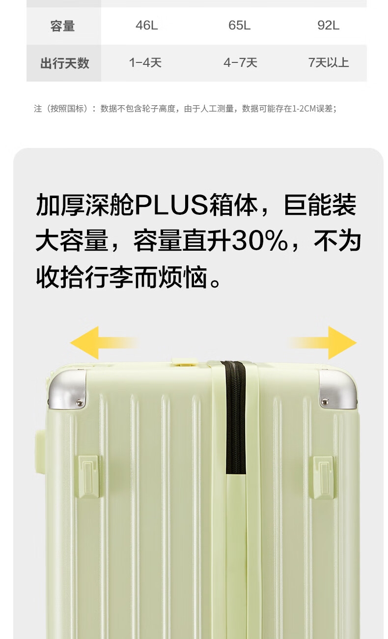 优质科思创PC材质箱体 三层高强防护材质,有效回弹;1mm加厚铝合金拉杆,抽拉顺滑;双设计密码锁,安全出行更放心