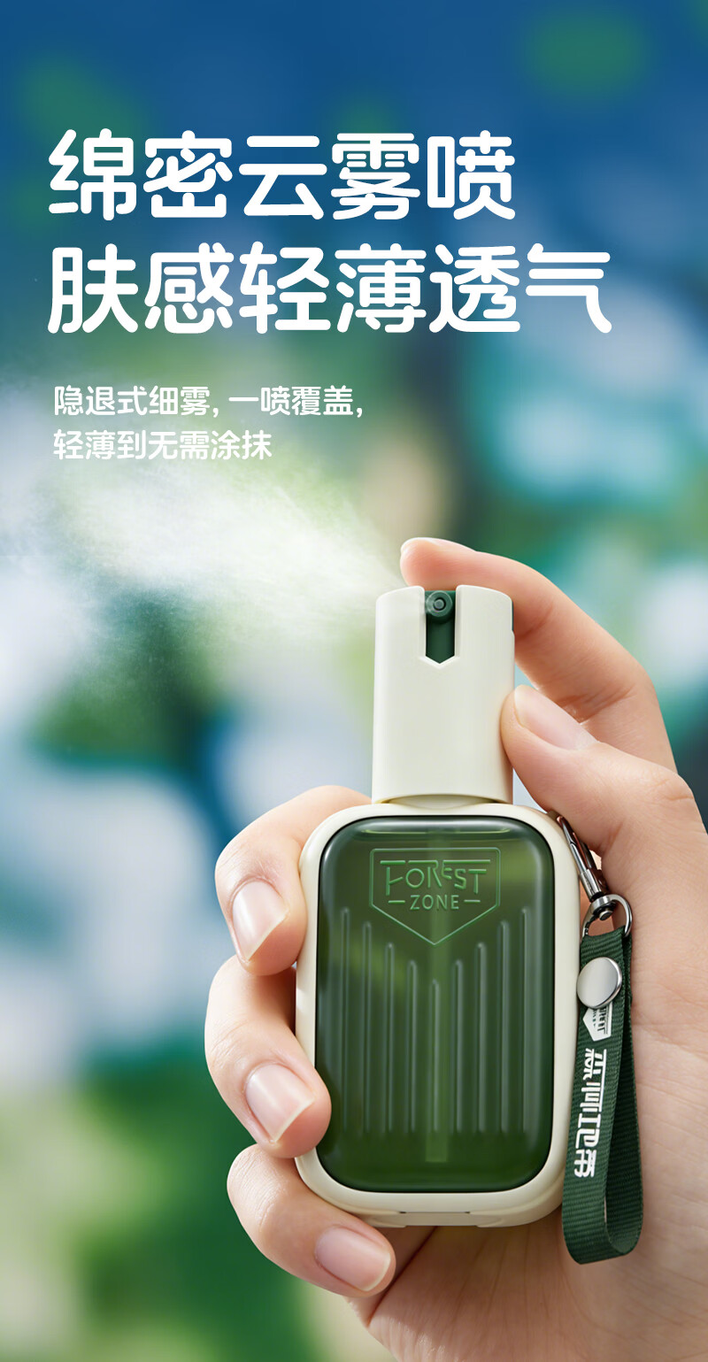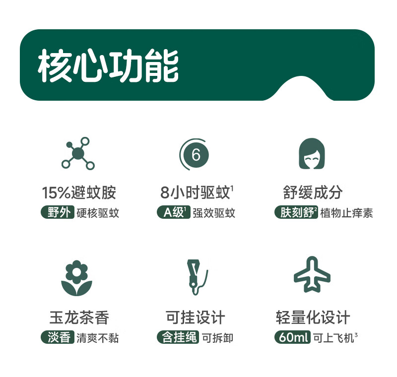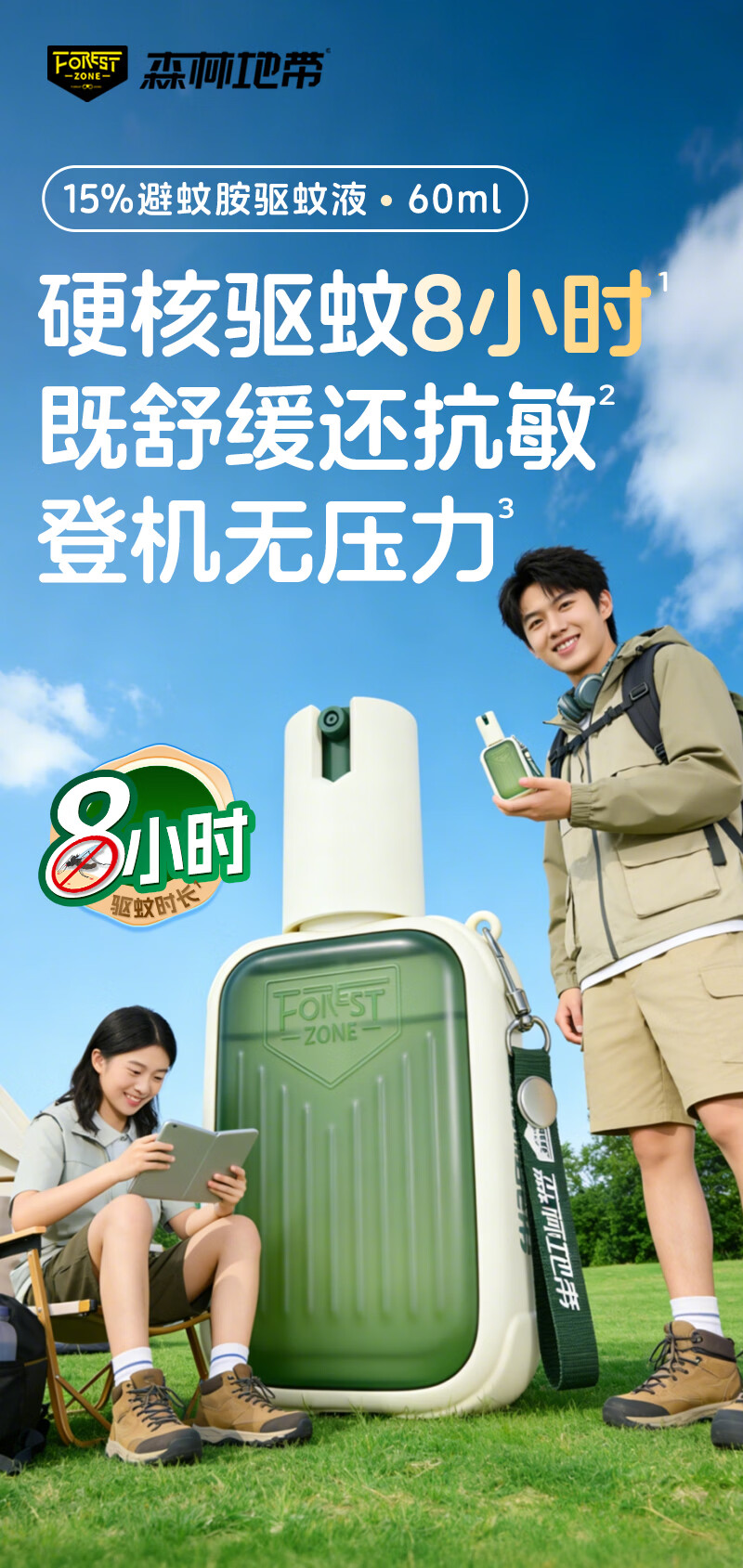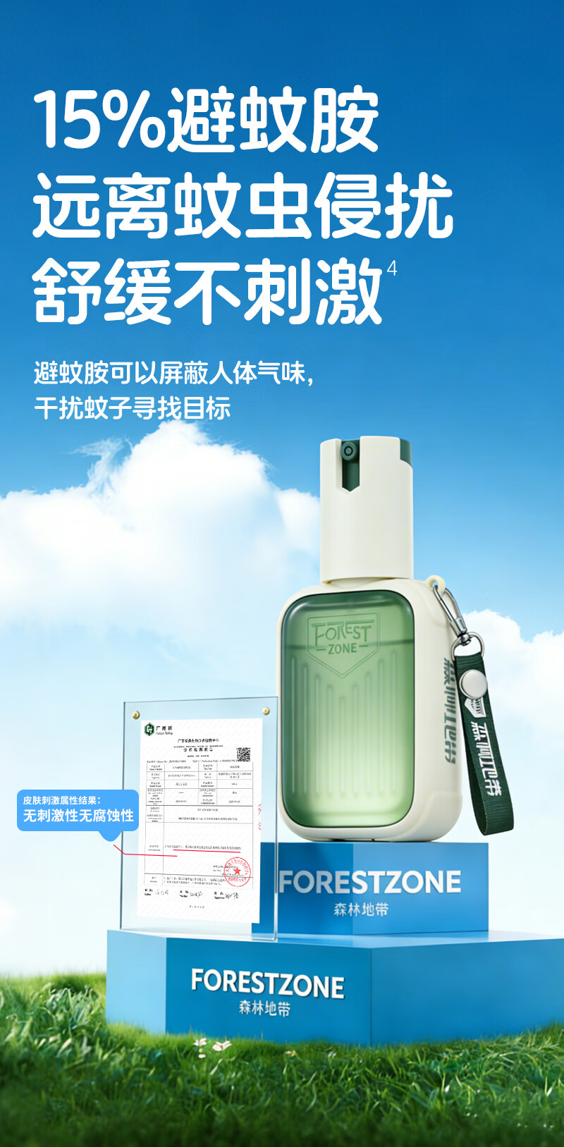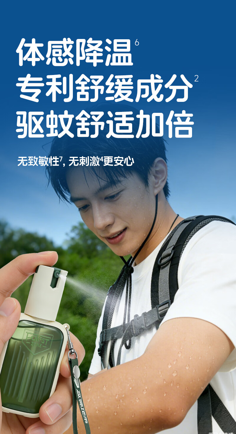 走完亚马逊河第一人-德爷代言品牌。;15%避蚊胺,国内最高浓度,国家权威机构品质认证。;长效防护8小时,不用频繁补喷,无惧蚊虫。;成分升级添加专利舒缓成分“肤刻舒”,无刺激敏感肌。;云雾喷雾设计,快速均匀覆盖肌肤,防护更全面。