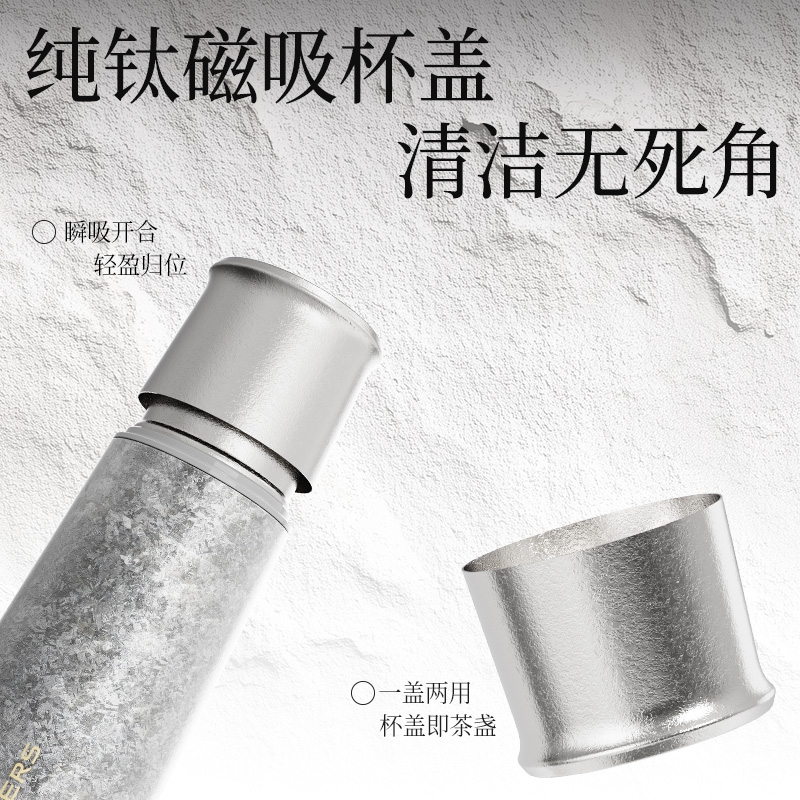 内外纯钛,抑菌锁鲜;磁吸钛盖,瞬秒开合;一盖双用,即是杯盖也是茶杯;精致礼盒,送礼佳品