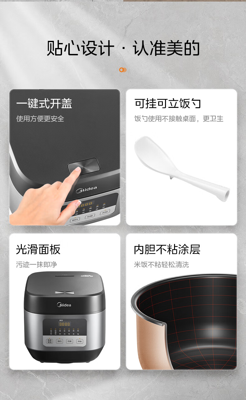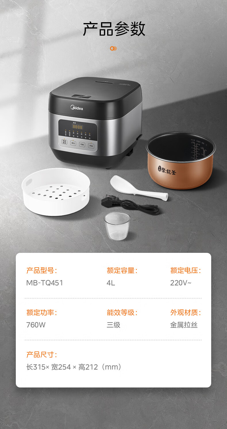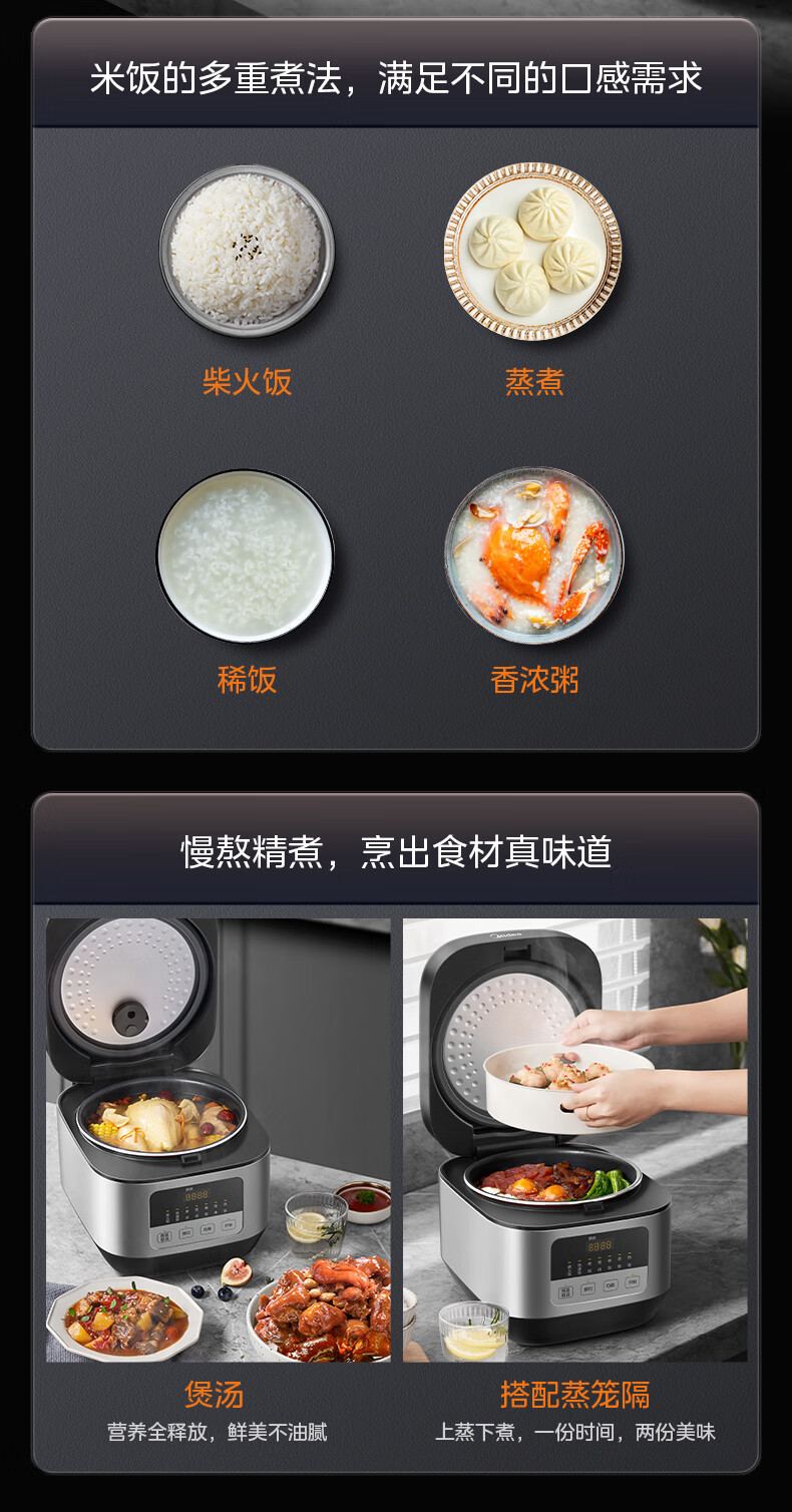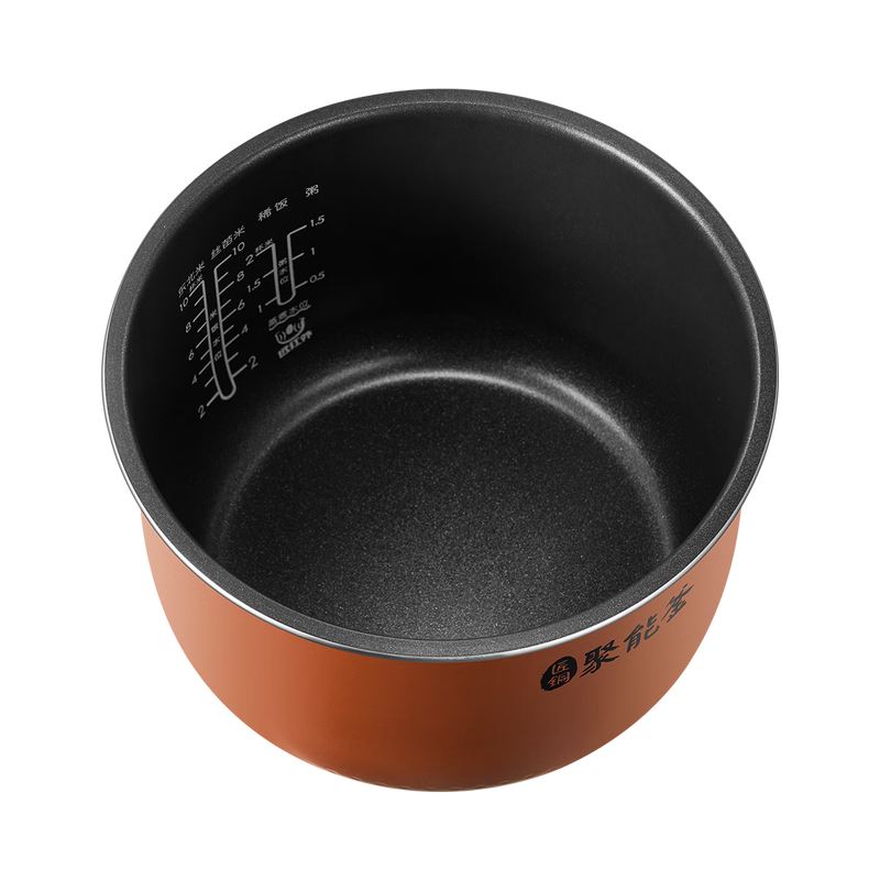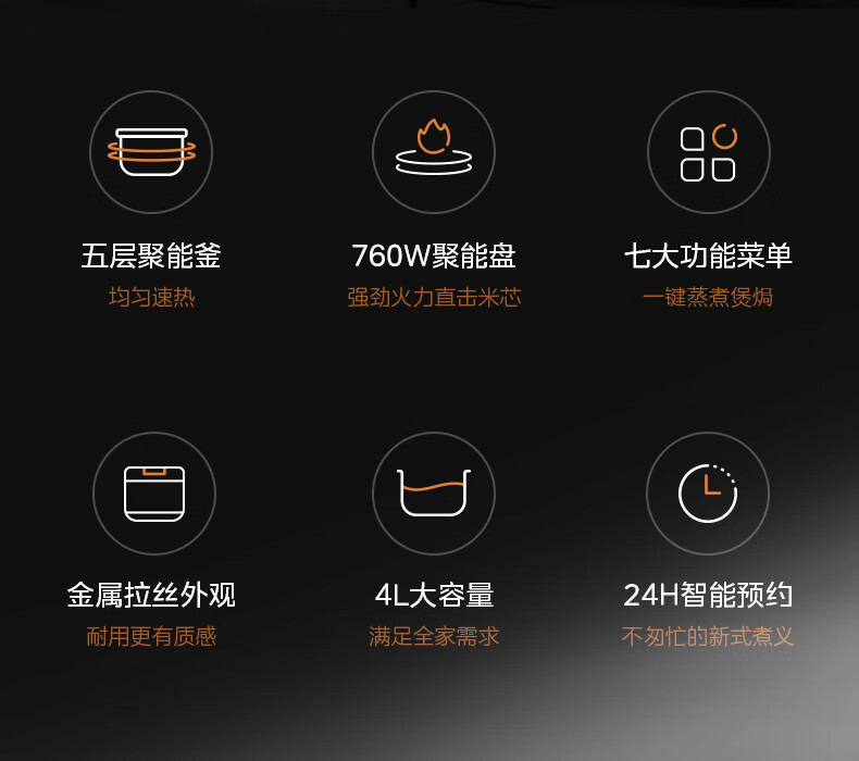 760W弧形聚能发热盘,火力全开,粒粒透芯;;隐藏式微压焖香阀,蒸汽补炊,智能焖香;;1.7mm匠铜聚能釜,健康不粘;