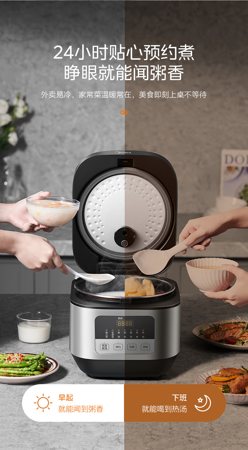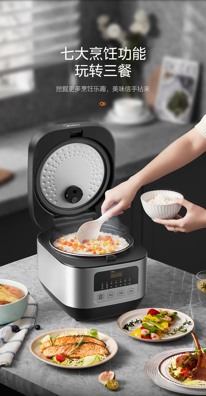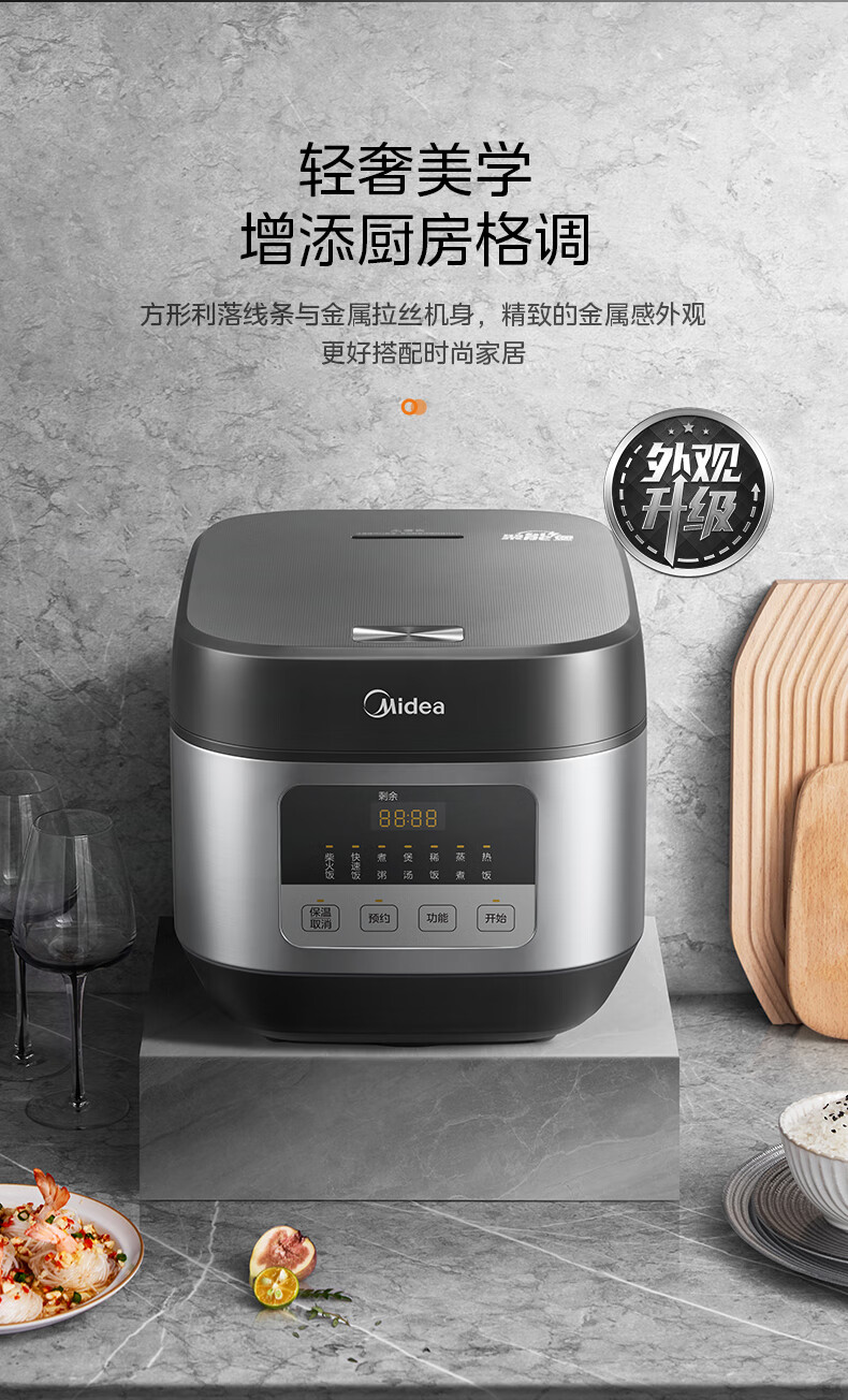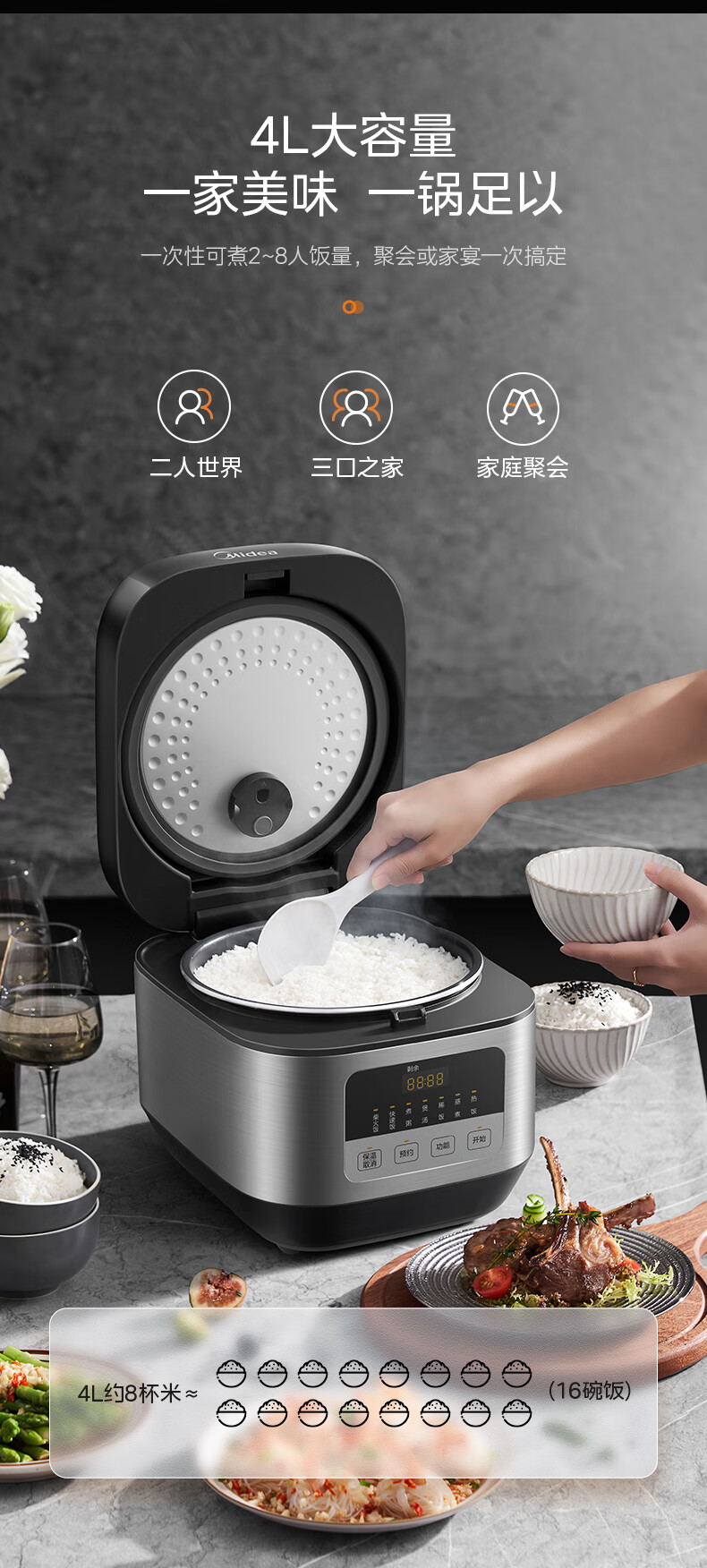 760W弧形聚能发热盘,火力全开,粒粒透芯;;隐藏式微压焖香阀,蒸汽补炊,智能焖香;;1.7mm匠铜聚能釜,健康不粘;