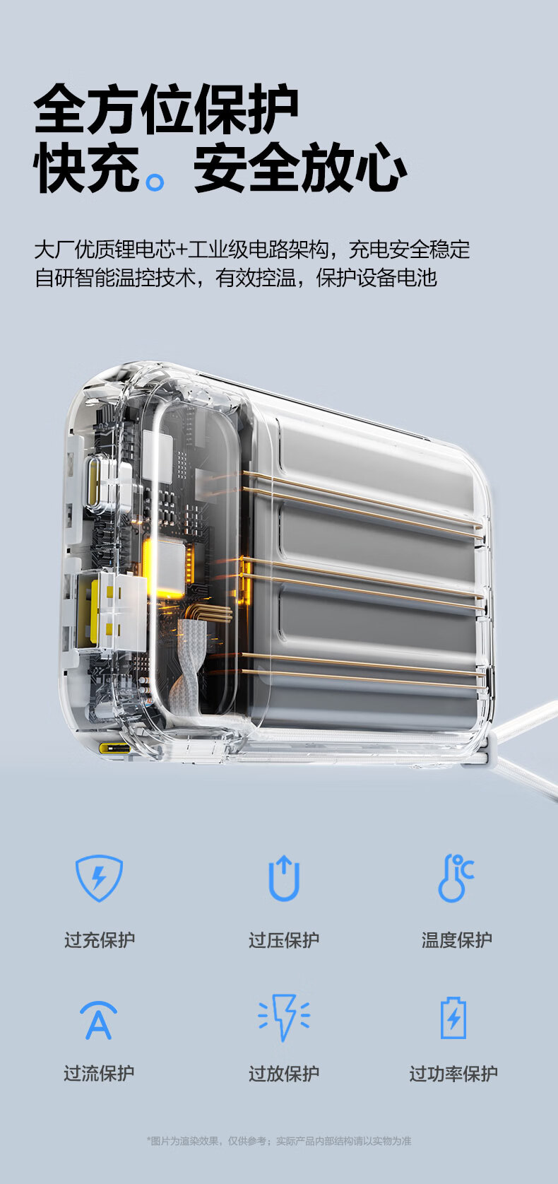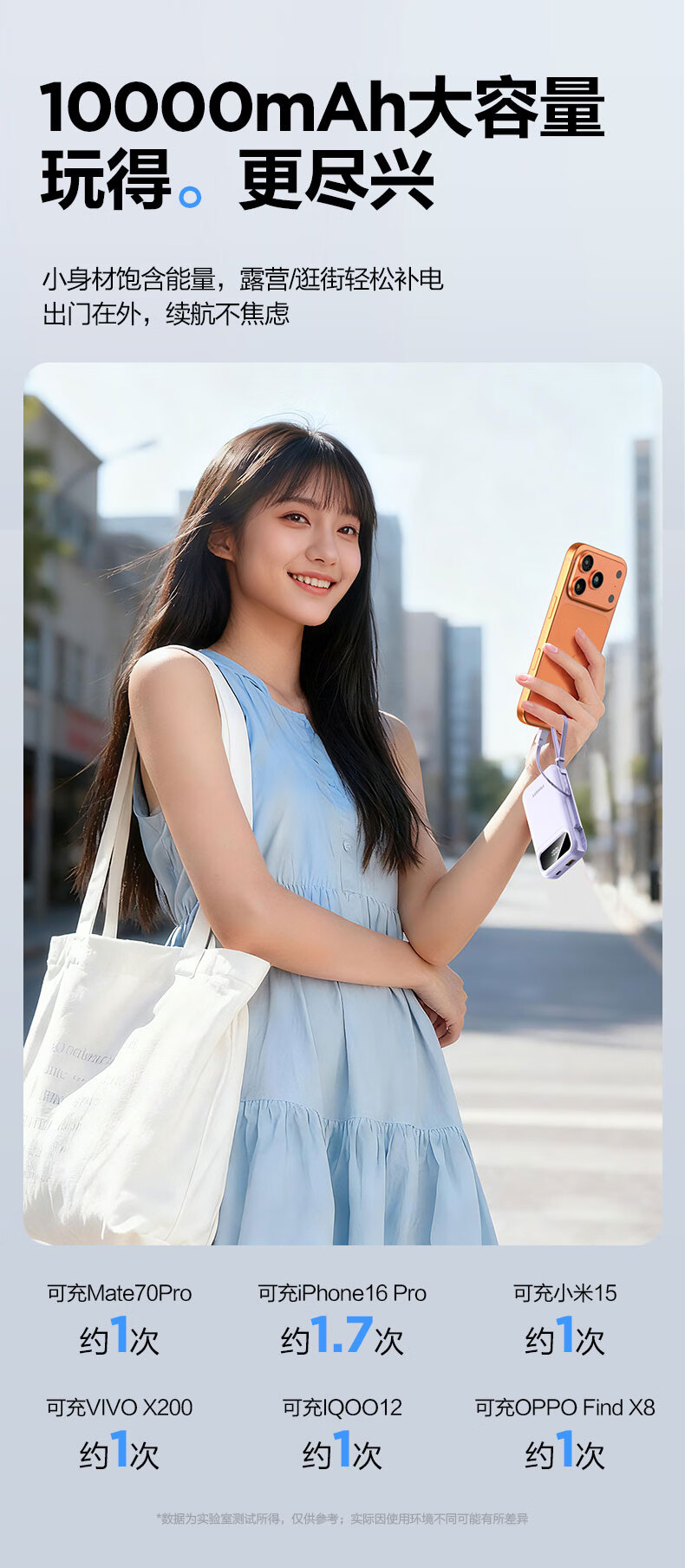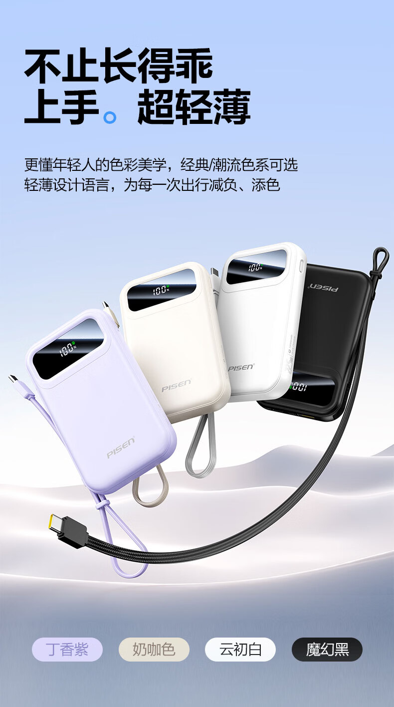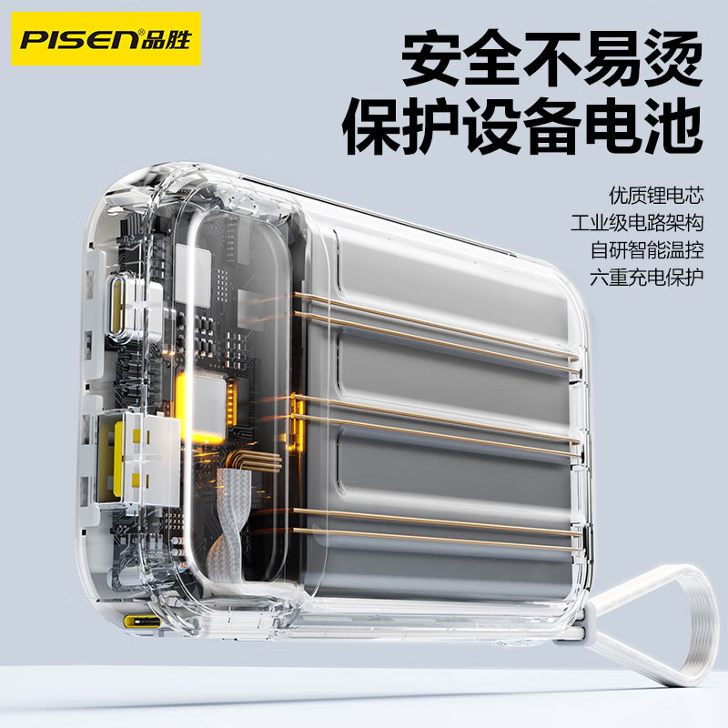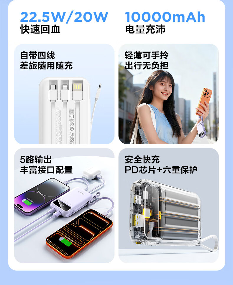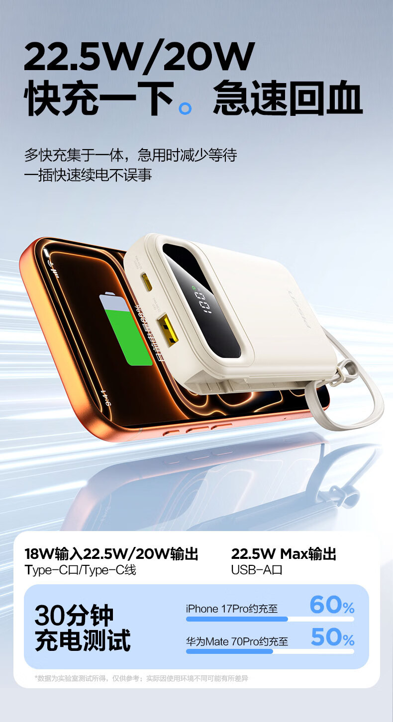 圆润边角,触感舒适;单手舒适掌握,提着方便出行好伴侣;双向快充,兼容苹果20W快充