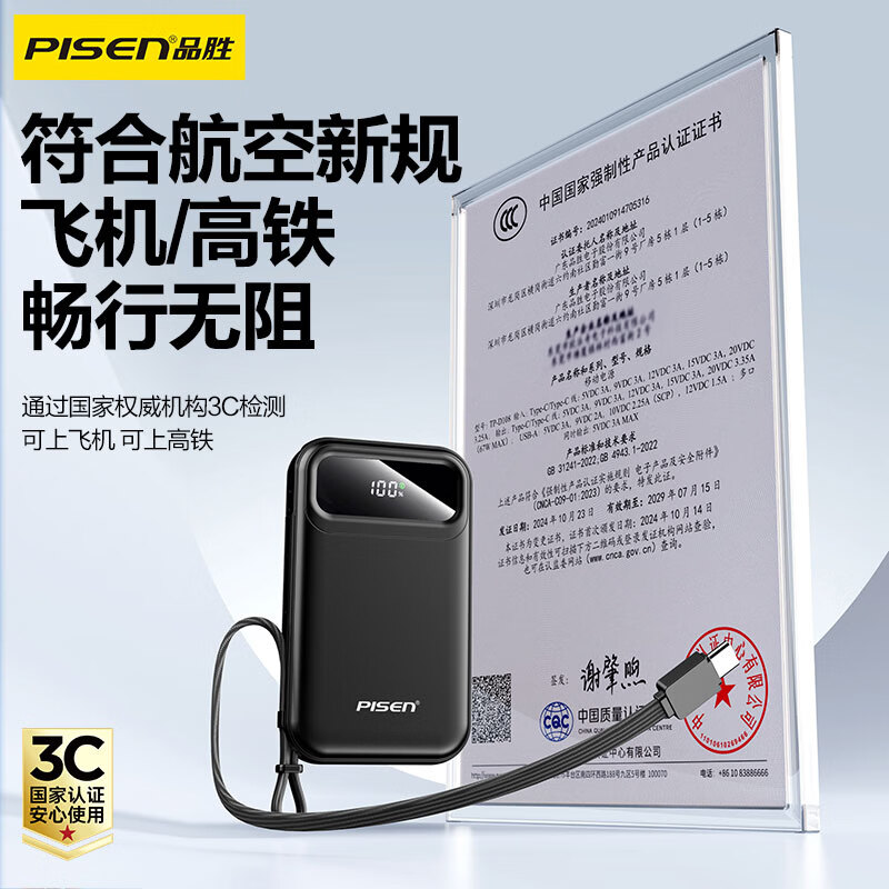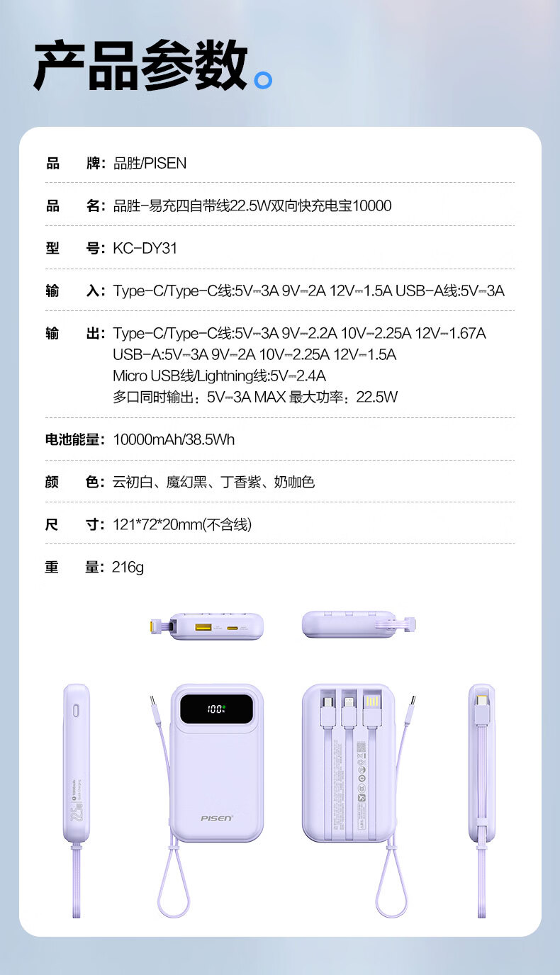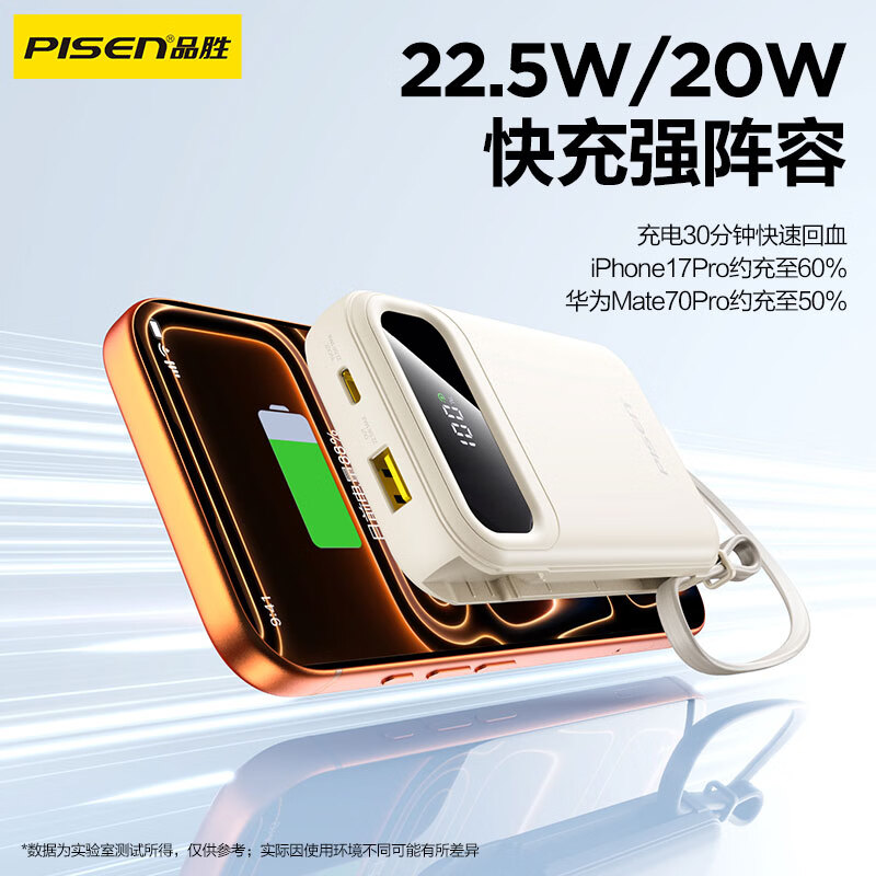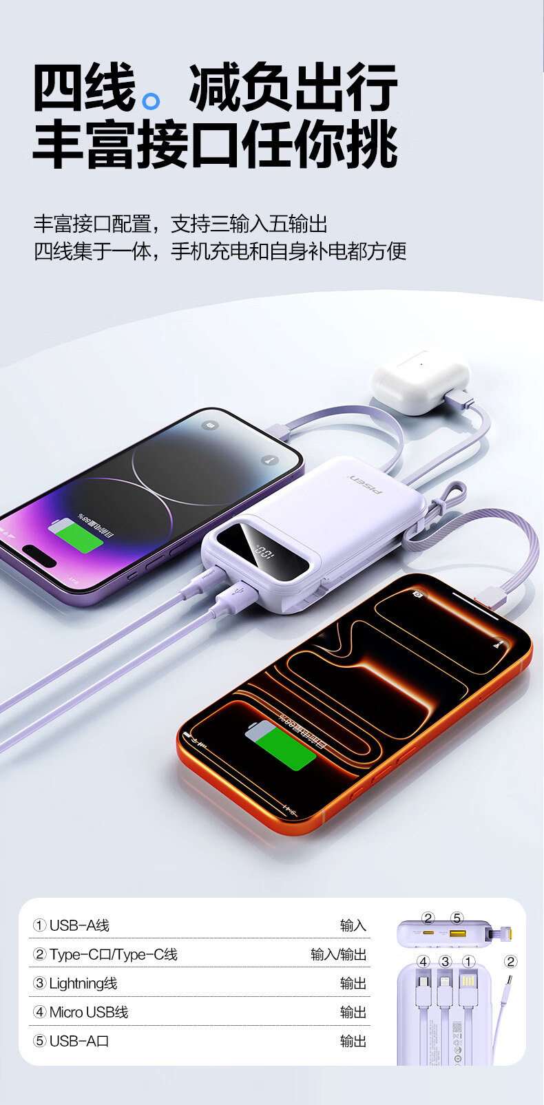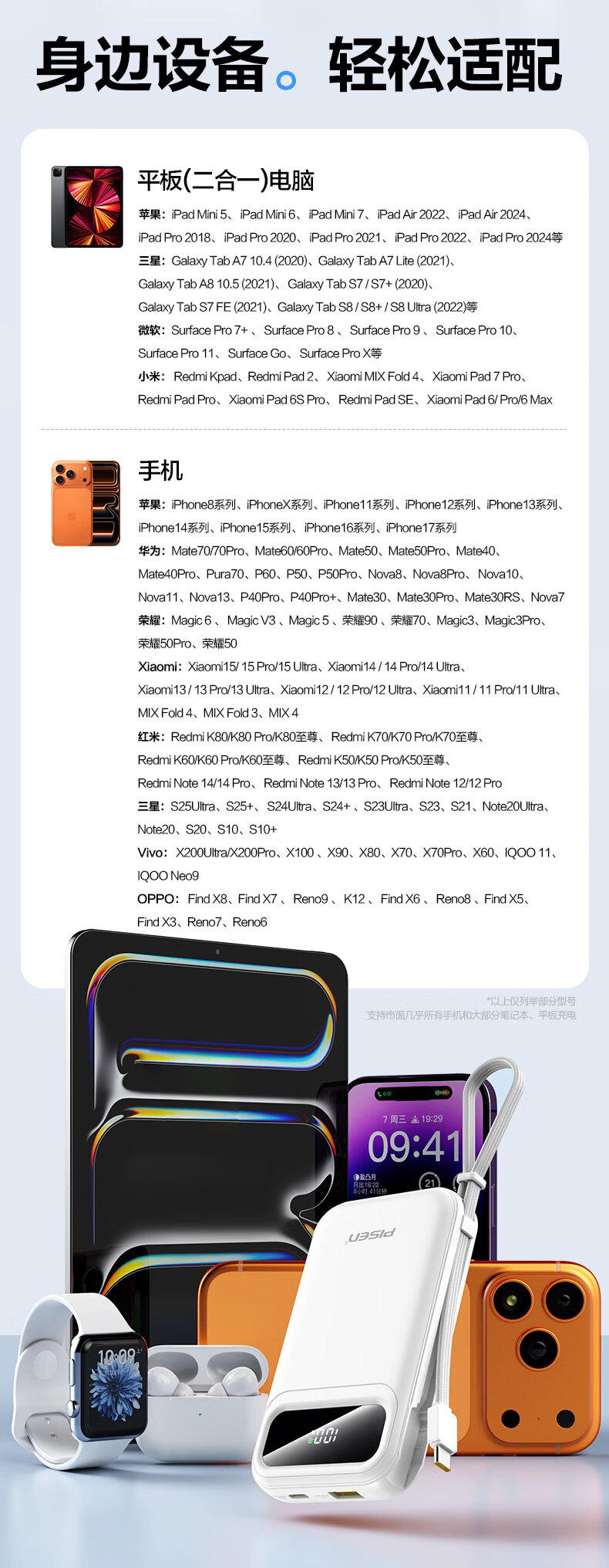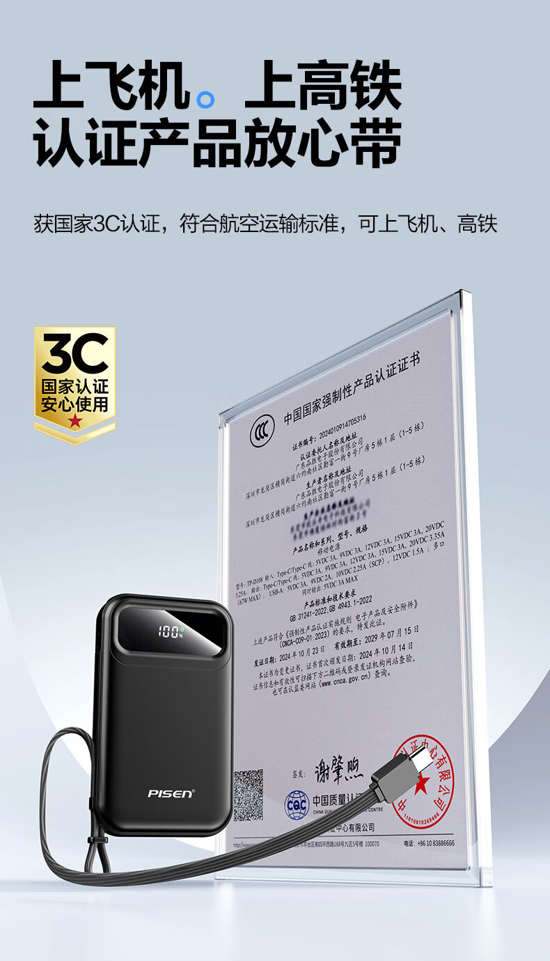 圆润边角,触感舒适;单手舒适掌握,提着方便出行好伴侣;双向快充,兼容苹果20W快充