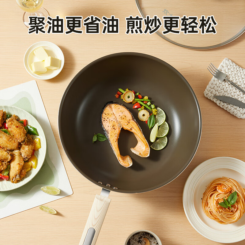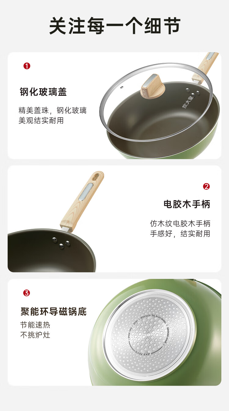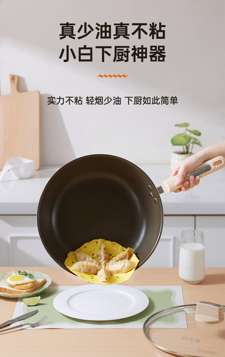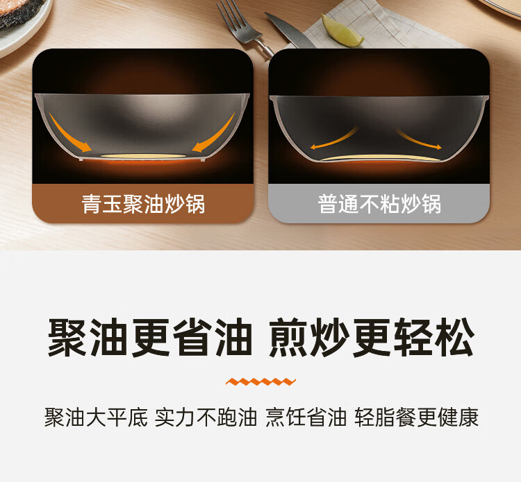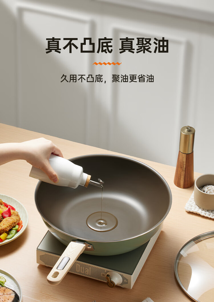 聚油大平底,实力不跑油, 烹饪省油,轻脂餐更健康。;实力不粘,轻烟少油 ;真轻量化锅身,掂炒轻而易举