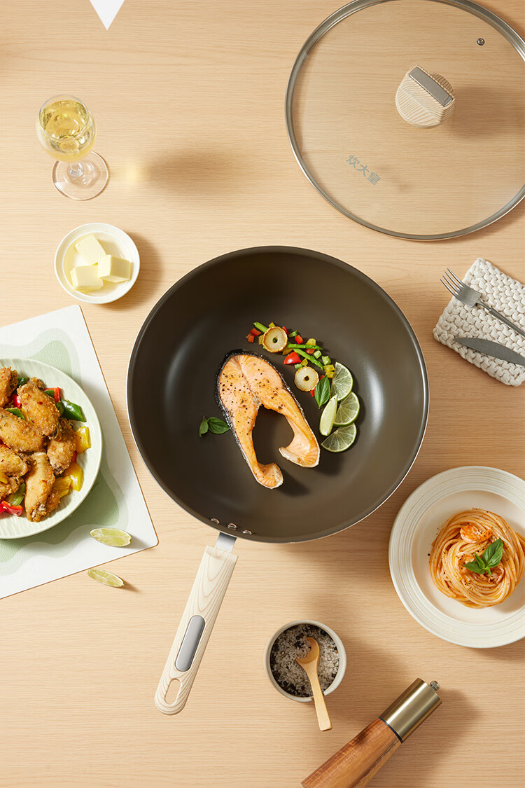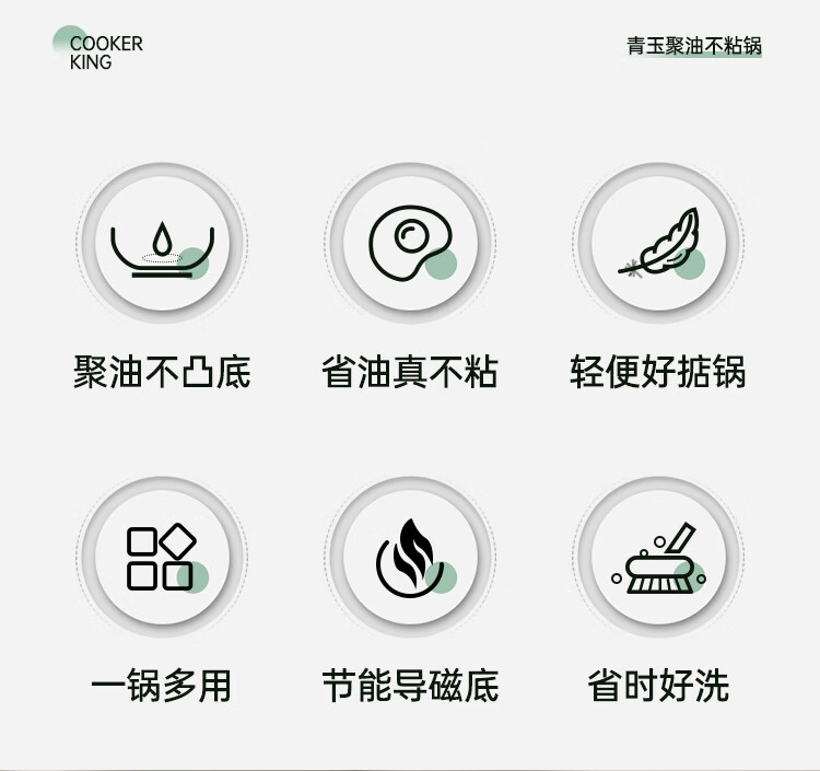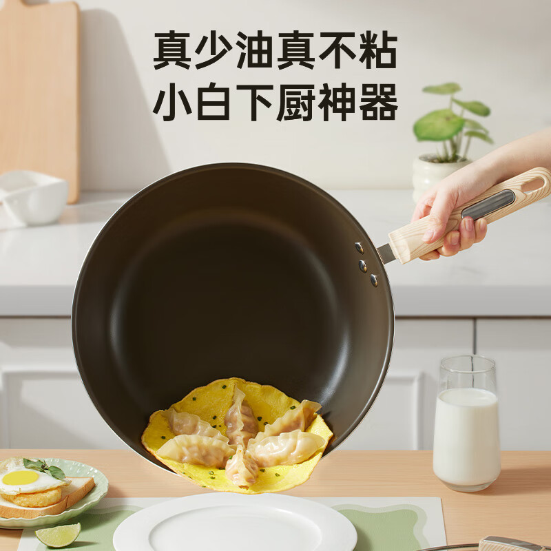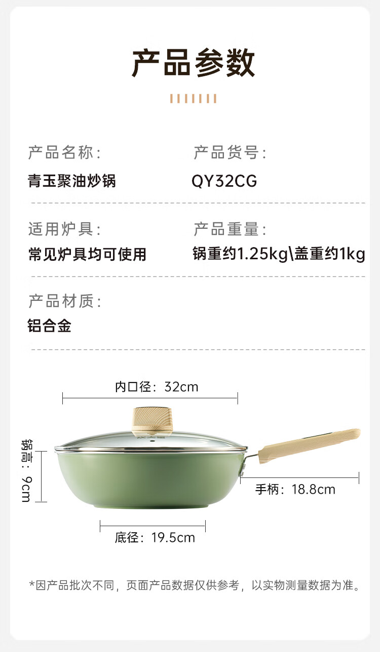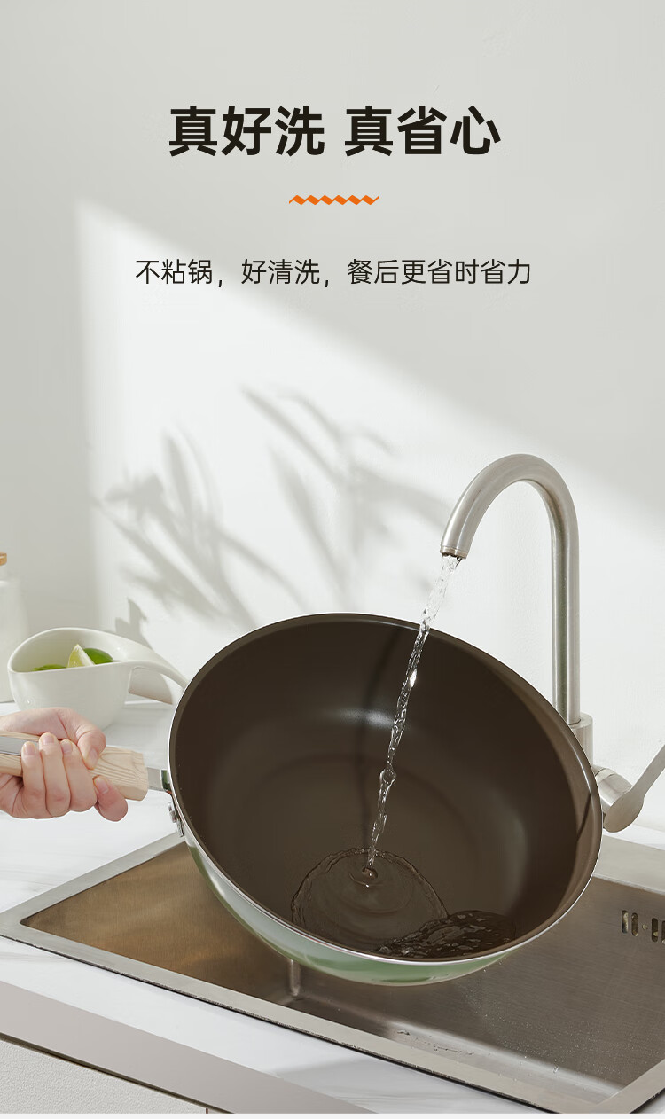 聚油大平底,实力不跑油, 烹饪省油,轻脂餐更健康。;实力不粘,轻烟少油 ;真轻量化锅身,掂炒轻而易举