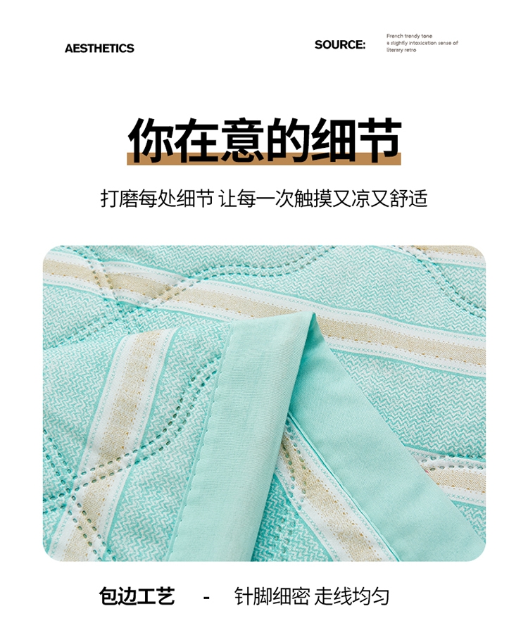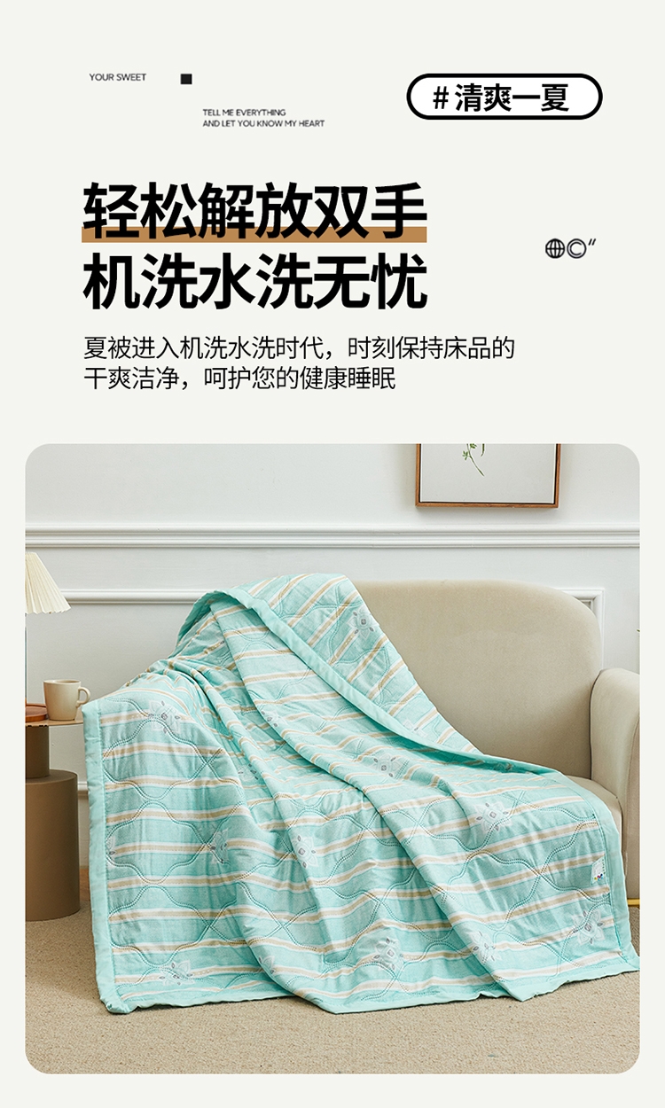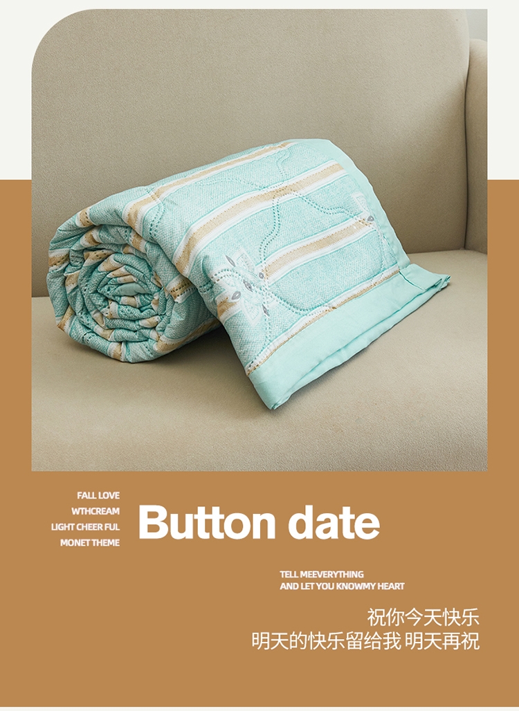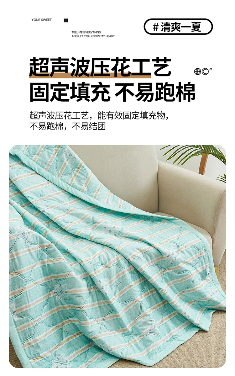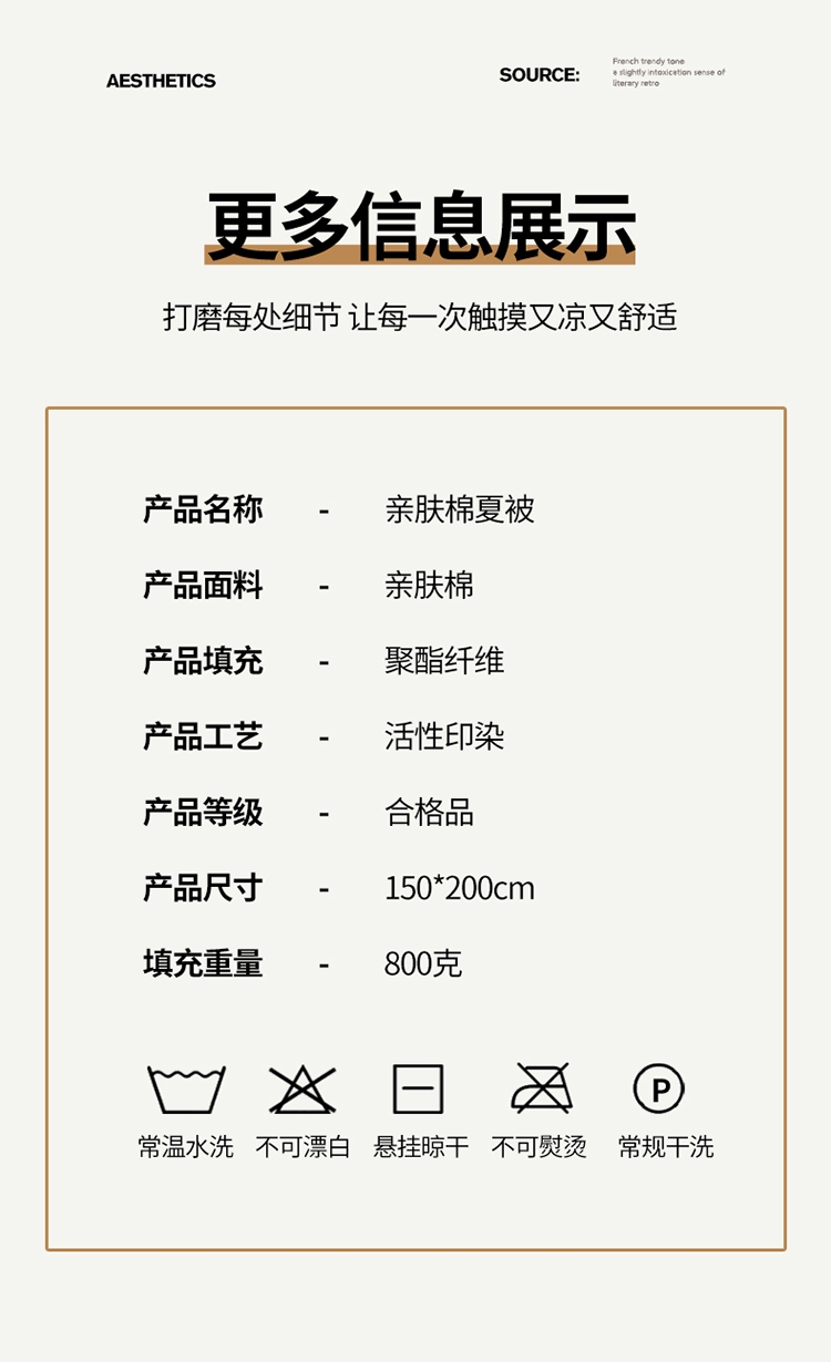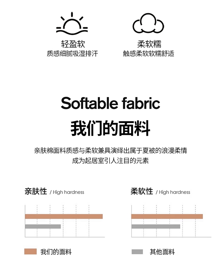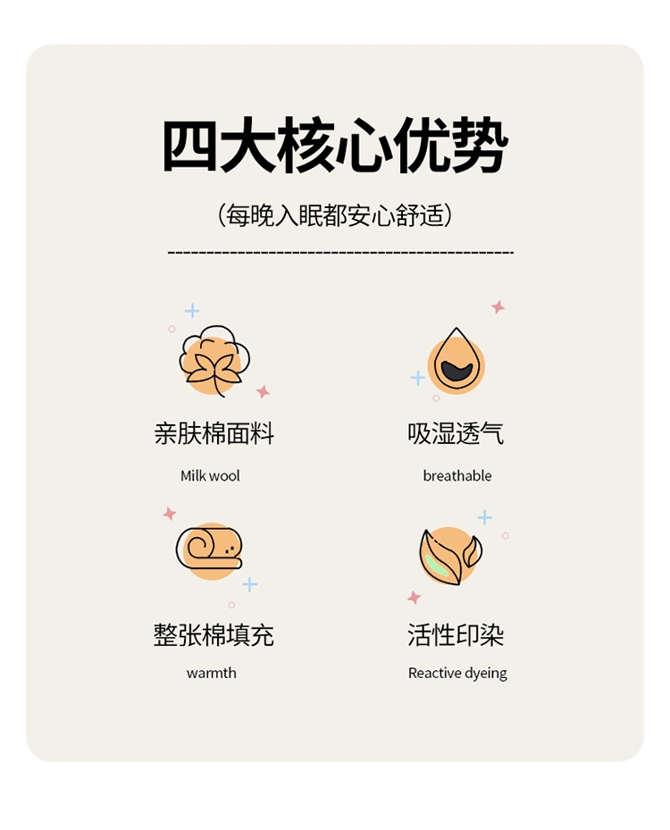 亲肤棉面料 细腻柔软 感知好睡眠;吸湿快干 不感闷热; 整张棉填充 蓬松柔软 更轻盈