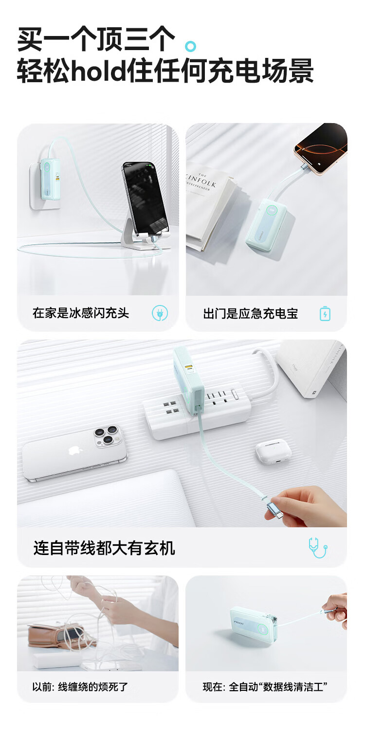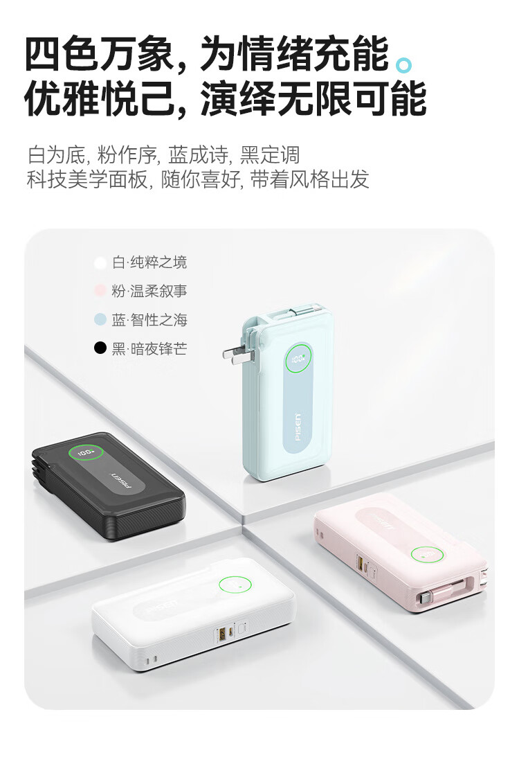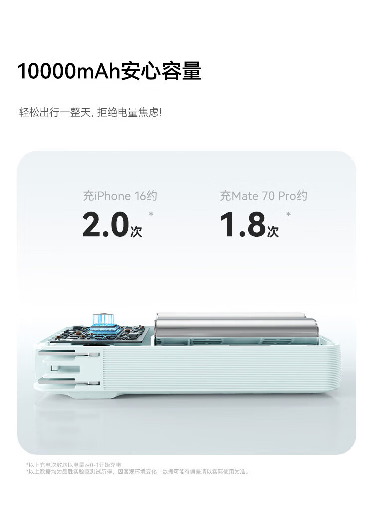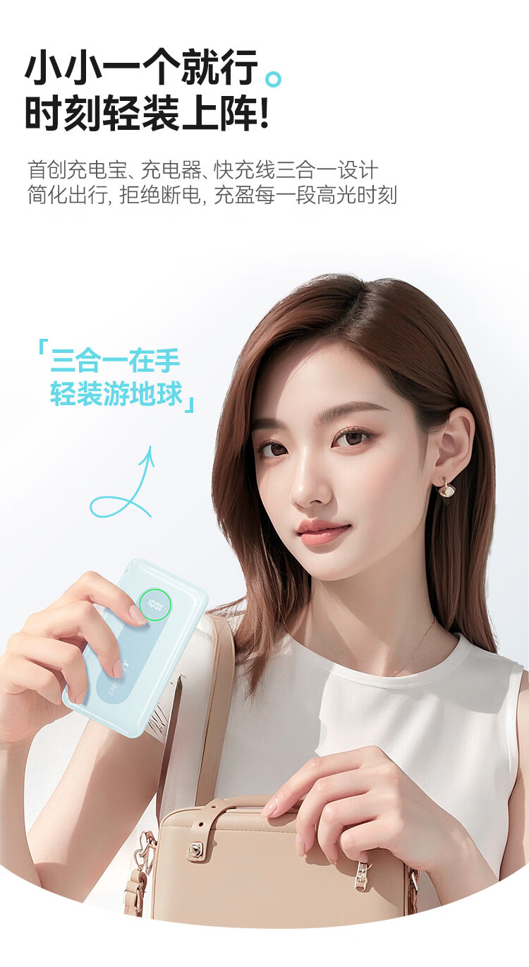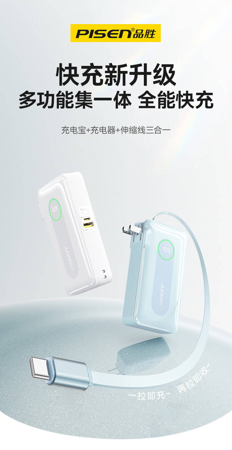 充电器+充电宝二合一,一机双用;时尚优雅设计,折叠插脚;10000mAh大容量,无惧断电,足额实标