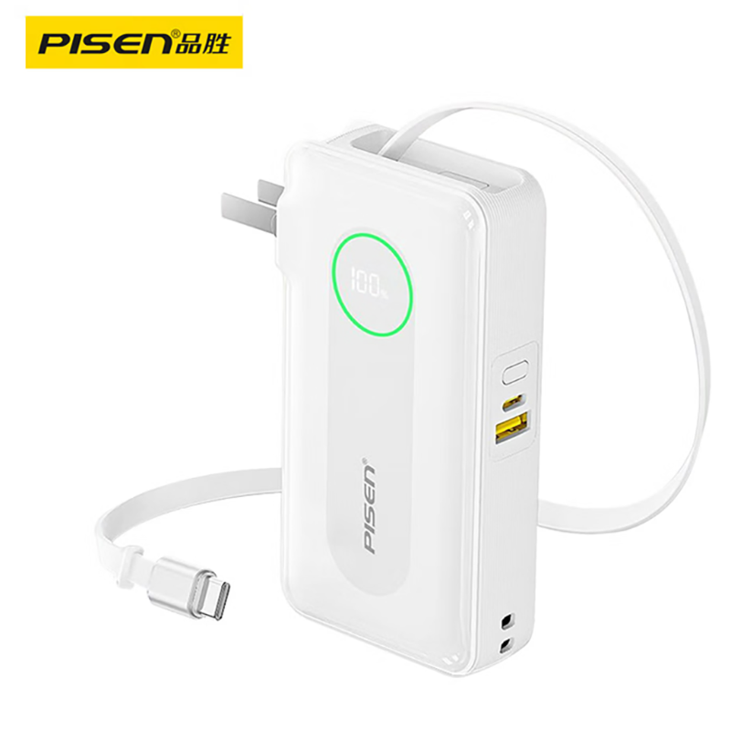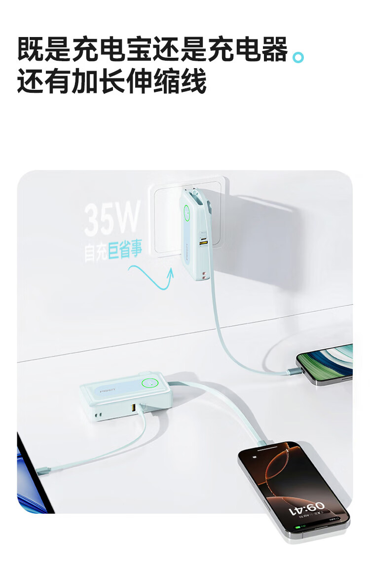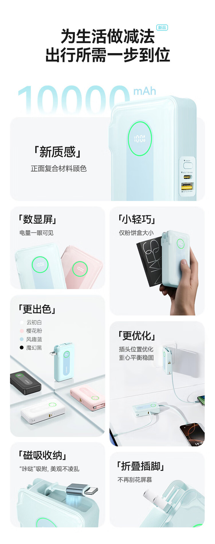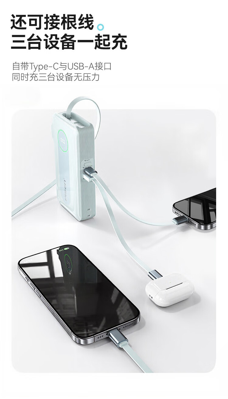 充电器+充电宝二合一,一机双用;时尚优雅设计,折叠插脚;10000mAh大容量,无惧断电,足额实标