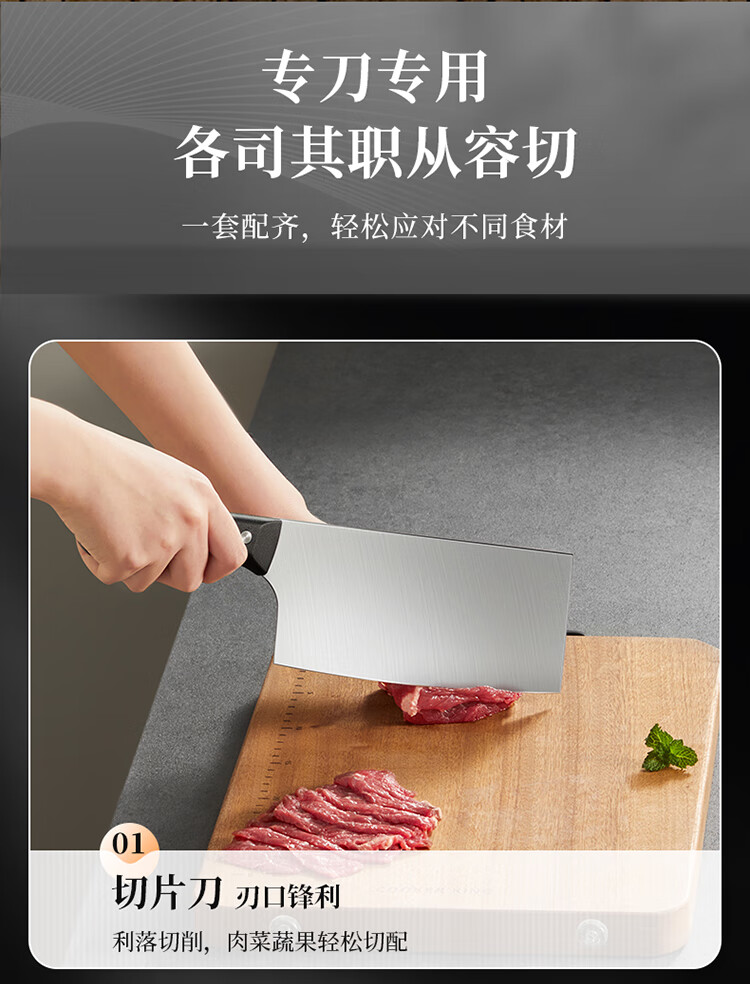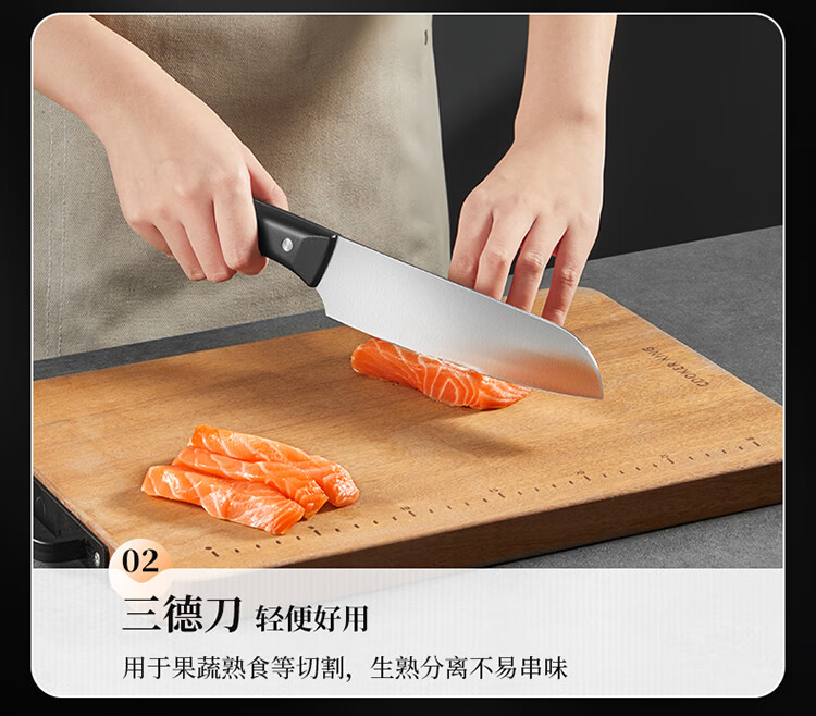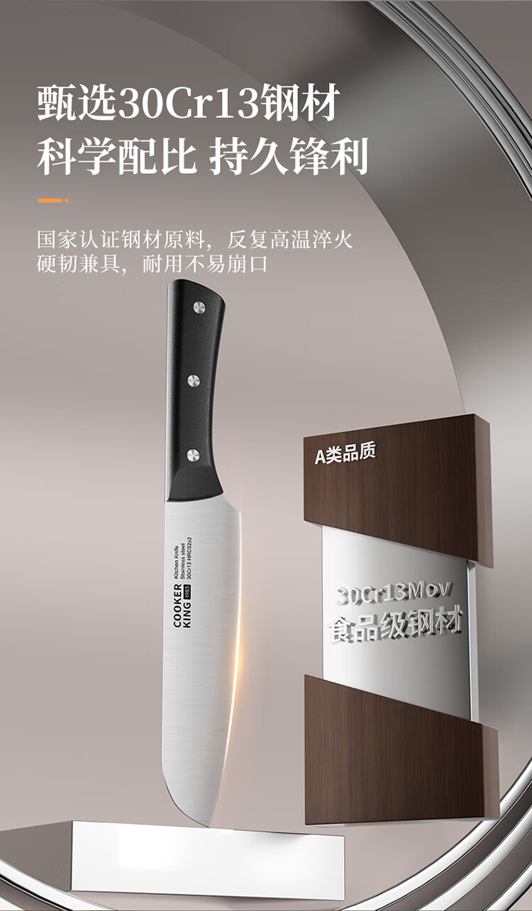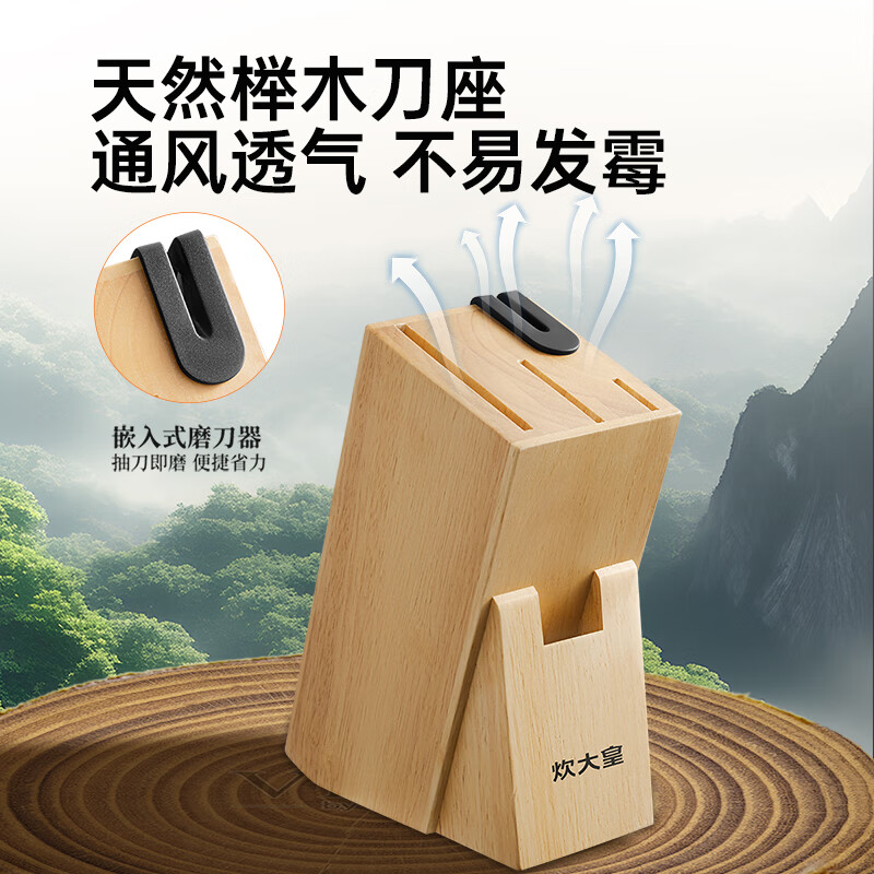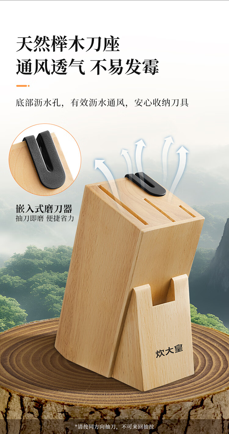 厨房切配好帮手,切拉划削轻松自如。;甄选30Cr13钢材科学配比 持久锋利。;天然榉木刀座通风透气不易发霉。