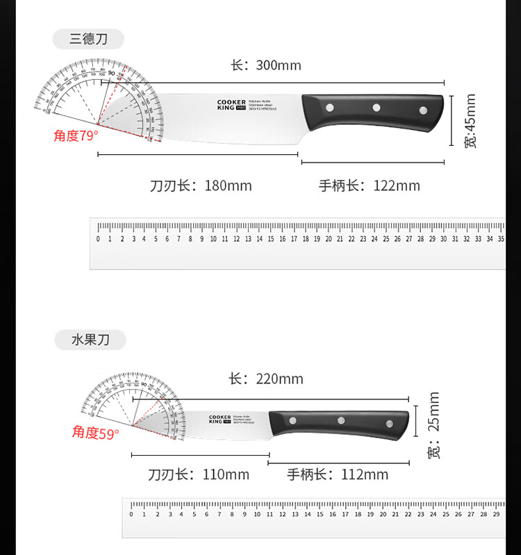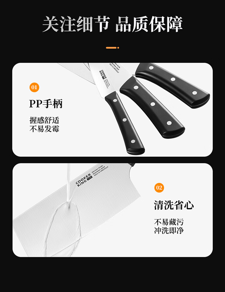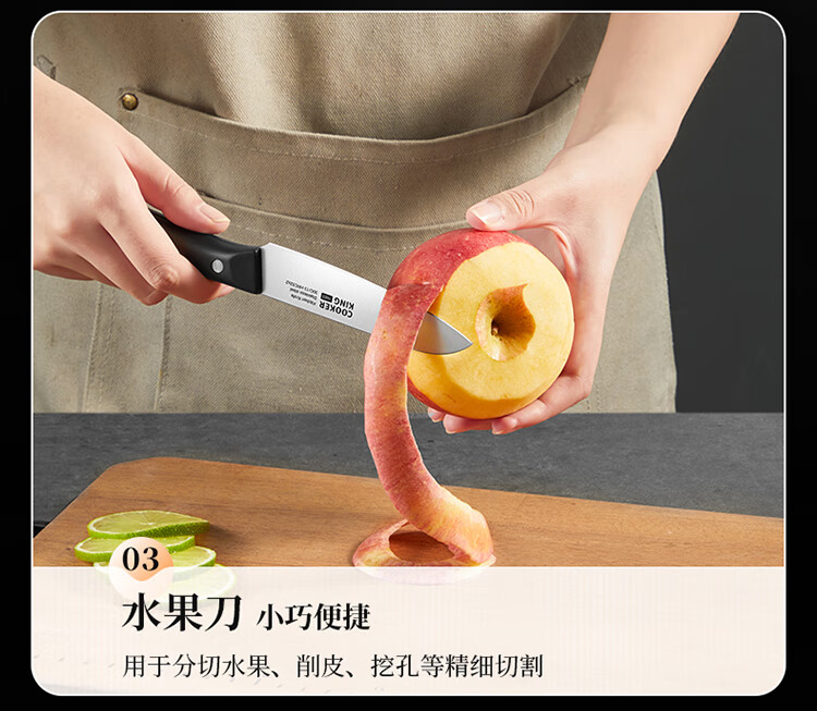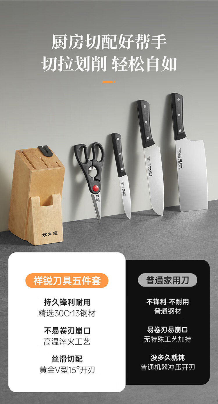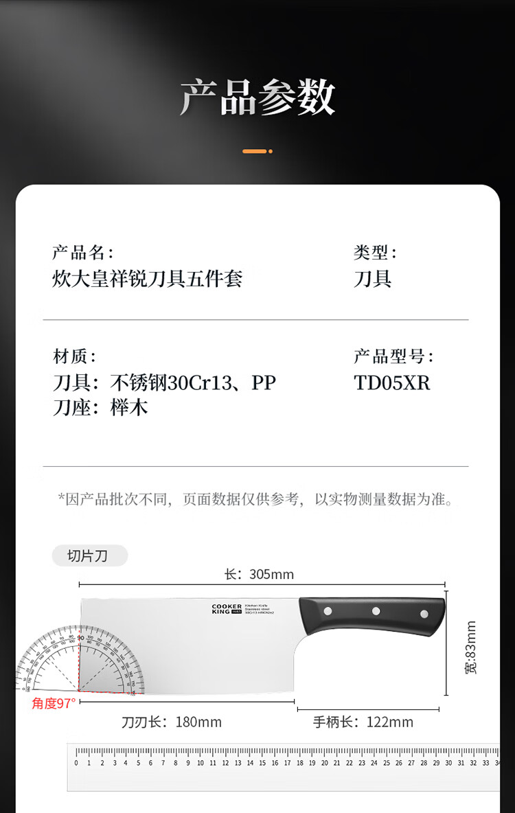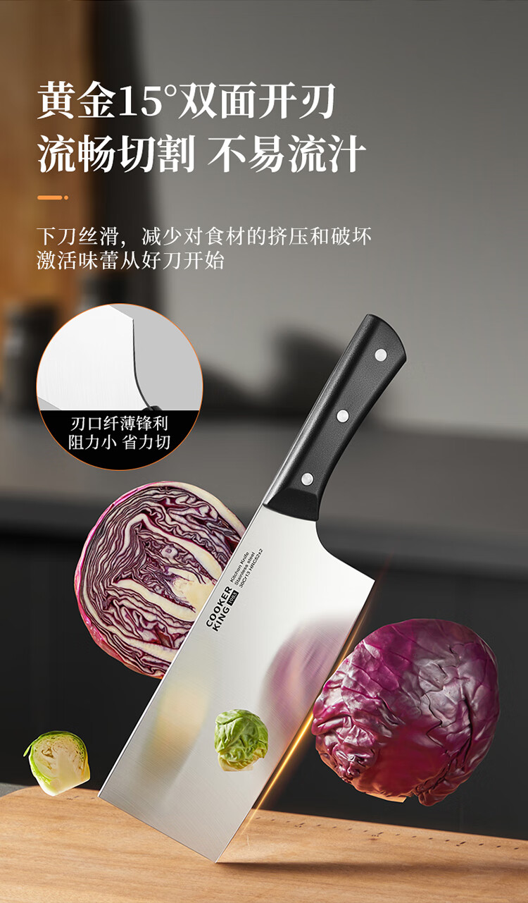 厨房切配好帮手,切拉划削轻松自如。;甄选30Cr13钢材科学配比 持久锋利。;天然榉木刀座通风透气不易发霉。