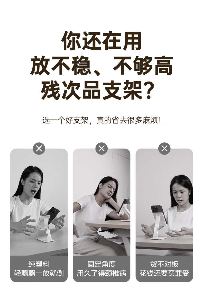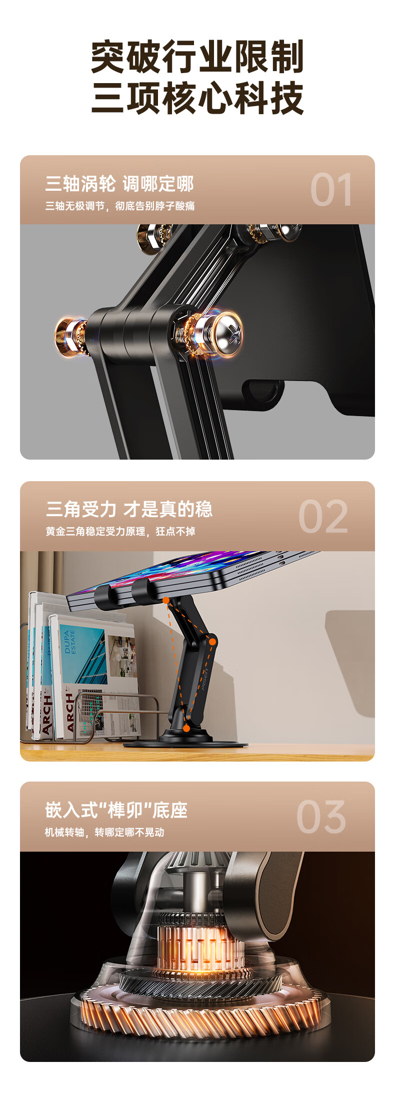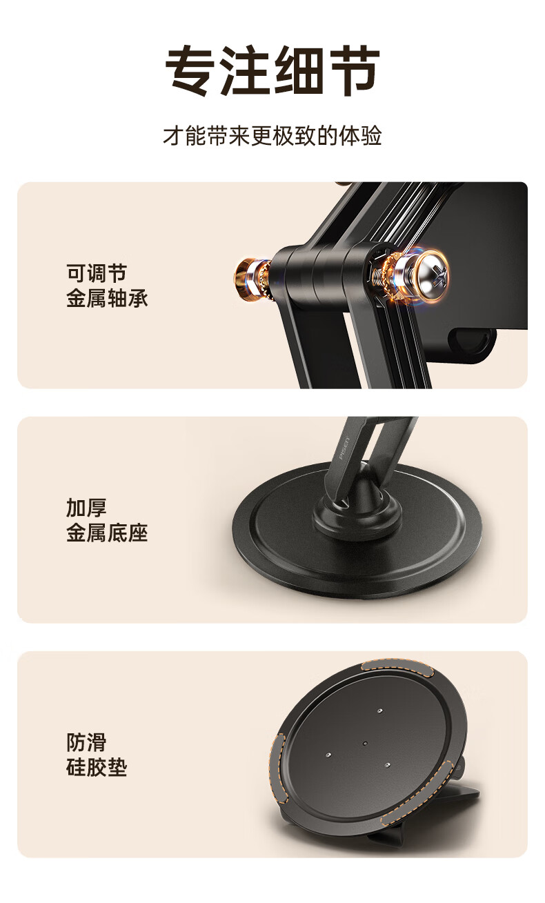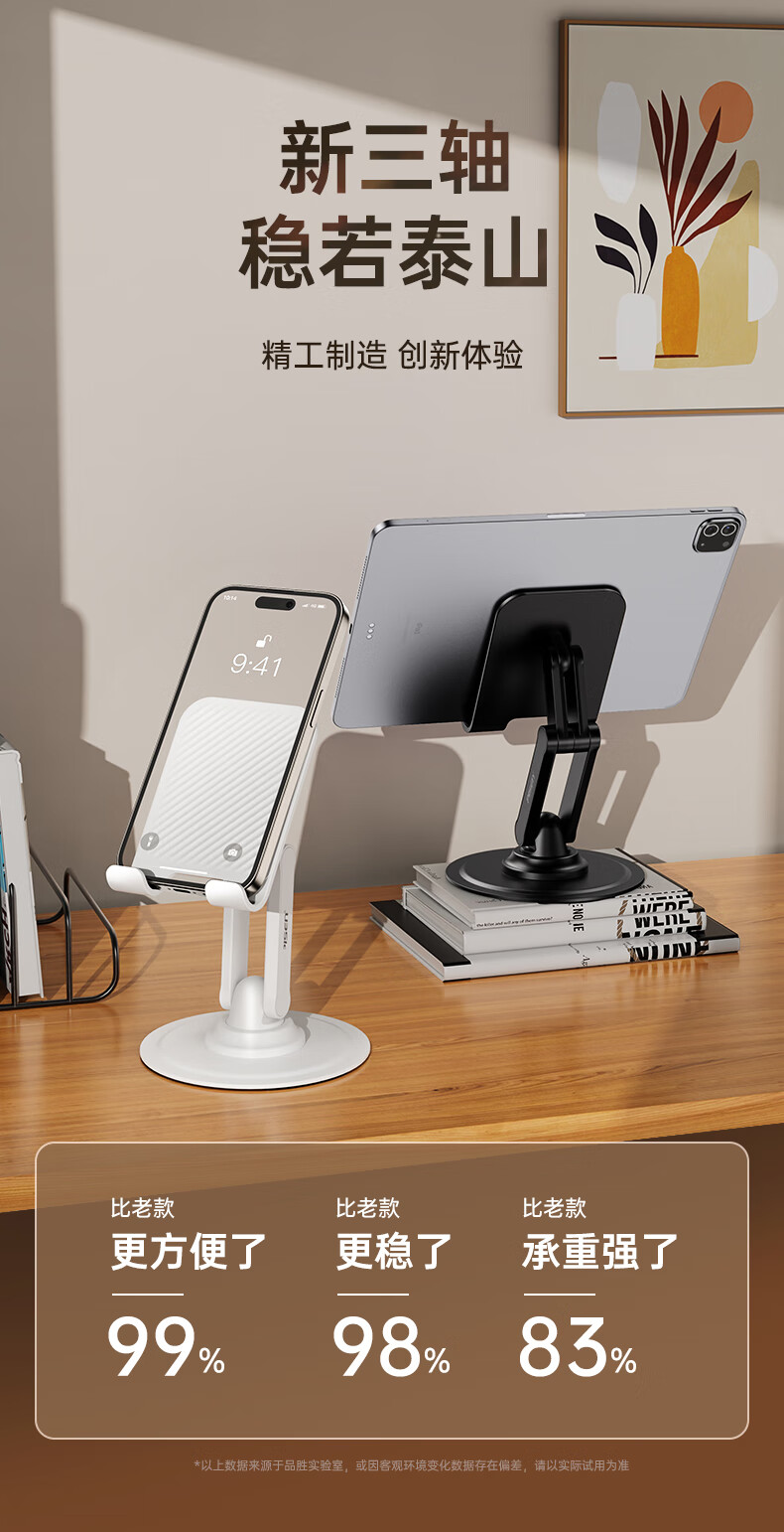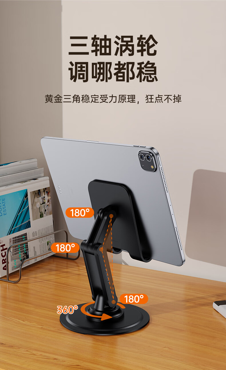 三轴联动双杆支撑多变化;360度旋转角度自由转动;嵌入式底座咬合不晃动