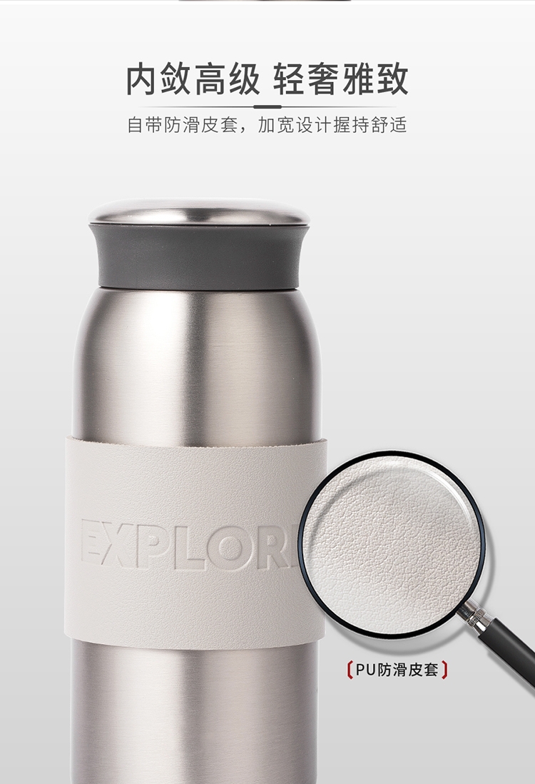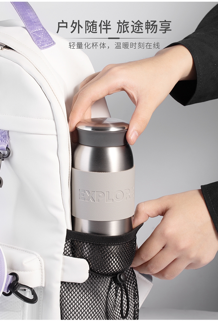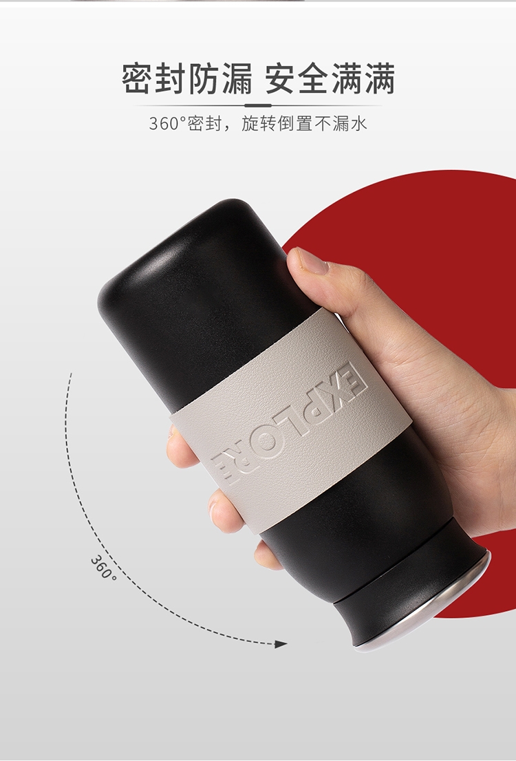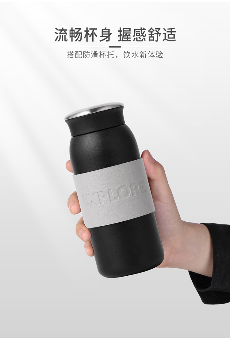 316不锈钢内胆,真空锁温工艺,保温保冷双效出色;配备PU杯套,握持舒适,杯身简约大气;360mL黄金容量,出行更轻便。