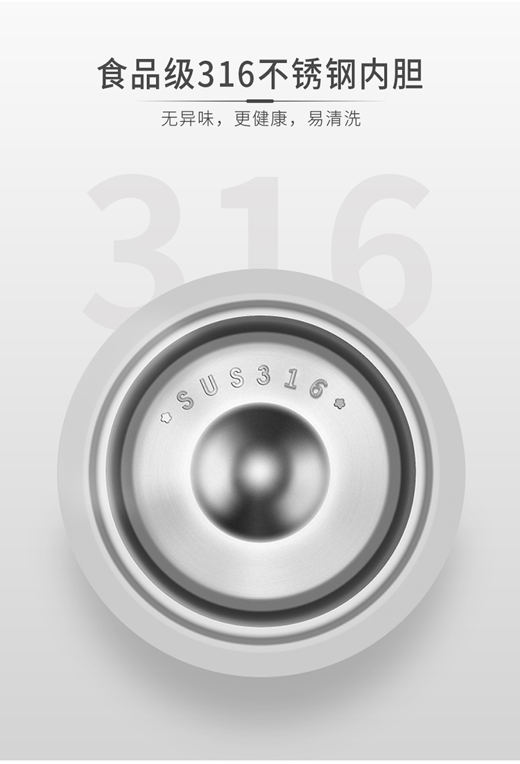 材质:内 胆:316不锈钢 , 外壳:304不锈钢 上 盖: PP+304不锈钢 密封圈: 硅胶 杯 套: PU