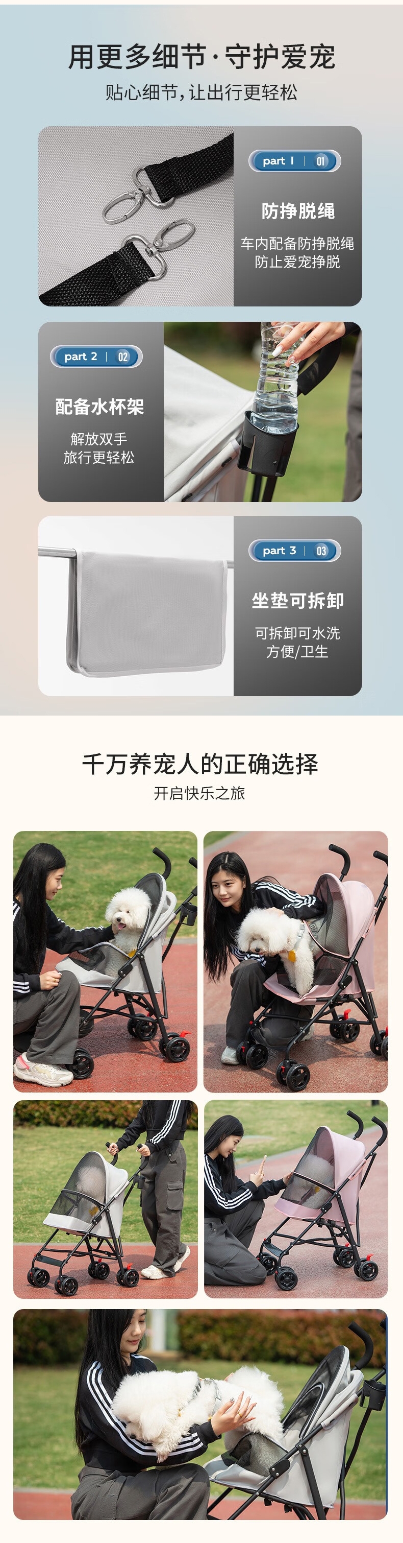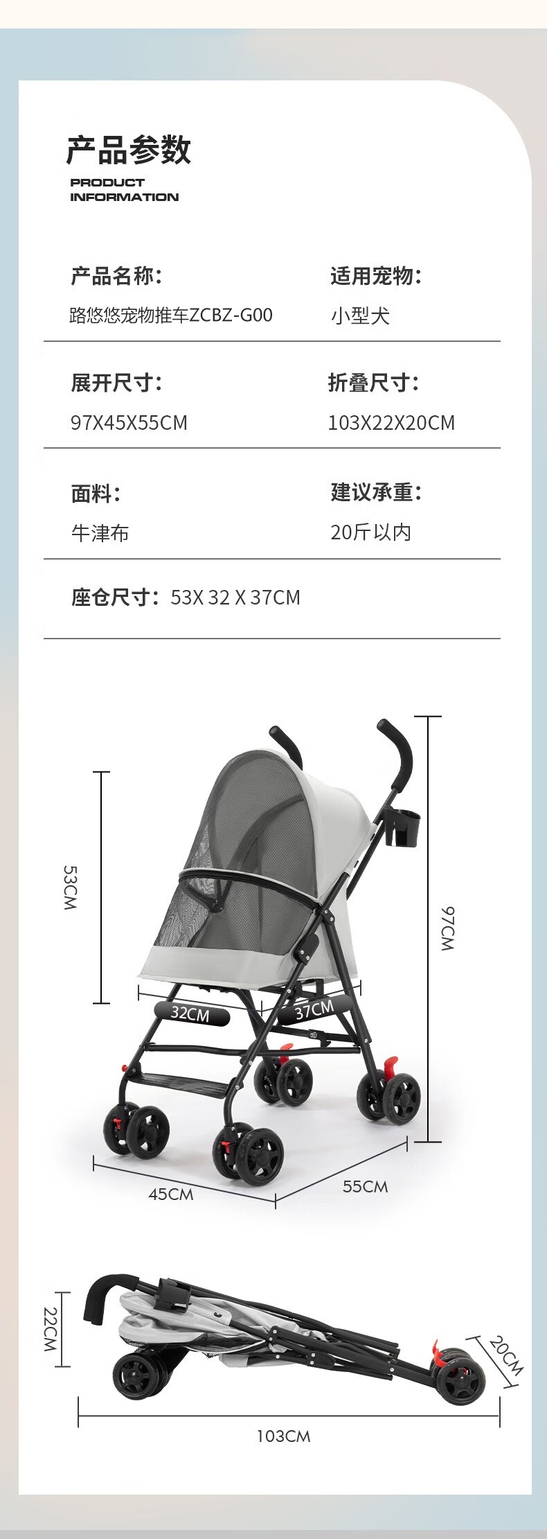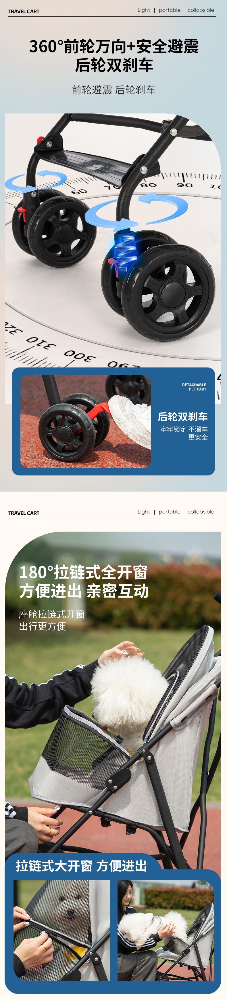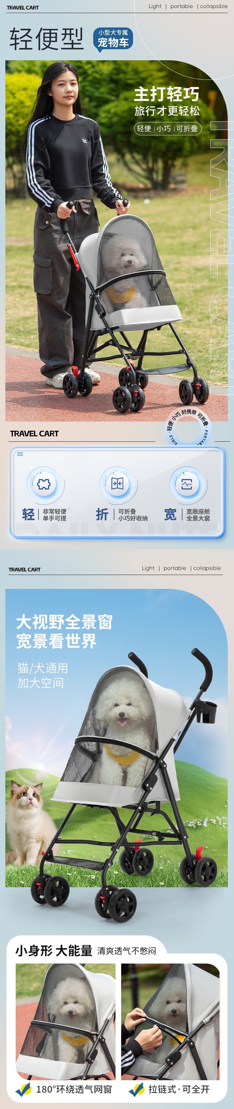 1轻便折叠设计,单手收合畅行商场 2全景透气天窗+;3大容量储物篮,解放主人双手 4加厚钢架结构 持久;5可拆洗布套,卫生打理无忧