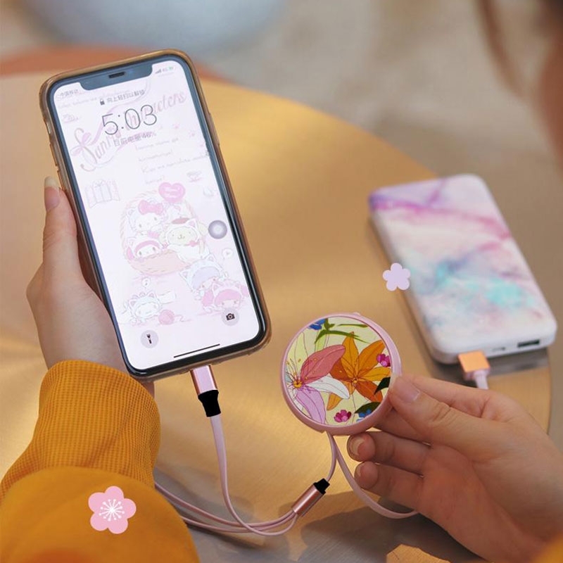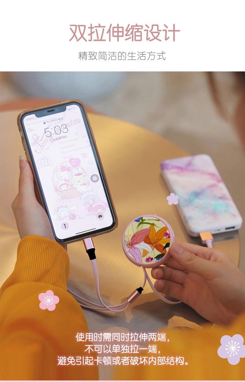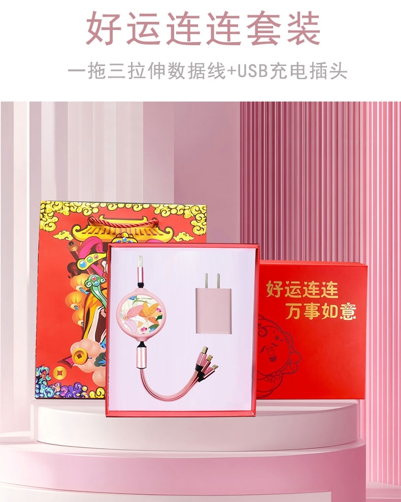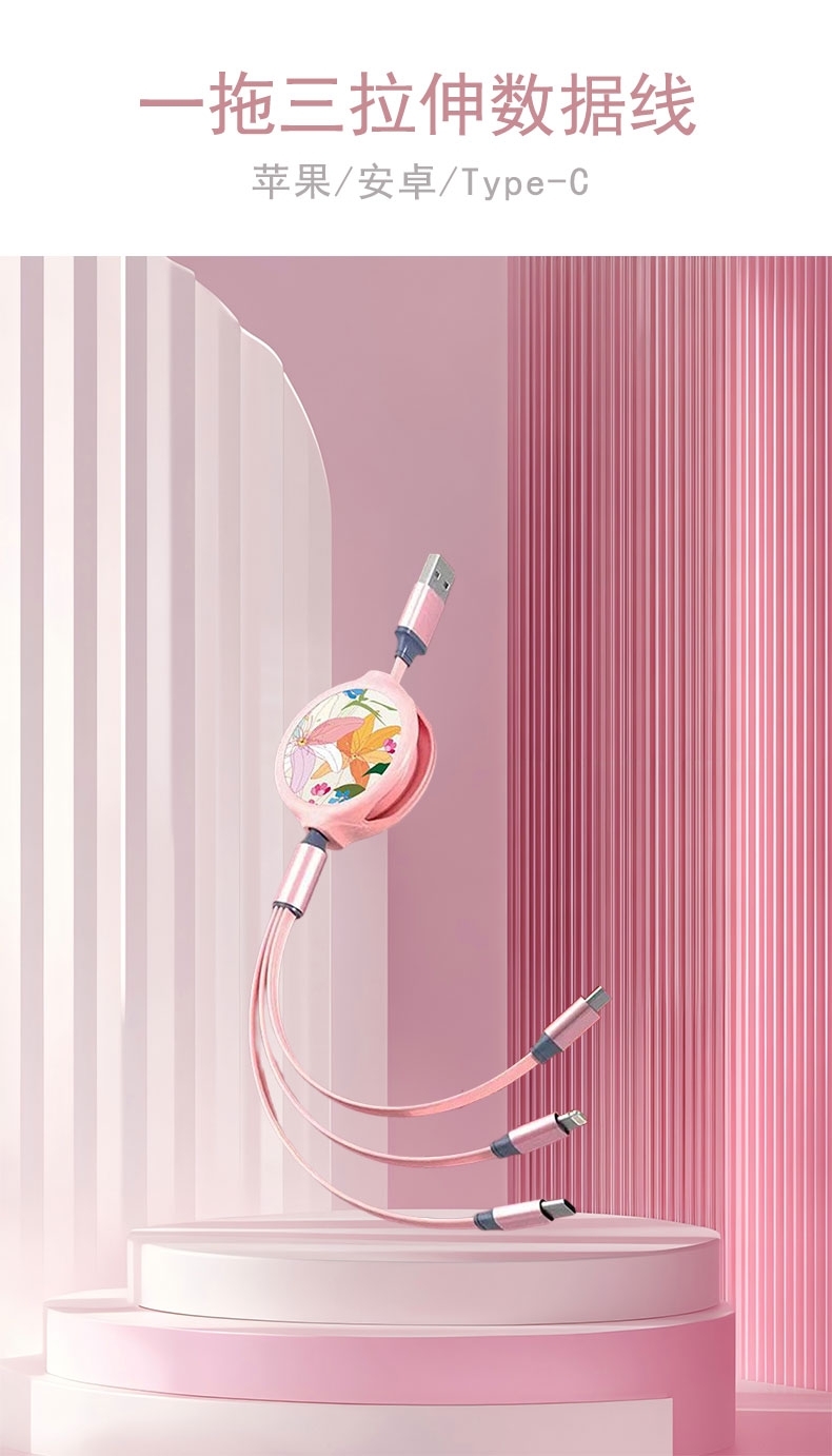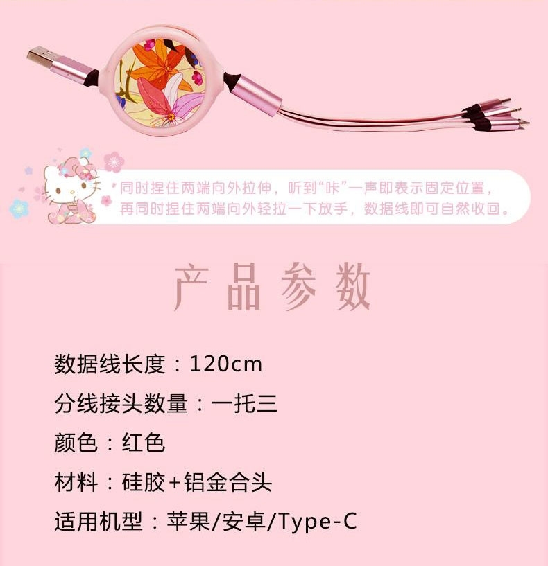 配置清单:粉色一拖三拉伸数据线一条, 粉色插头一个。
