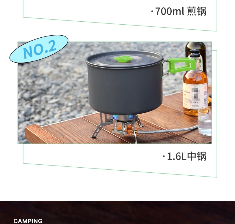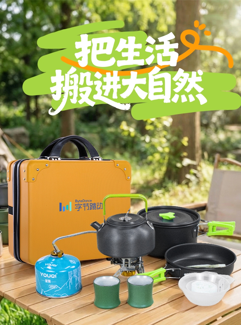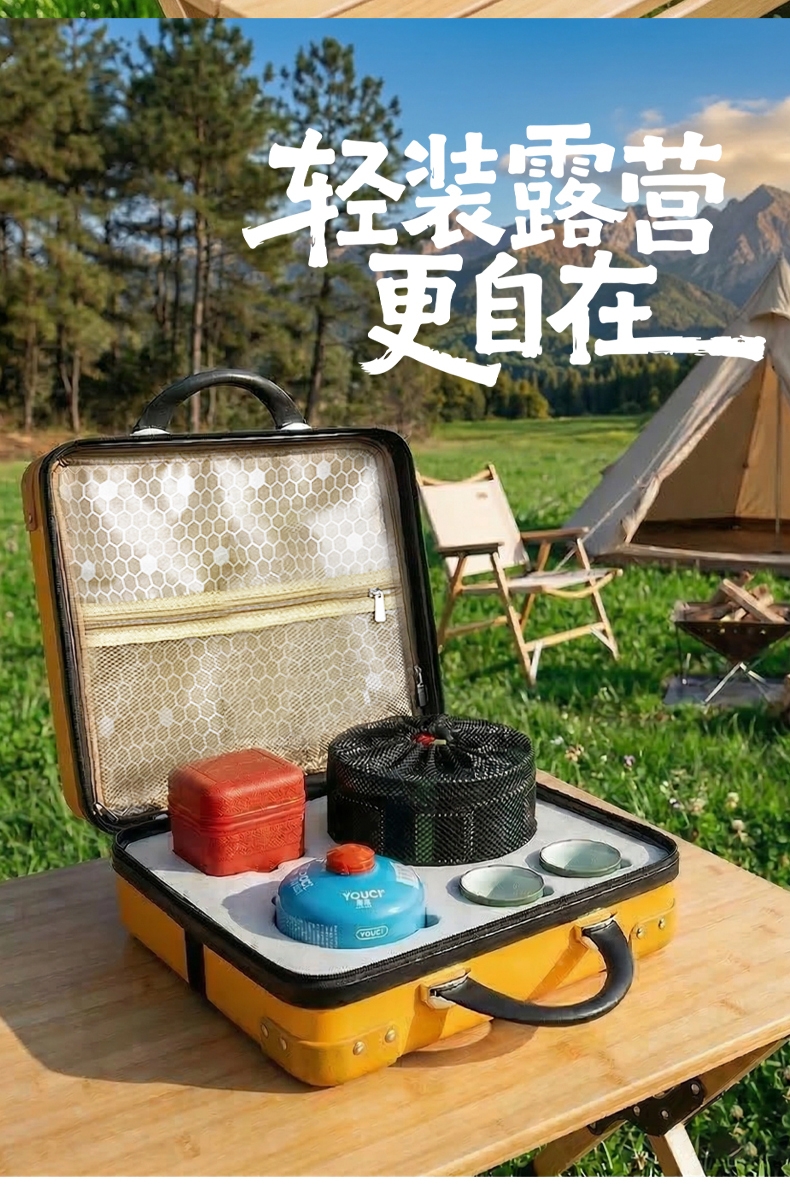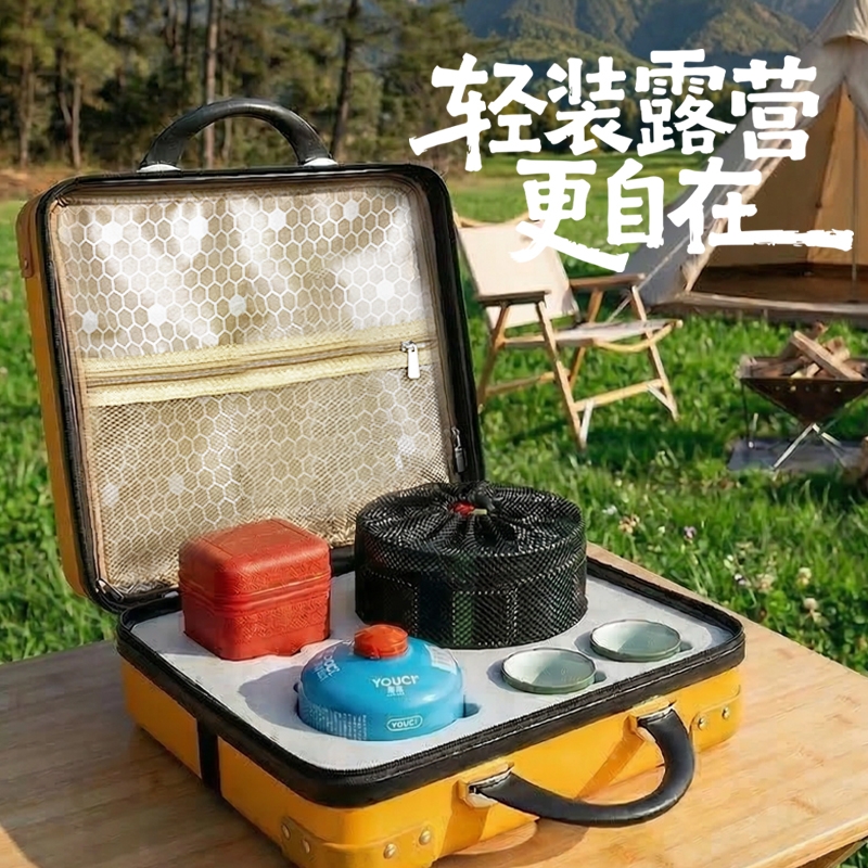 全套露营炊具套装,一站式搞定户外烹饪;便携硬壳收纳箱,拎包即走,轻松出行;耐高温不粘材质,明火直烧更安心