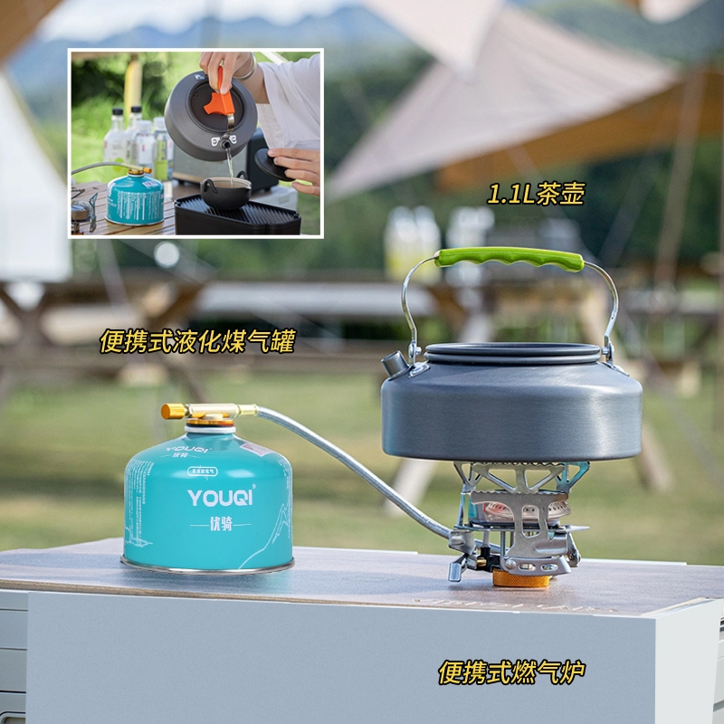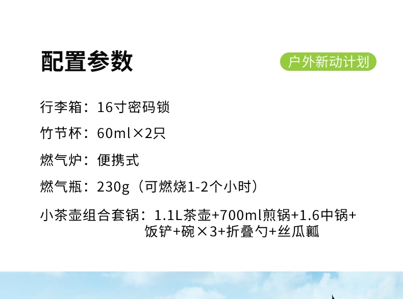 配置清单:密码锁行李箱:16寸+竹节杯:60ml×2只+燃气炉:便携式+燃气瓶:230g(可燃烧1~2个小时)+小茶壶组合套锅:1.1L茶壶+700ml煎锅+1.6L中锅+饭铲+碗×3只+折叠勺+丝瓜瓤