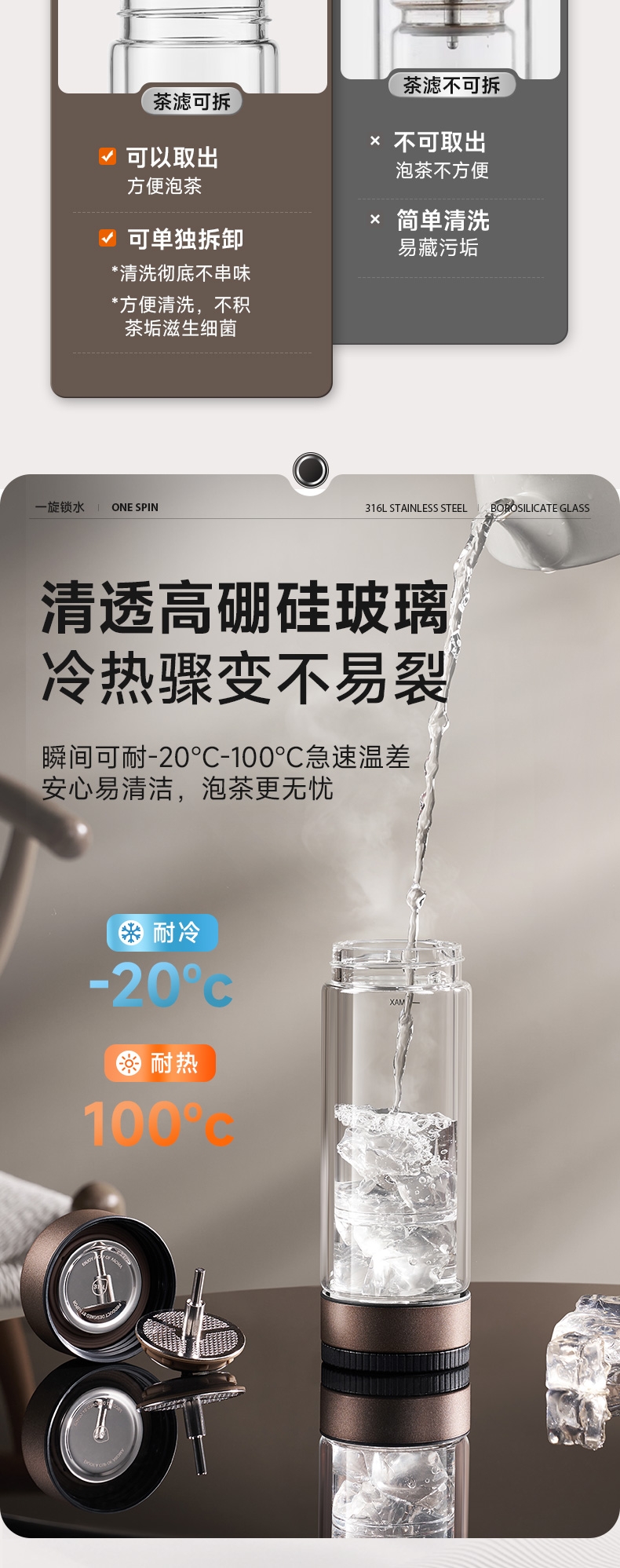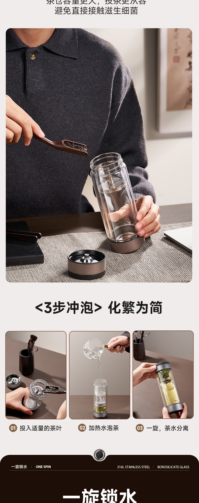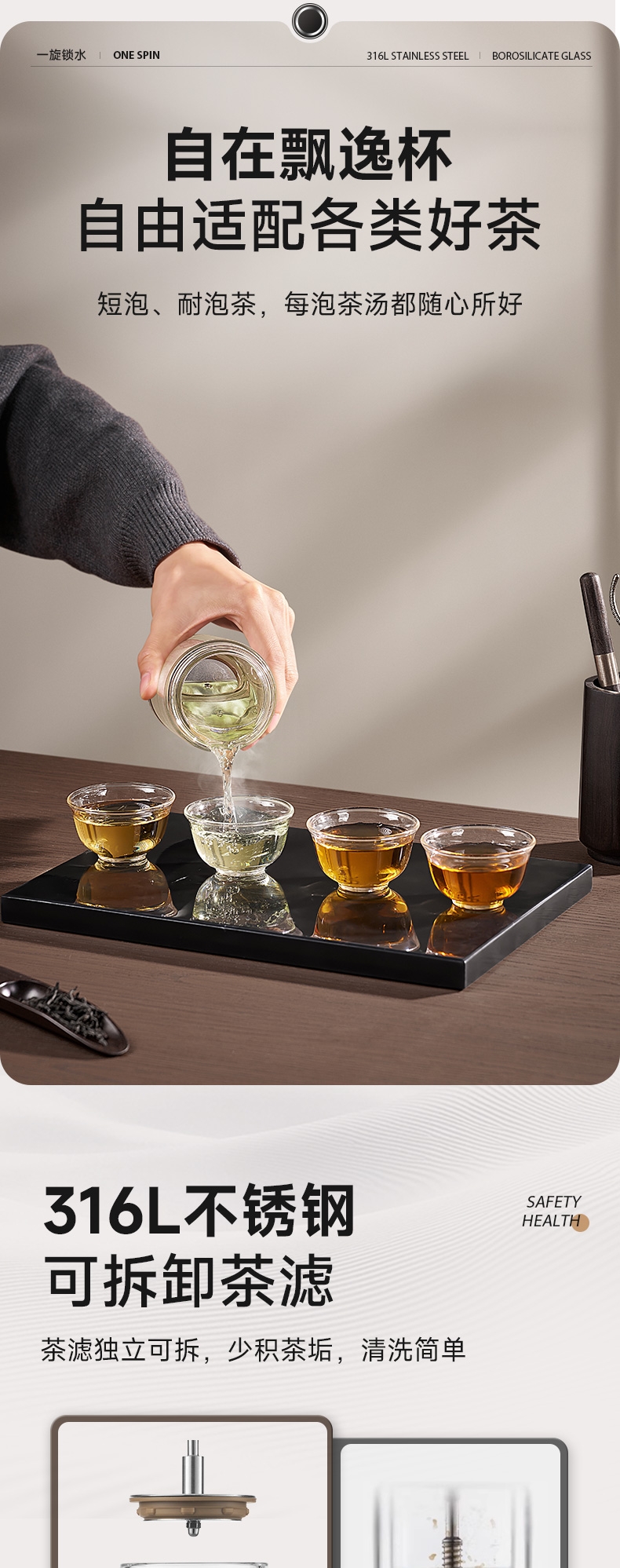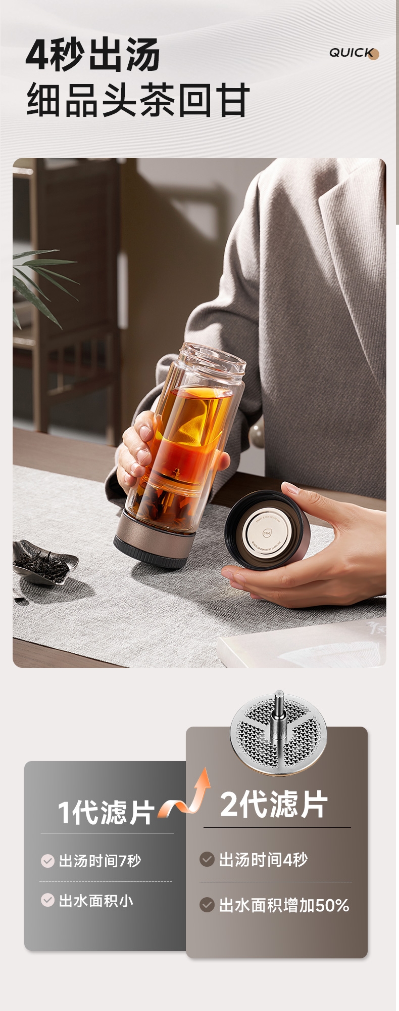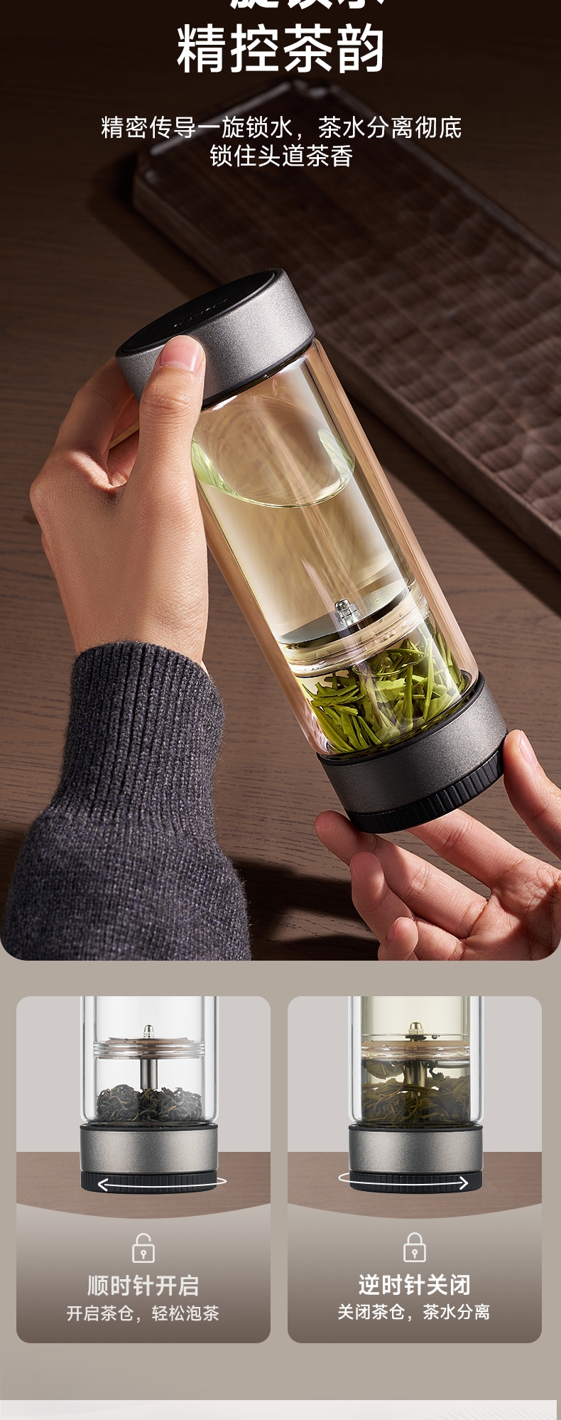 双仓设计,一旋茶水分离;茶滤可拆易清洁 4秒极速出水,好茶不用等;底盖设计:耐脏易清洁 顶盖设计:塑件触底,轻音设计