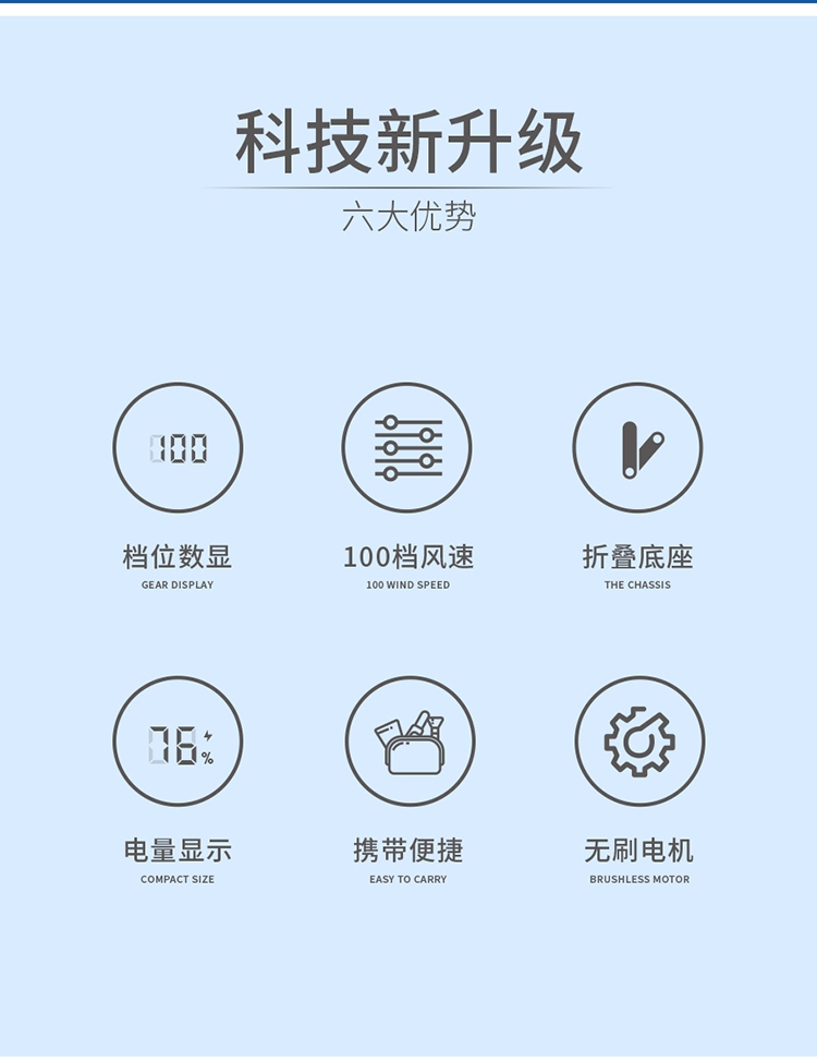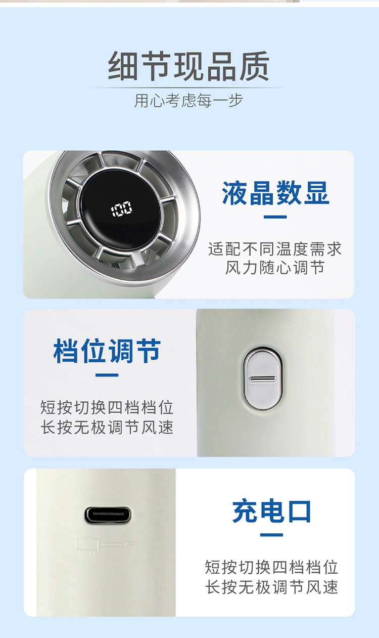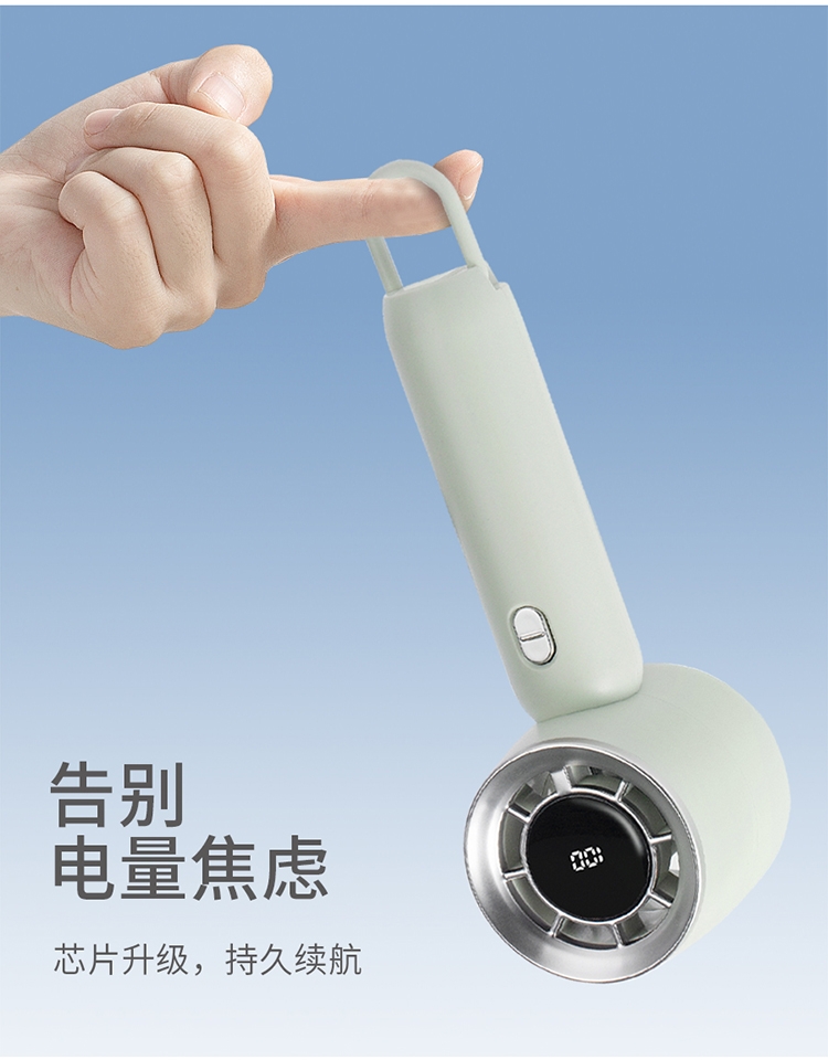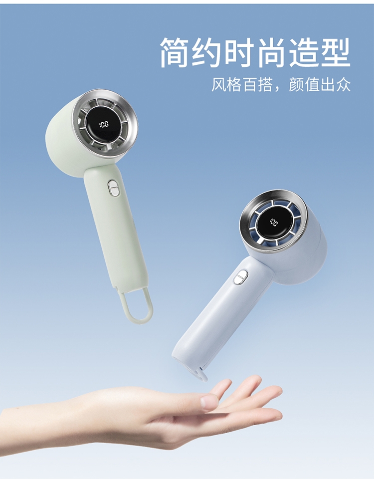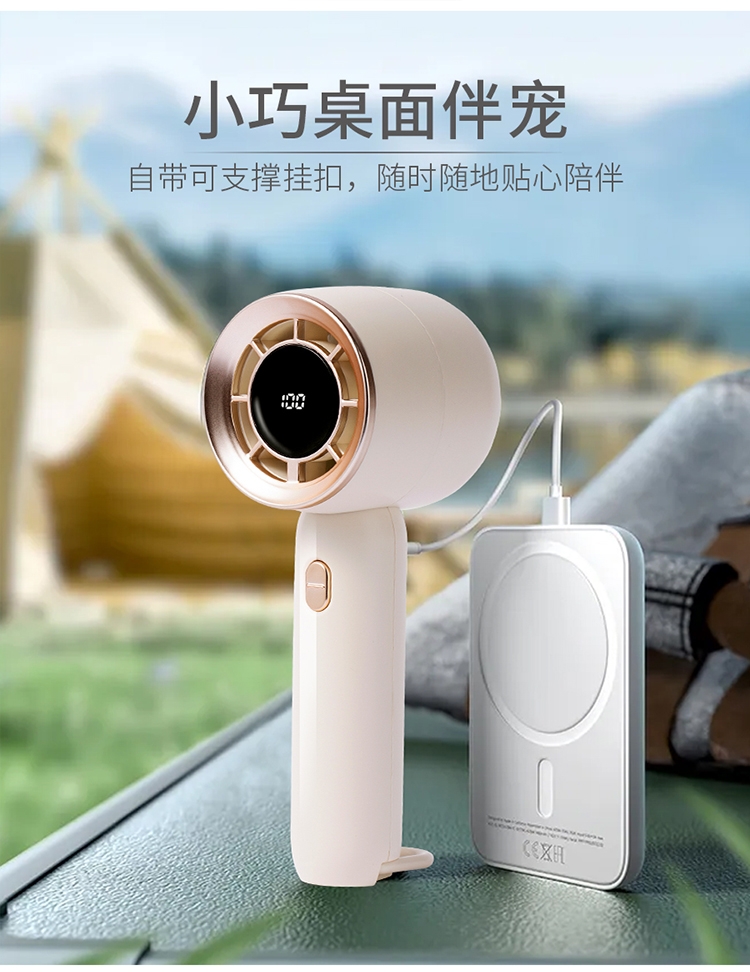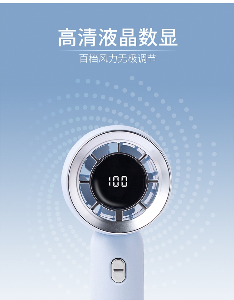 高品质无刷电机,拟真自然风,百档强劲风力无极调节。;清晰液晶数显,小巧便携,持久续航。;自带多用底座,可手持、可置于桌面。
