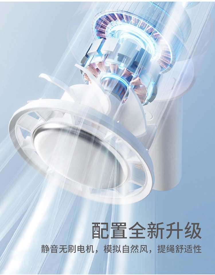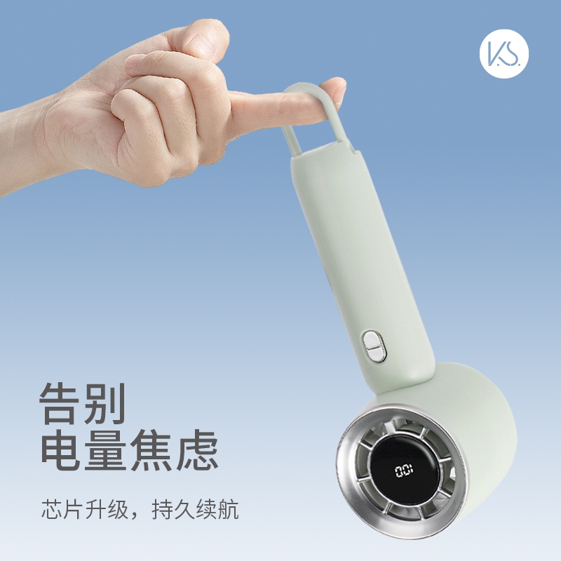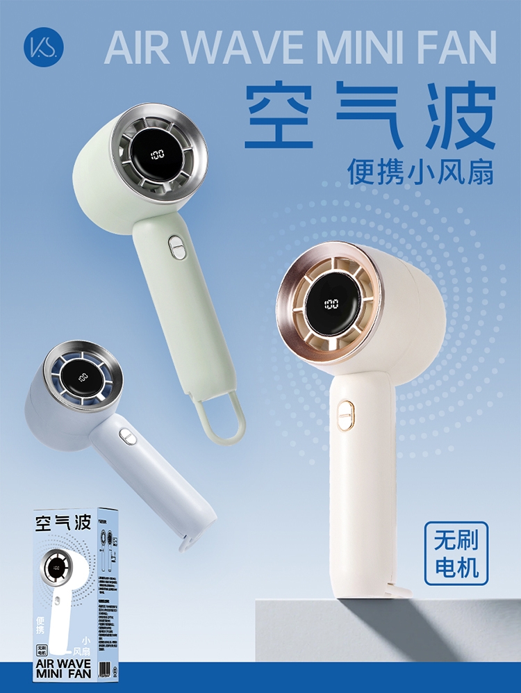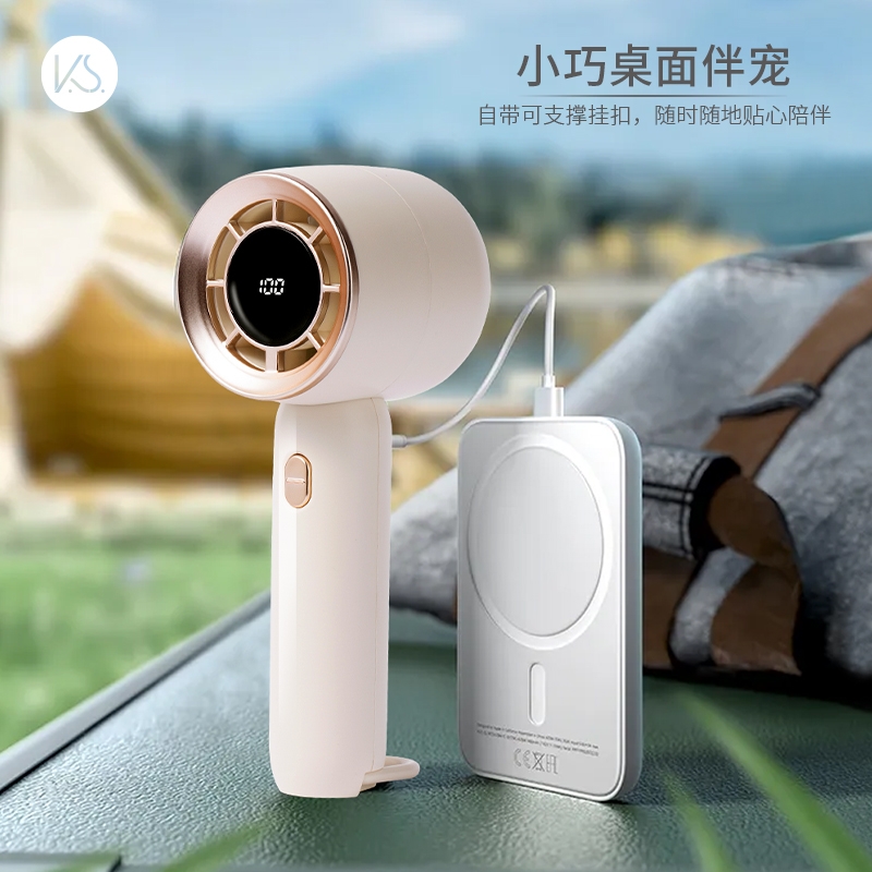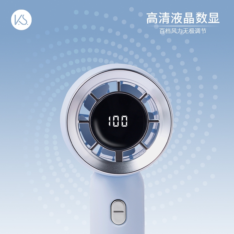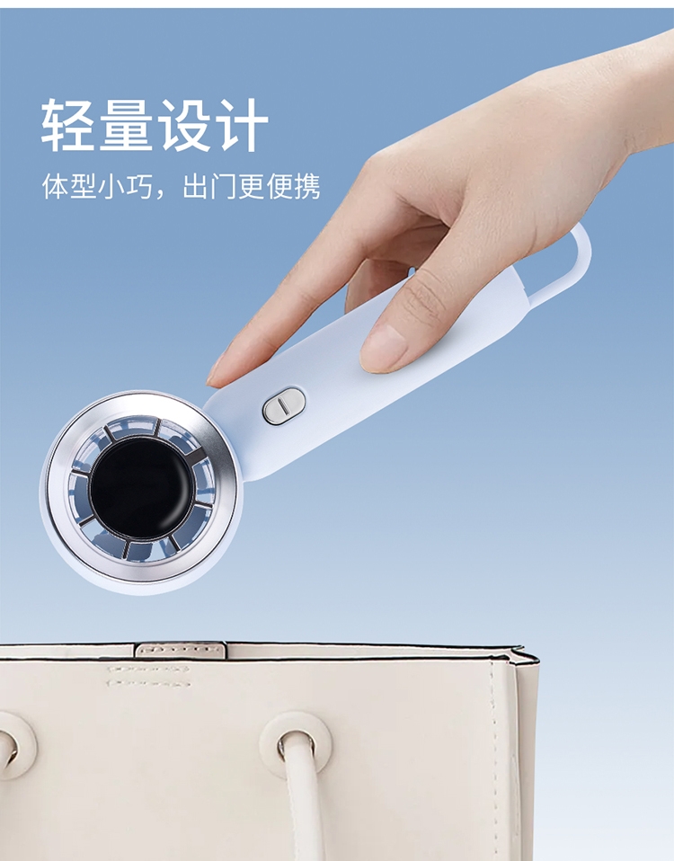 高品质无刷电机,拟真自然风,百档强劲风力无极调节。;清晰液晶数显,小巧便携,持久续航。;自带多用底座,可手持、可置于桌面。