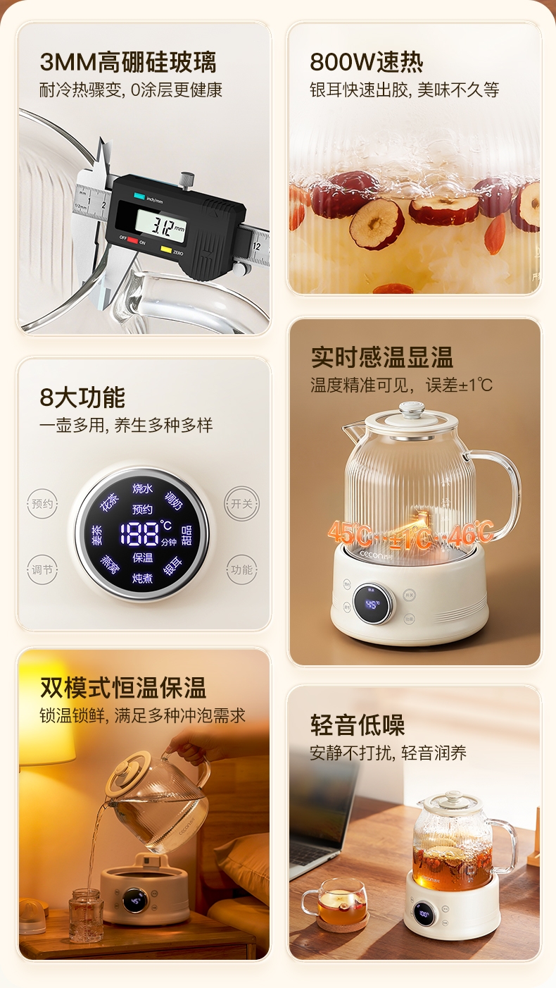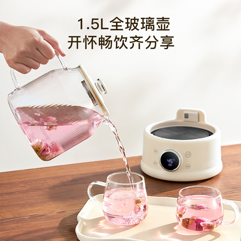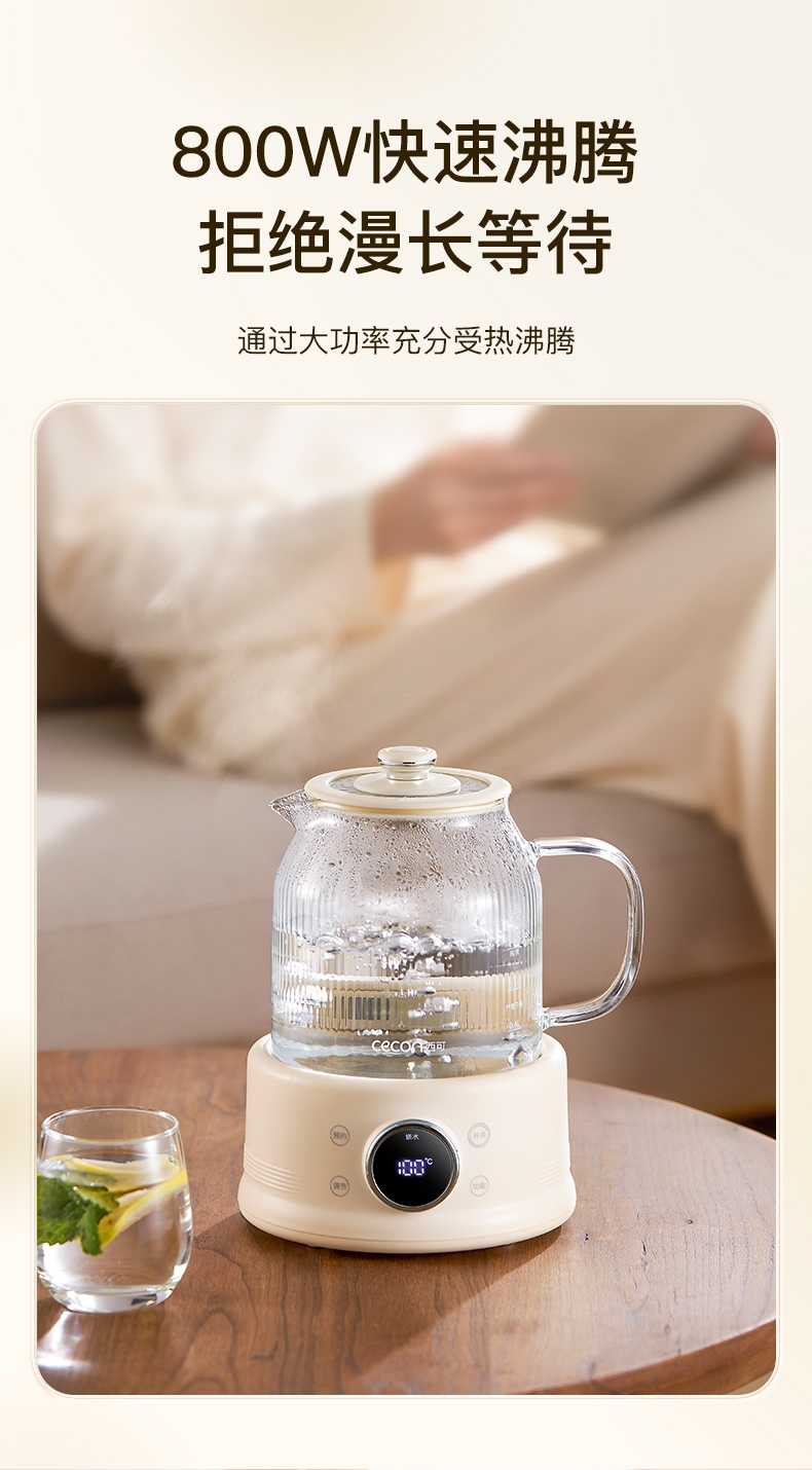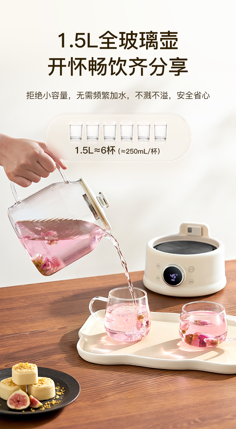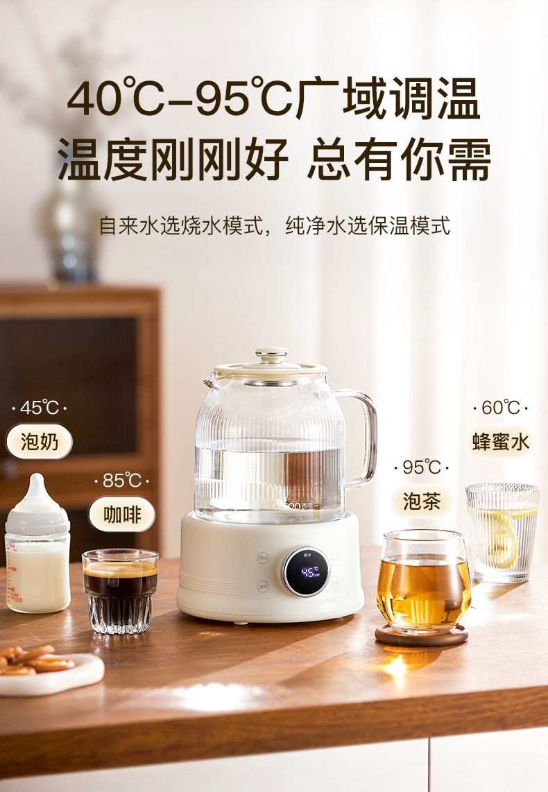 高硼硅玻璃水电分离壶体,不结水垢,一体成型零胶水,;1.5L大容量,800W快功率,烧水不久等,满足家;烧水调奶甜品银耳炖煮燕窝姜茶花茶八大功能;40-95℃每5℃可调12段控温19H预约保温;STC水温水位双感应系统带缺水保护低水位可自动断电