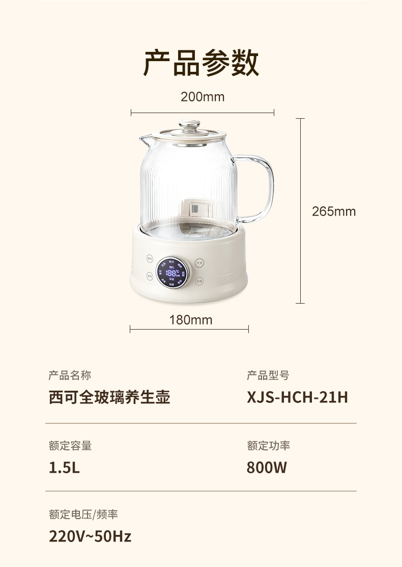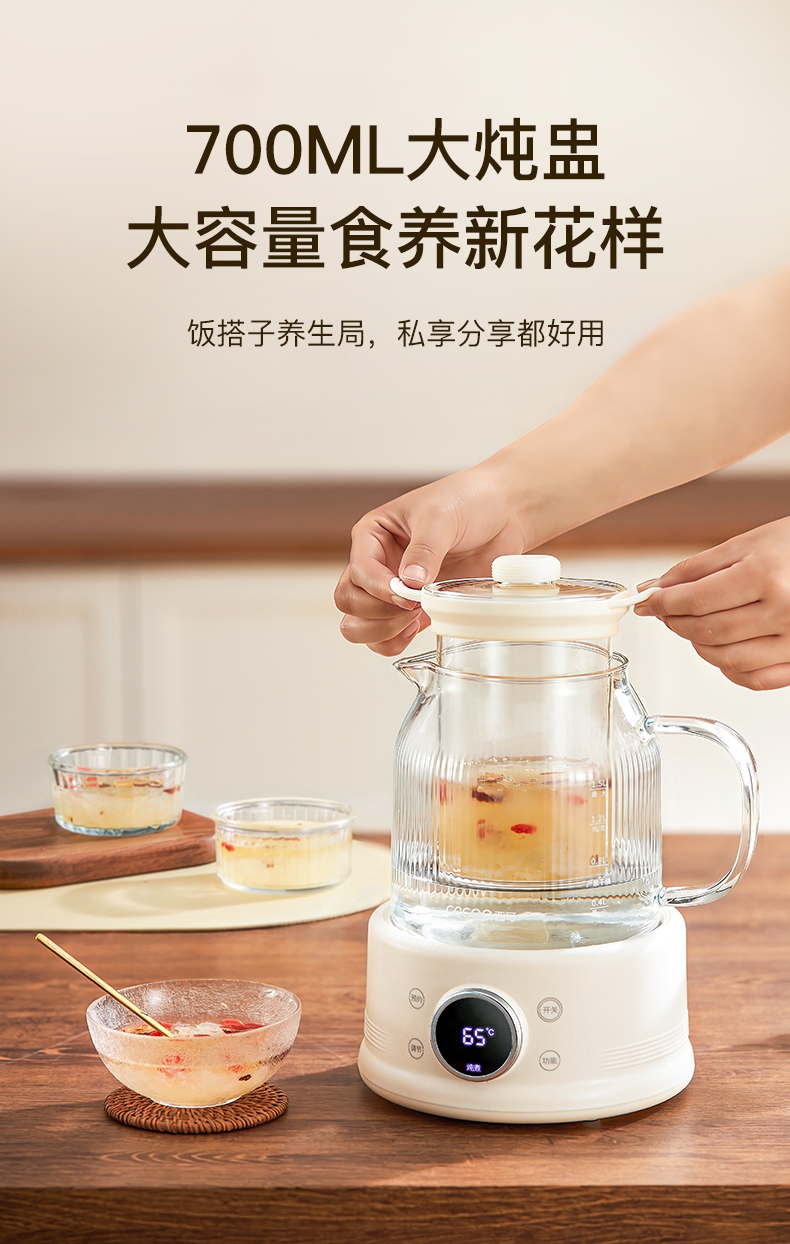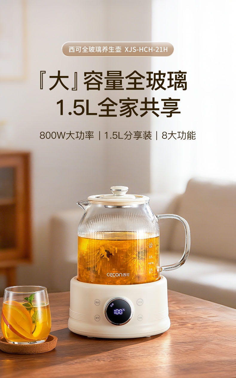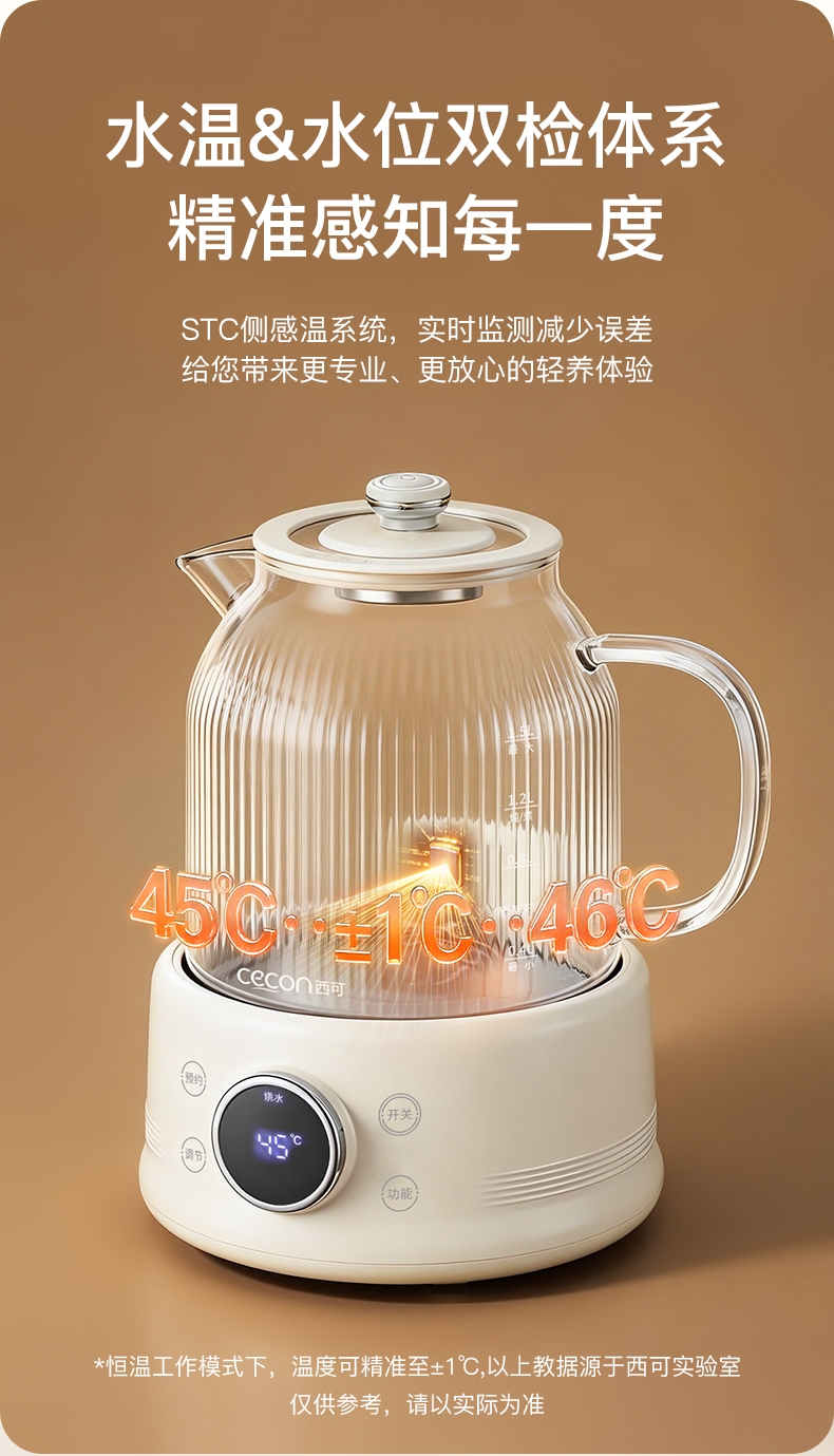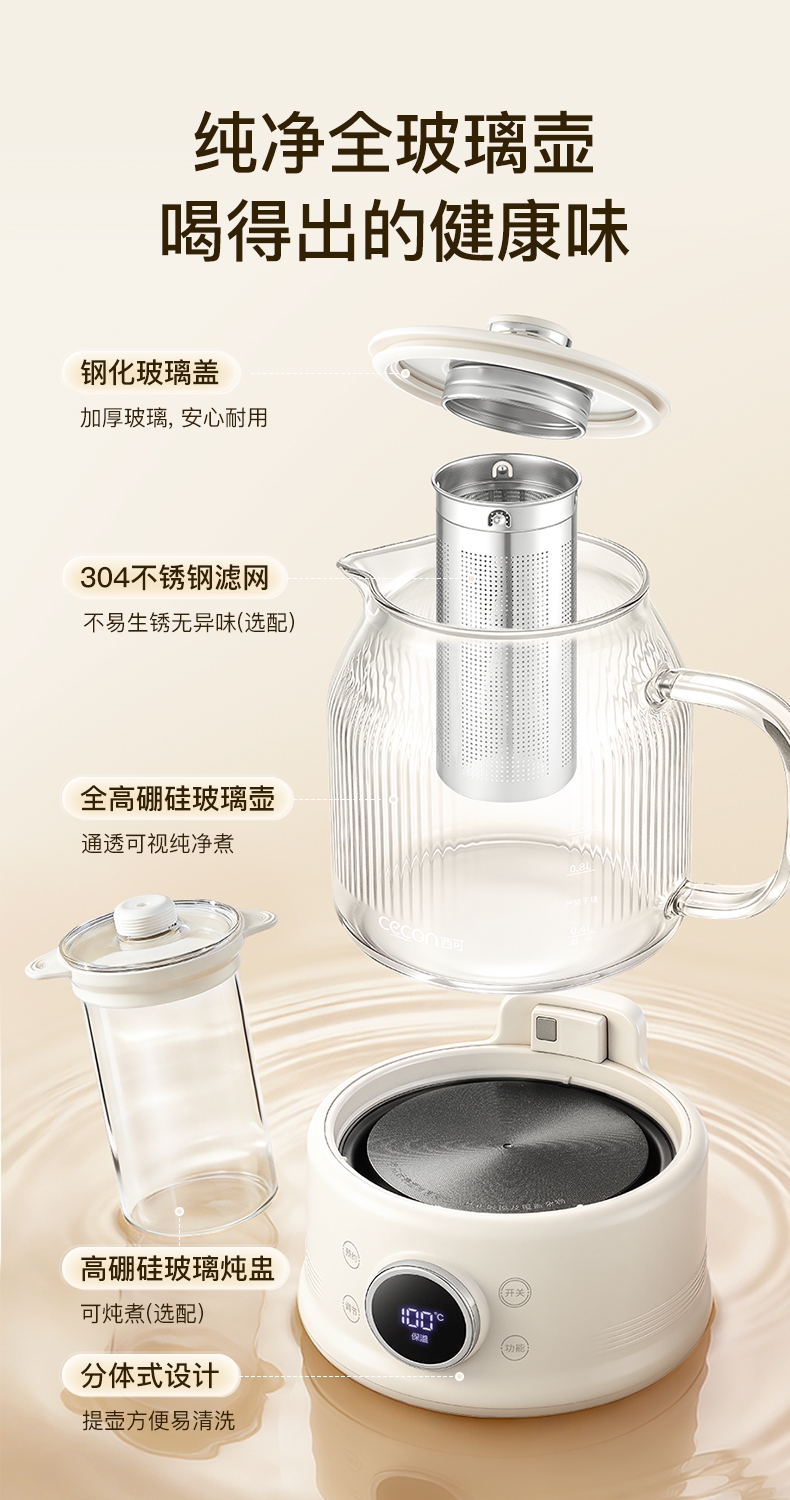 高硼硅玻璃水电分离壶体,不结水垢,一体成型零胶水,;1.5L大容量,800W快功率,烧水不久等,满足家;烧水调奶甜品银耳炖煮燕窝姜茶花茶八大功能;40-95℃每5℃可调12段控温19H预约保温;STC水温水位双感应系统带缺水保护低水位可自动断电