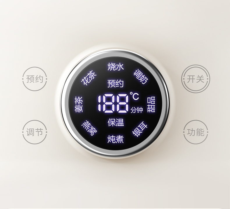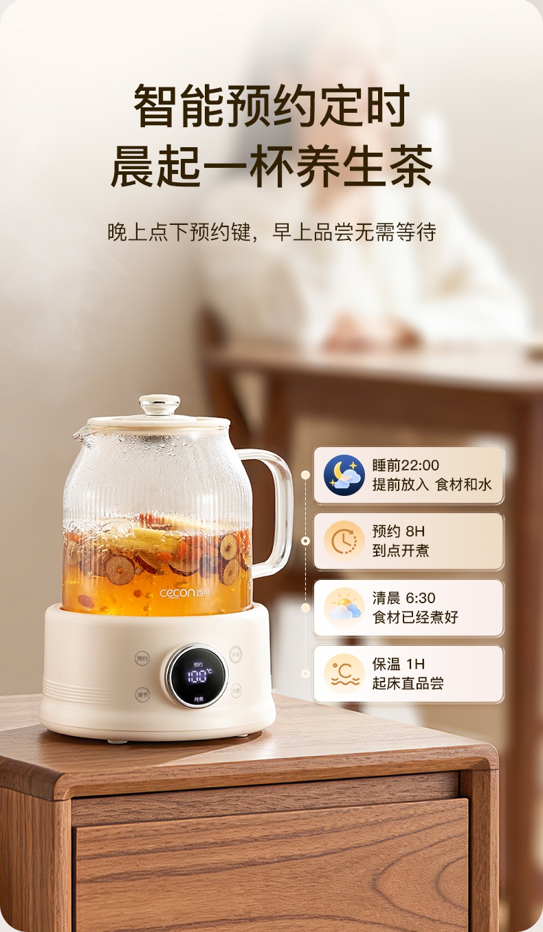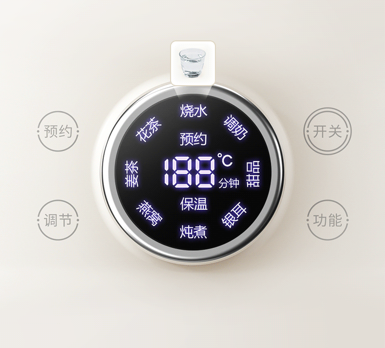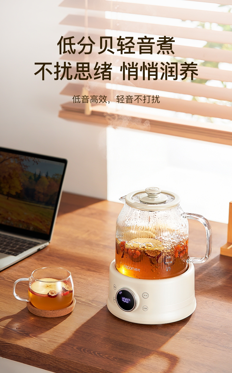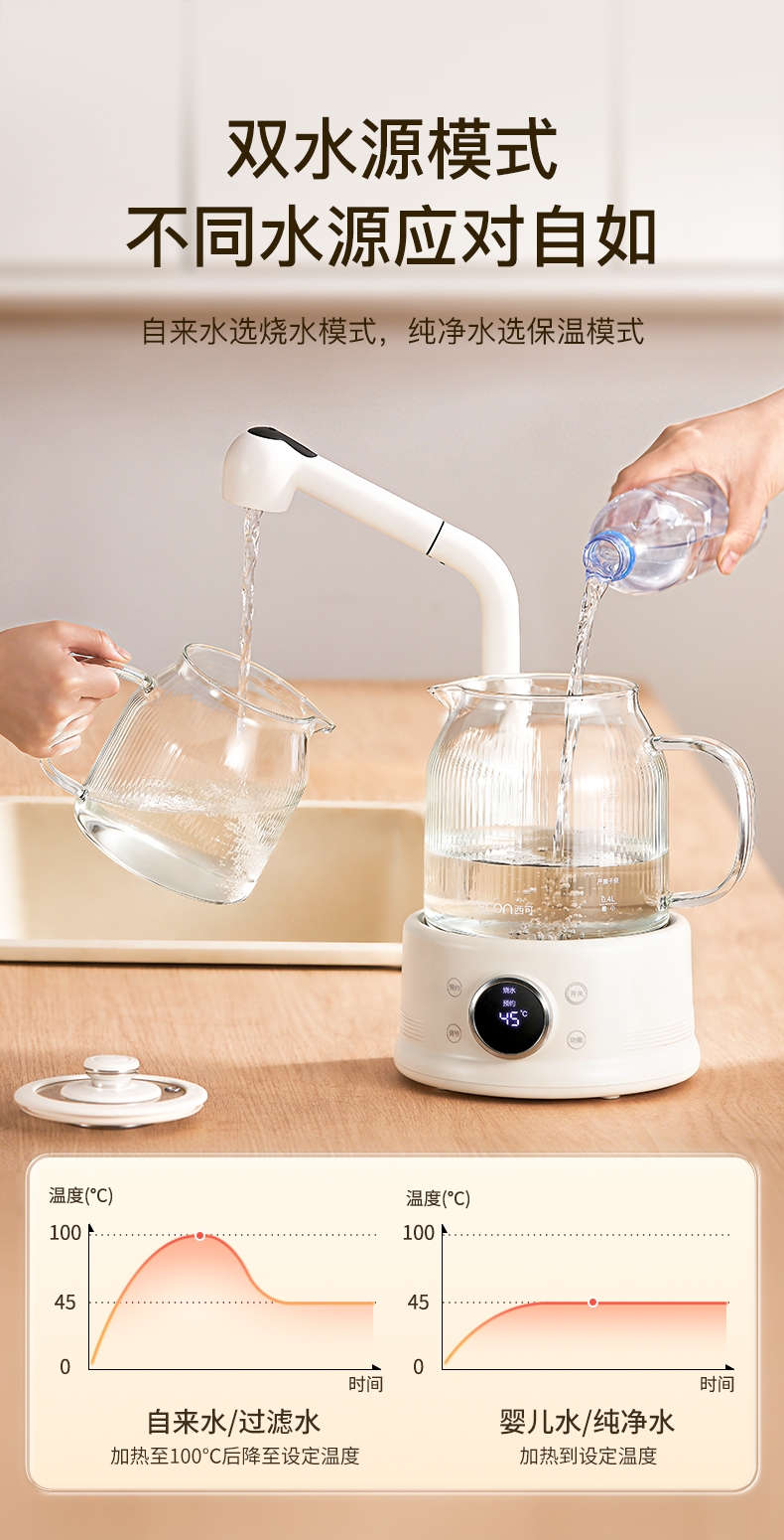 高硼硅玻璃水电分离壶体,不结水垢,一体成型零胶水,;1.5L大容量,800W快功率,烧水不久等,满足家;烧水调奶甜品银耳炖煮燕窝姜茶花茶八大功能;40-95℃每5℃可调12段控温19H预约保温;STC水温水位双感应系统带缺水保护低水位可自动断电