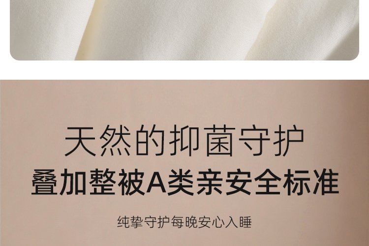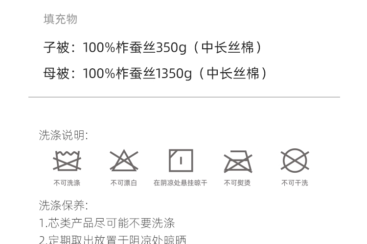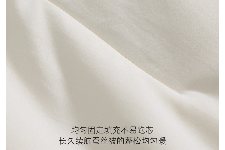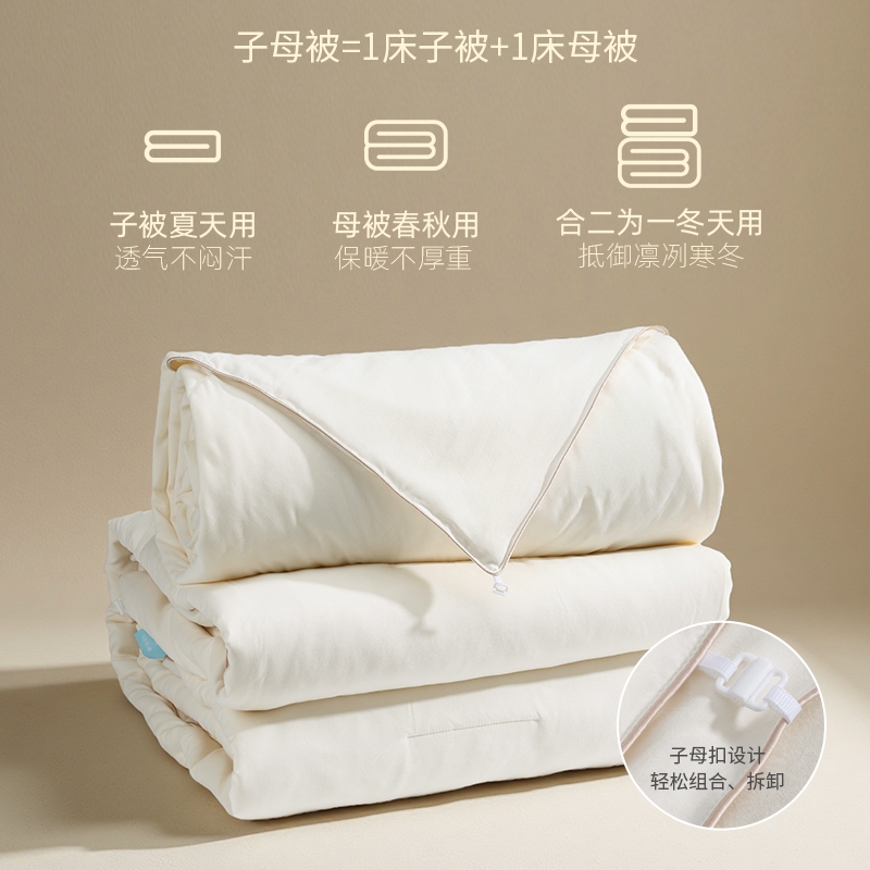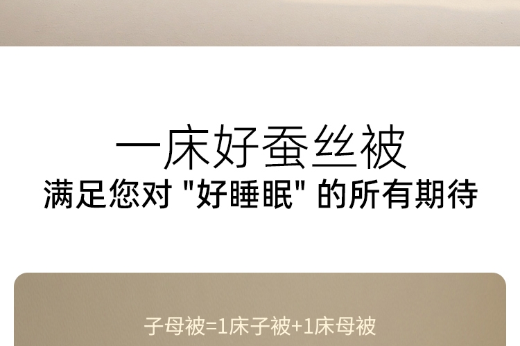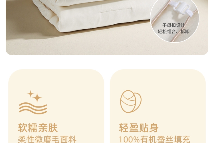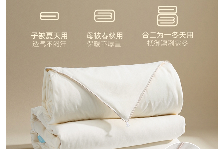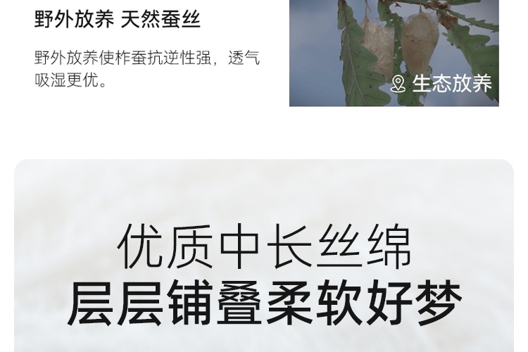 A类标准亲肤,抗菌性能加持;野生柞蚕丝,丝容间空隙大,丝长纤韧,整被均匀蓬松;子母被的设计,满足四季不同的使用需求,长久温暖陪伴