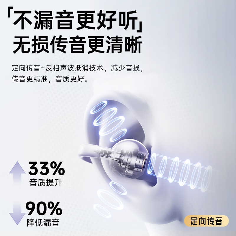 定向传音,漏音有效降低;2.8克超轻量,佩戴舒适;长效续航,配对秒连接