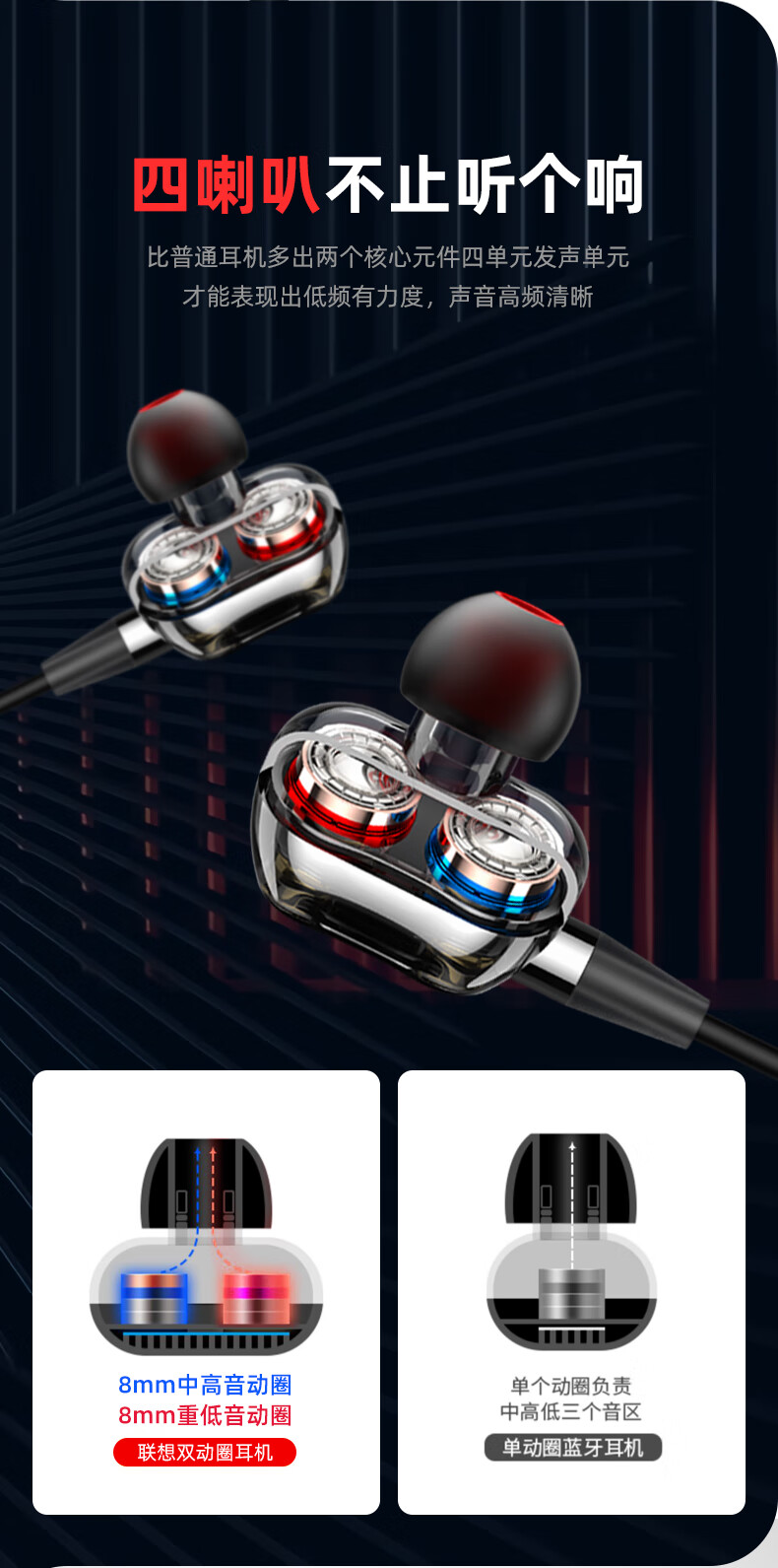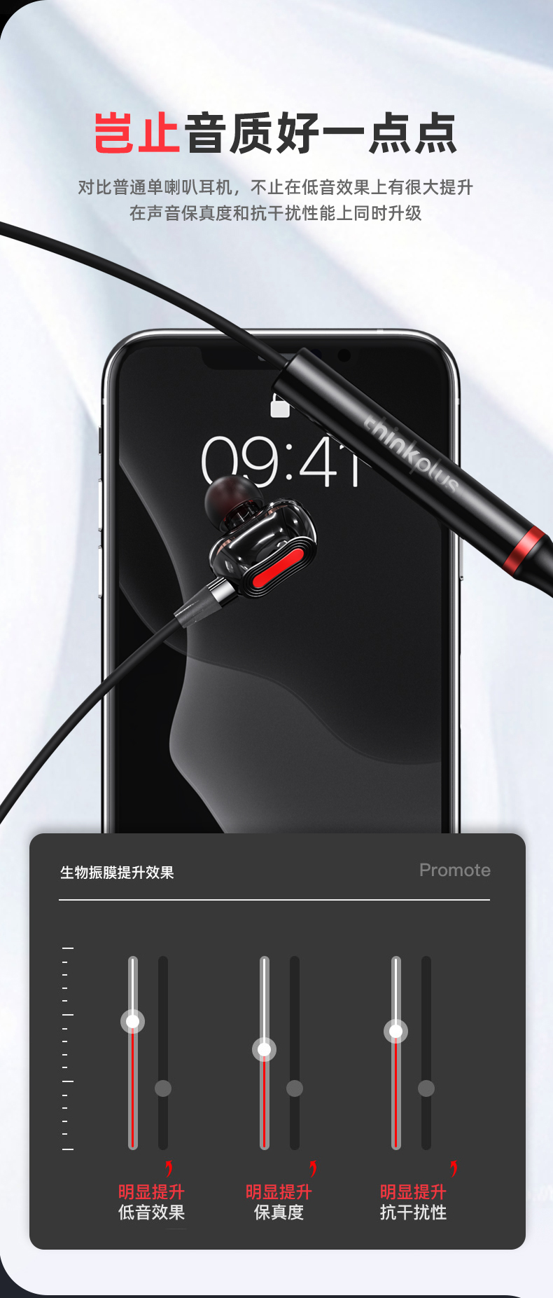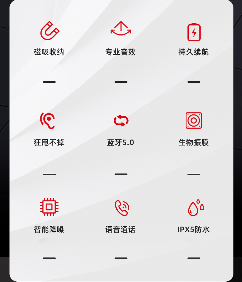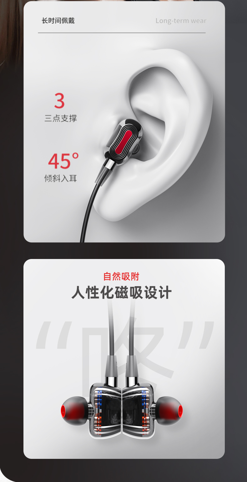科学声腔设计,生物振膜,沉浸体验;两核心单元四喇叭发声;亲肤材质人体工学挂式设计,舒适佩戴运动狂甩不掉