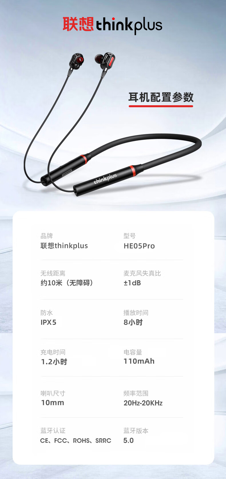 联想 运动挂脖式蓝牙耳机HE05 PRO