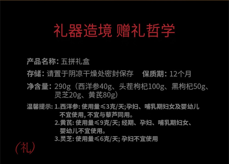配置清单:1.0-1.2cm西洋参片40g+灵芝20g+150-170粒/50g头茬红枸杞100g+牛头果黑枸杞50g+1.0-1.2cm黄芪80g ;礼盒*1;礼袋*1
